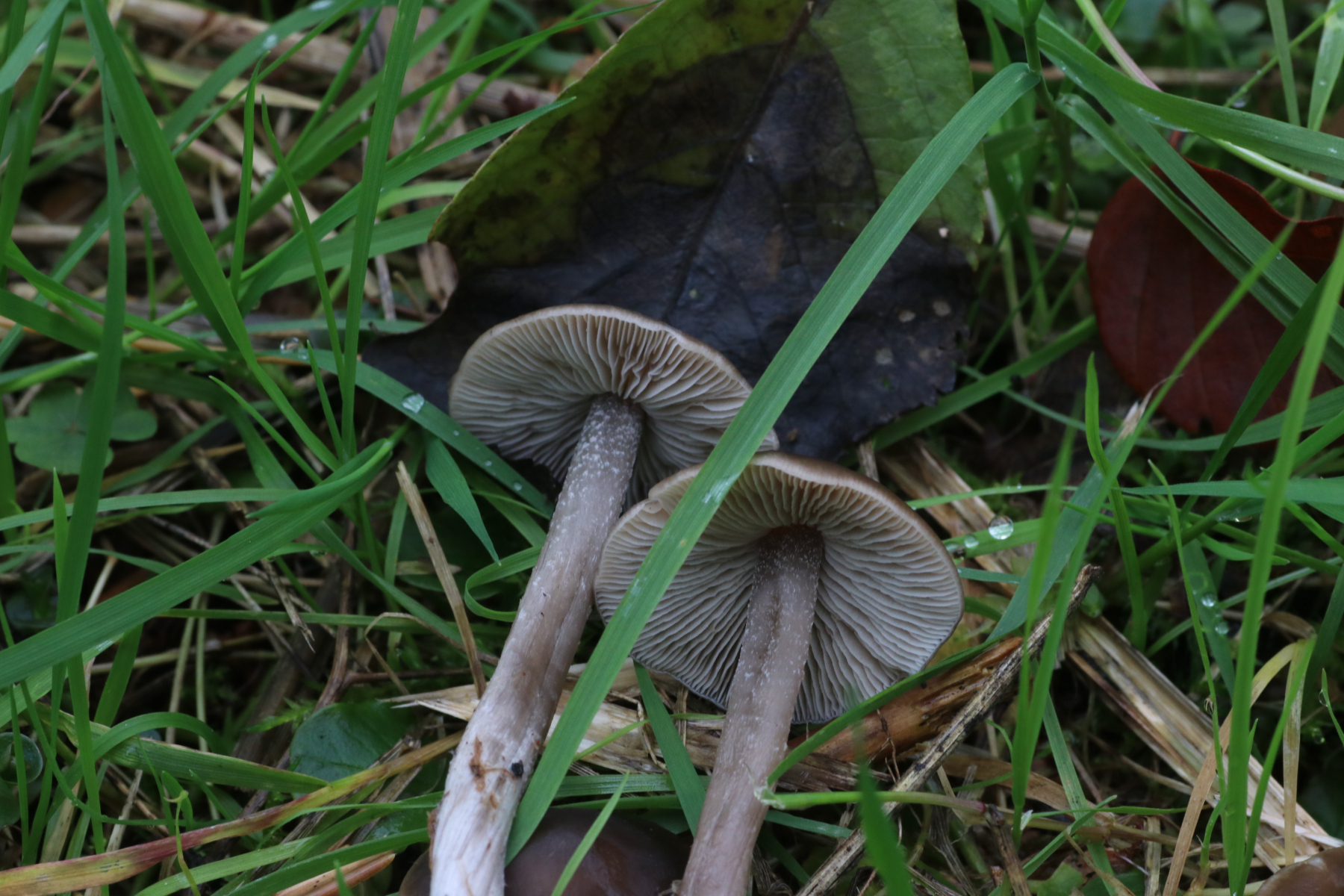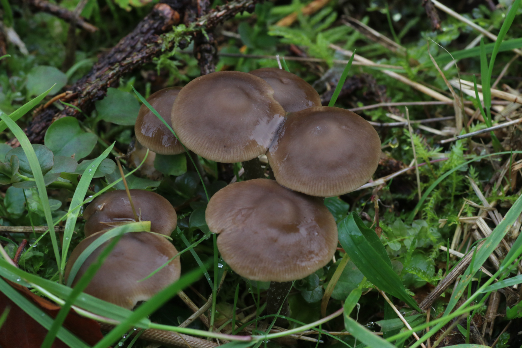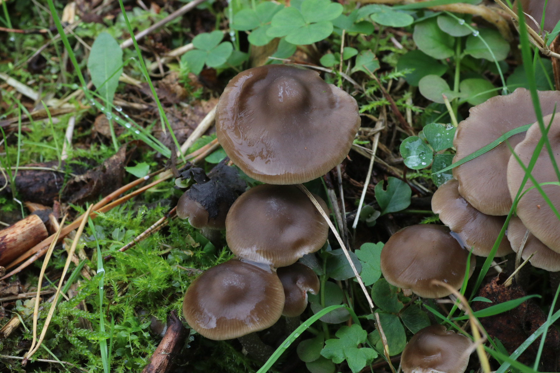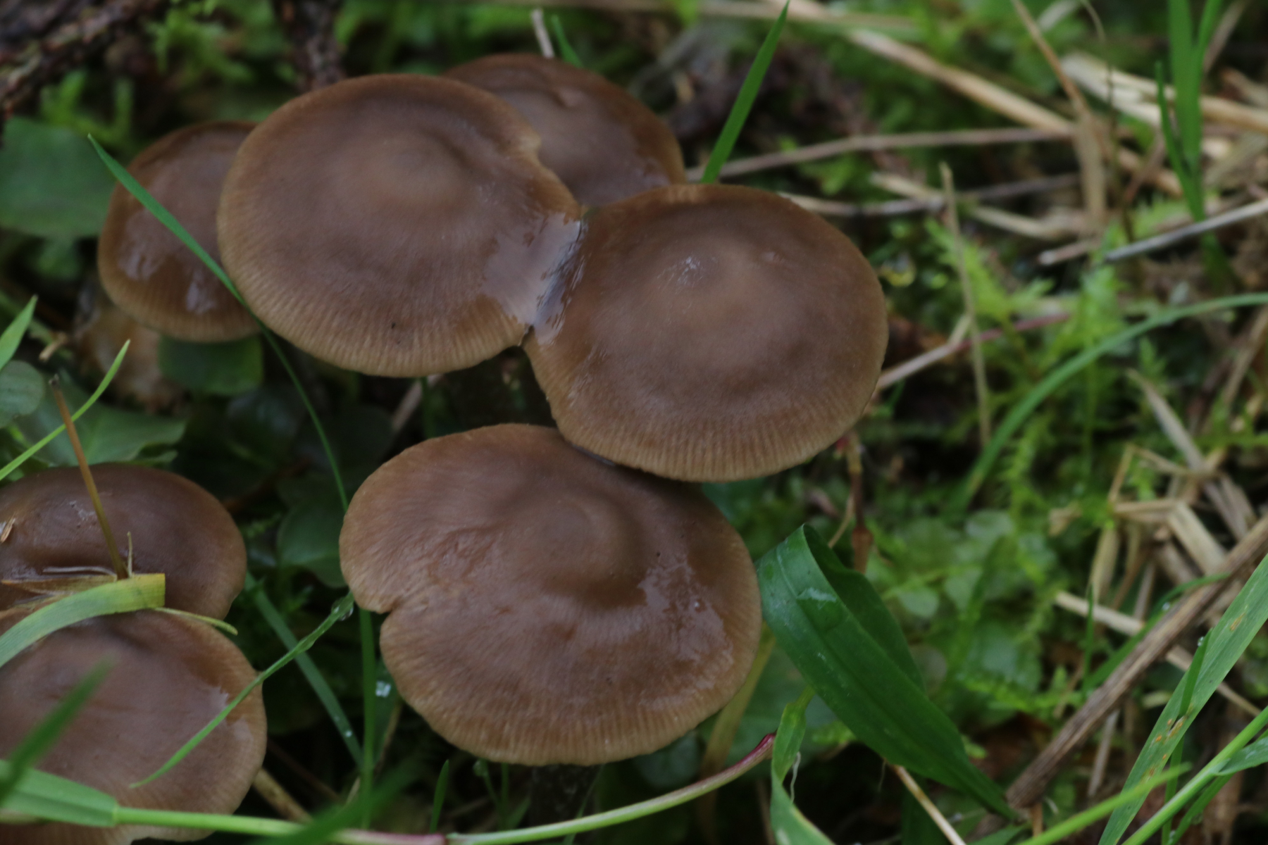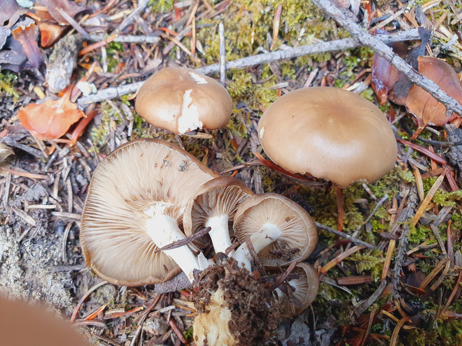 die folgenden Pilze habe ich vor gut zwei Wochen in "meinem" Hauswald gefunden. Sie wuchsen teils büschelig, teils gesellig auf einem Grünstreifen eines Waldstückes, das mit Fichten bewachsen ist. Von oben sahen sie fast wie Rötlinge aus, doch als ich sie umdrehte, dachte ich, dass das doch Raslinge sein müssten.