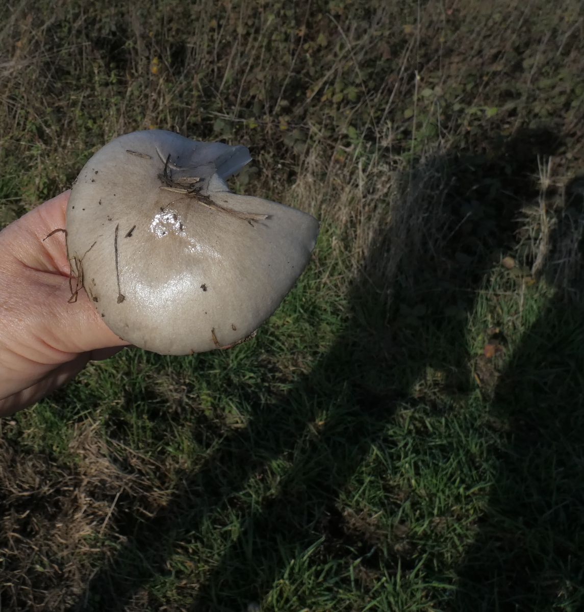 18+19: Am Wege gefunden, auch schon umgeworfen und beschädigt: War's ein Pilzfreund, der ihn bestimmen wollte, oder ein "Uffload", der Pilze umtritt? Meine Diagnose: Ritterling spec., vllt. schwarzfaseriger? Großer Scheidling (Danke für die Tipps!; siehe unten)