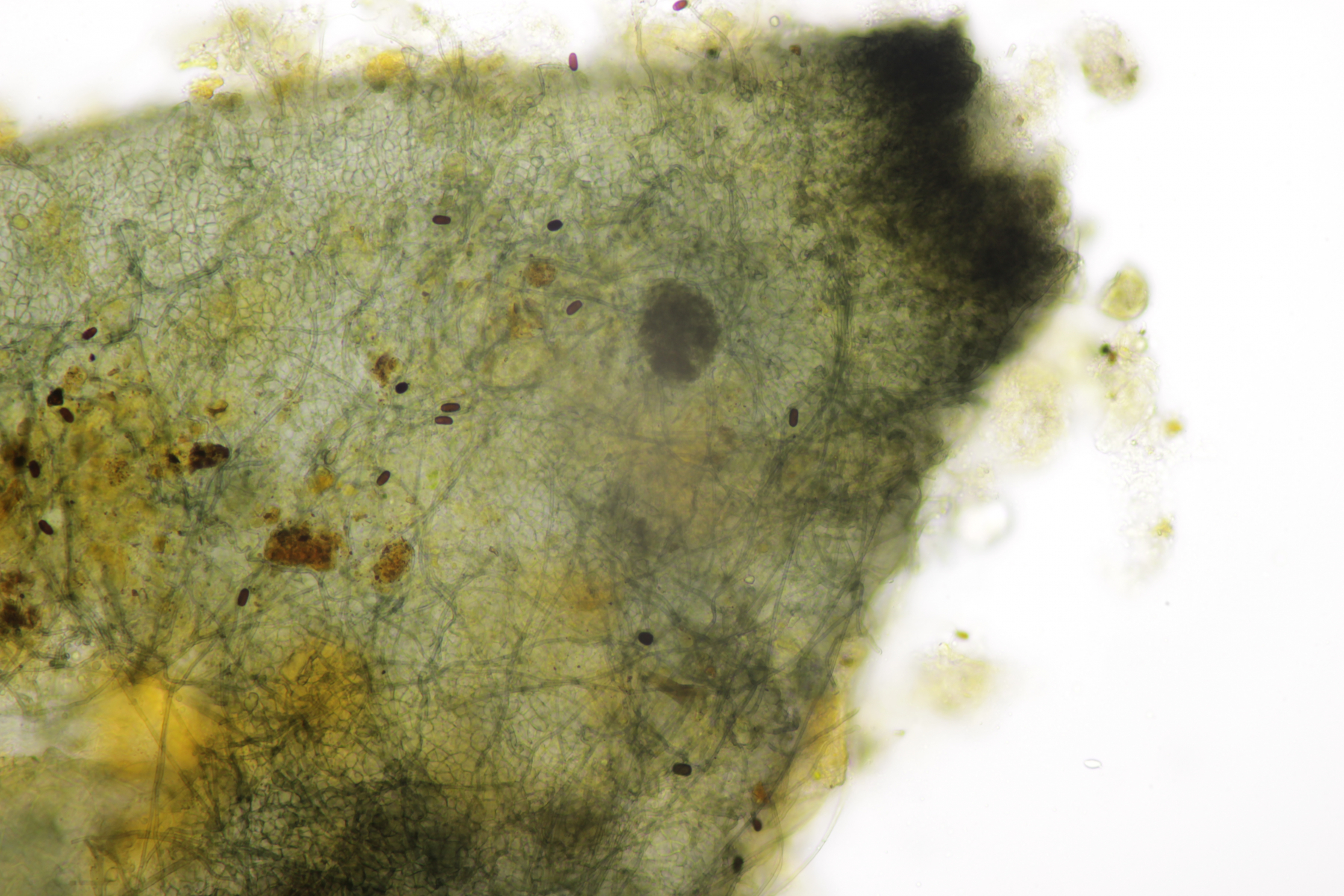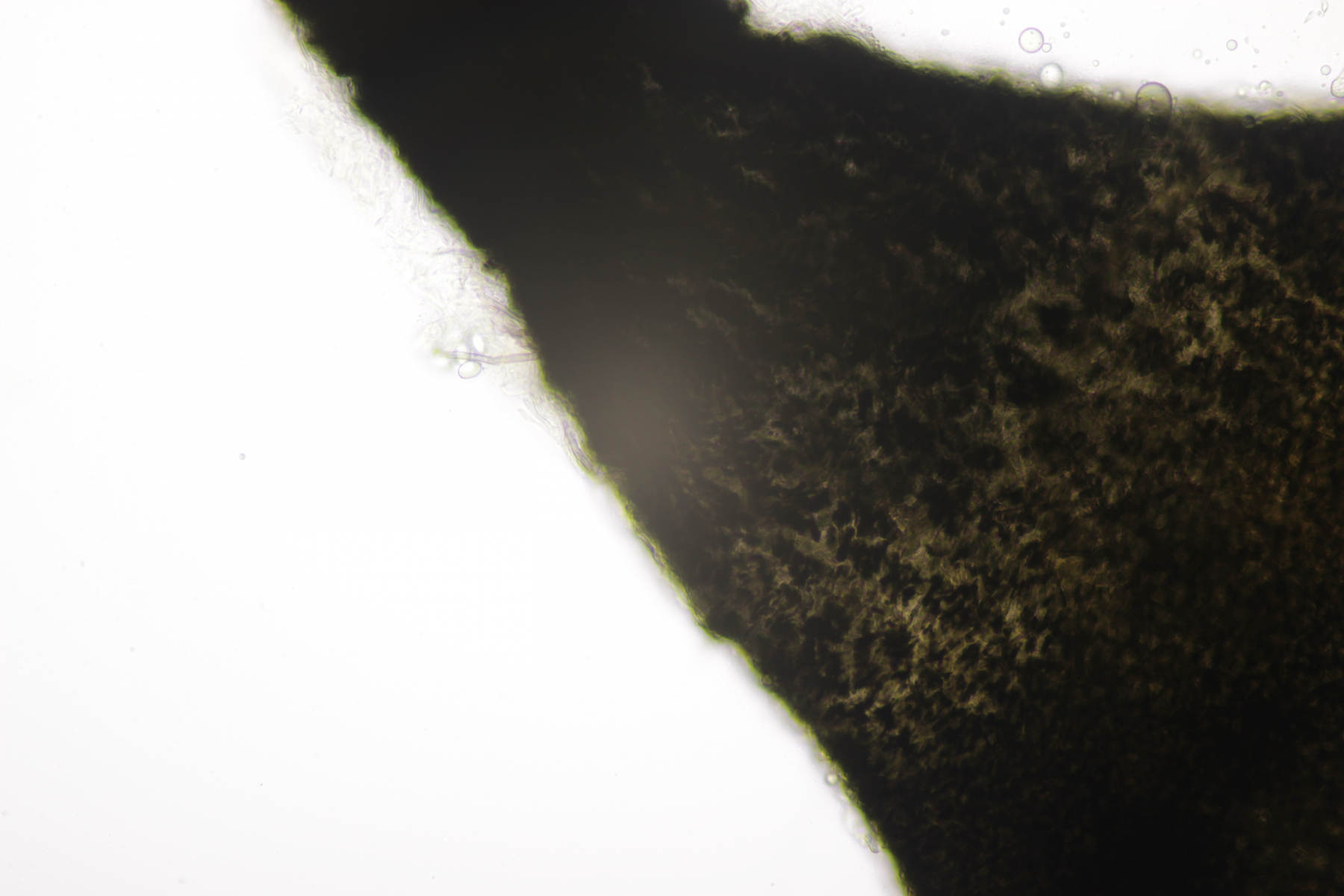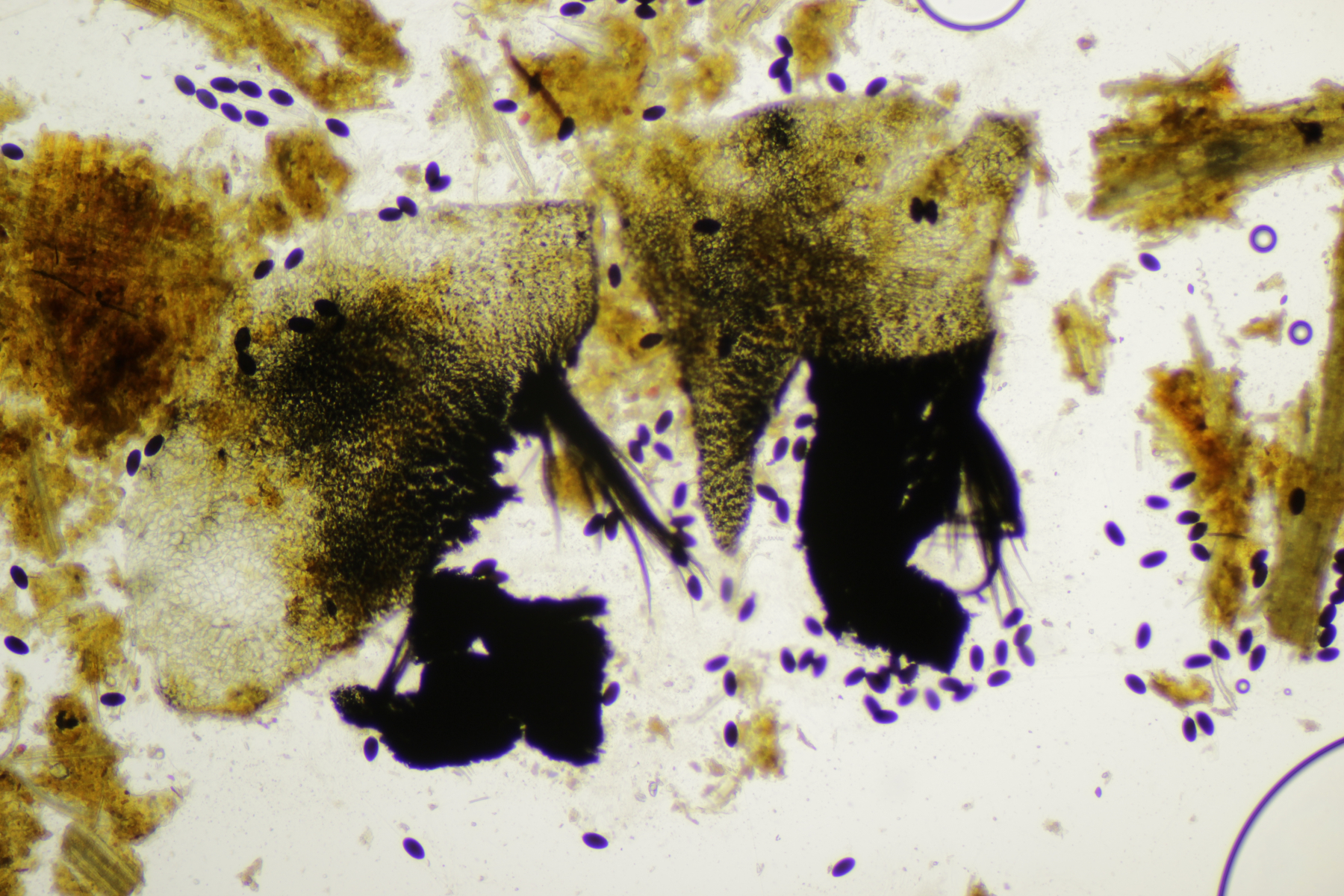 das Schaf hat den nächsten Ascomyceten produziert, diesmal aus der Gattung Saccobolus. Zunächst habe ich nur einen winzigen Fruchtkörper gefunden. Nachdem ich ihn auf dem Objektträger hatte und das Deckgläschen aufgelegt hatte, war zwar ein sehr hübsches Präparat zu erkennen, aber leider zogen binnen Sekunden einige störende Luftblasen heran. Also einfach mal mit dem Radiergummi etwas geklopft.... das Ende vom Lied: Das schöne Präparat war Murks, weil die Sporencluster und teilweise auch die Sporen gelitten haben und alles wild zerstreut war. Zum Glück ergab genauere Nachsuche dann noch einen Fruchtkörper, der zwar ein nicht ganz so hübsches Präparat ergeben hat, aber die wichtigsten Eigenschaften sollte man trotzdem erkennen.
