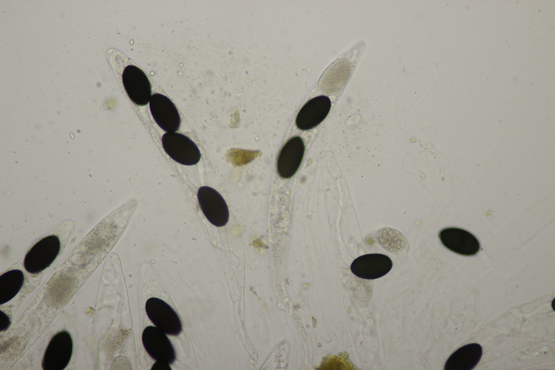 Also am nächsten Tag vom gleichen Köttel noch mal ein Perithecium geschnappt. Diesmal waren die Sporen deutlich größer (48.1+-4.4) µm x (26.5+-2.3) µm, (41.3-56.6) µm x (22.8-33.5) µm, Pedicel (19.5-31) x (6.5-9.5)