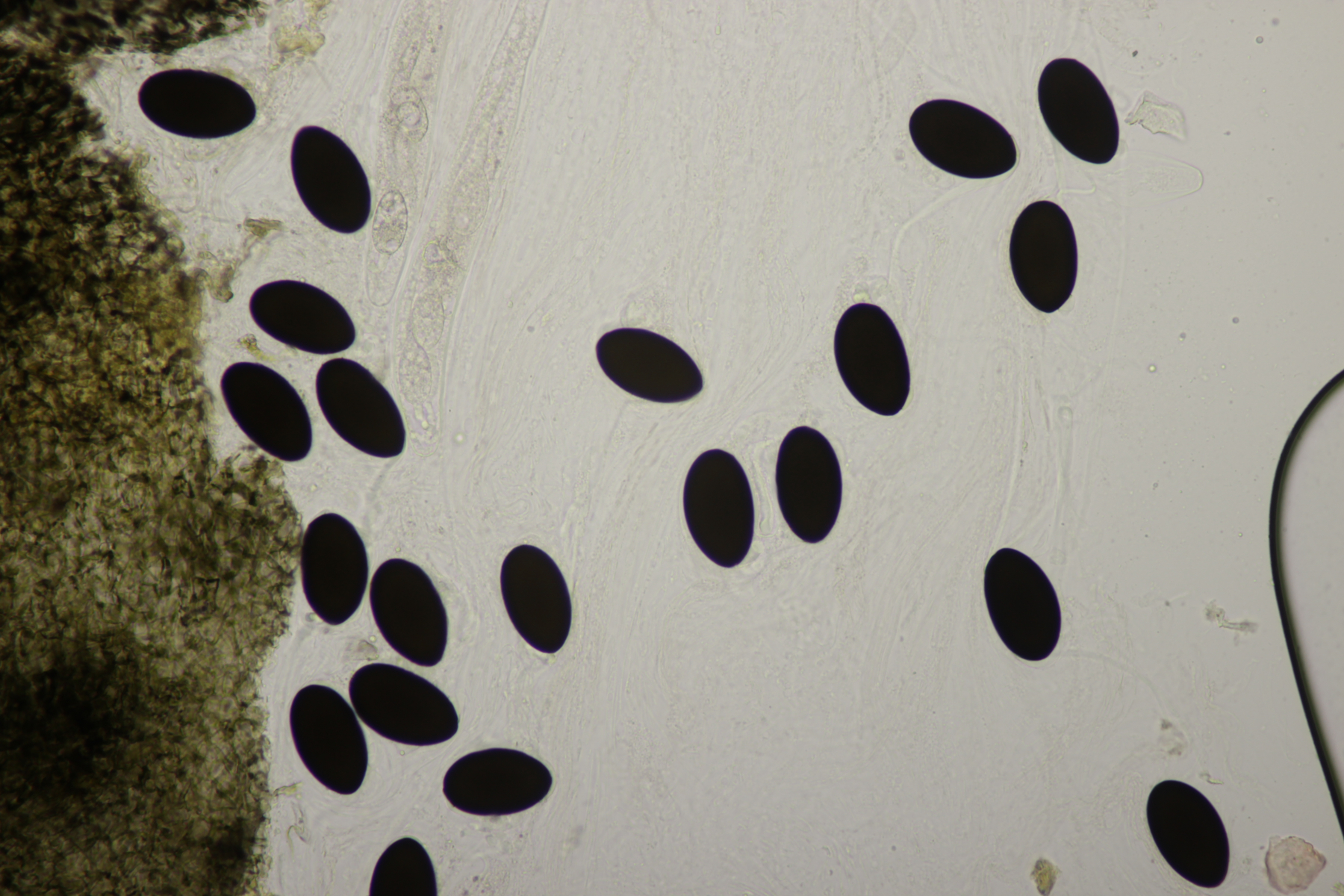 4. Und dann war am Ende auch noch mal wieder ein Pyrenomycet dran. Die Sporen messen (29-33) µm x (17.5-20) µm und würde zu Podospora tendieren. Leider konnte ich die Caudae nicht gescheit sichtbar machen. Bei einer Spore hatte ich den Eindruck, als gäbe es oben an der Spore eine Hand voll Caudae, die quasi wie ein Wischmopp aussehen. Aber ob die Spore jetzt zum gezeigten Pilz gehört ist nicht sicher. Auffällig sind noch die Haare um das gesamte Perithecium herum. Beim Schlüsseln lande ich aber - wieder mal - im Nirgendwo. Nobi, hast Du da eine Idee zu?