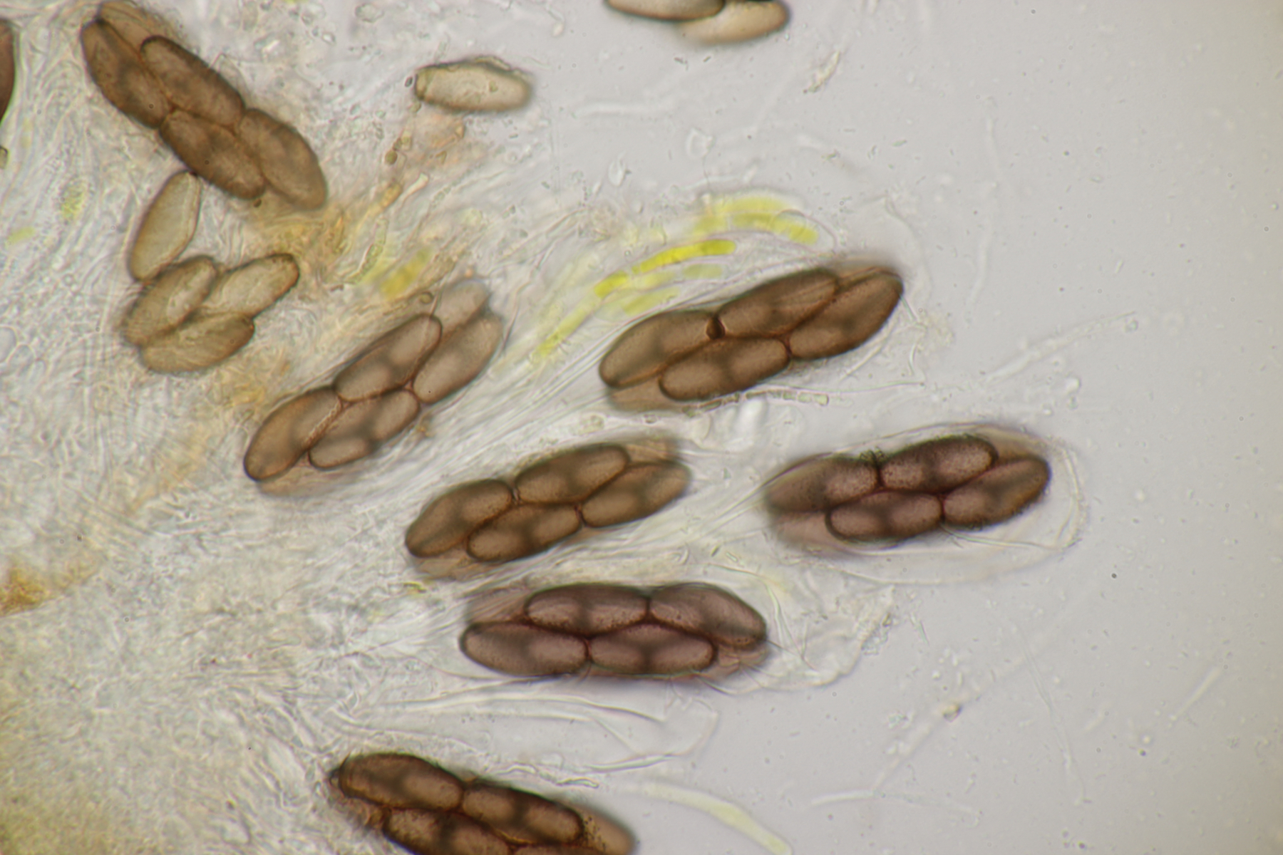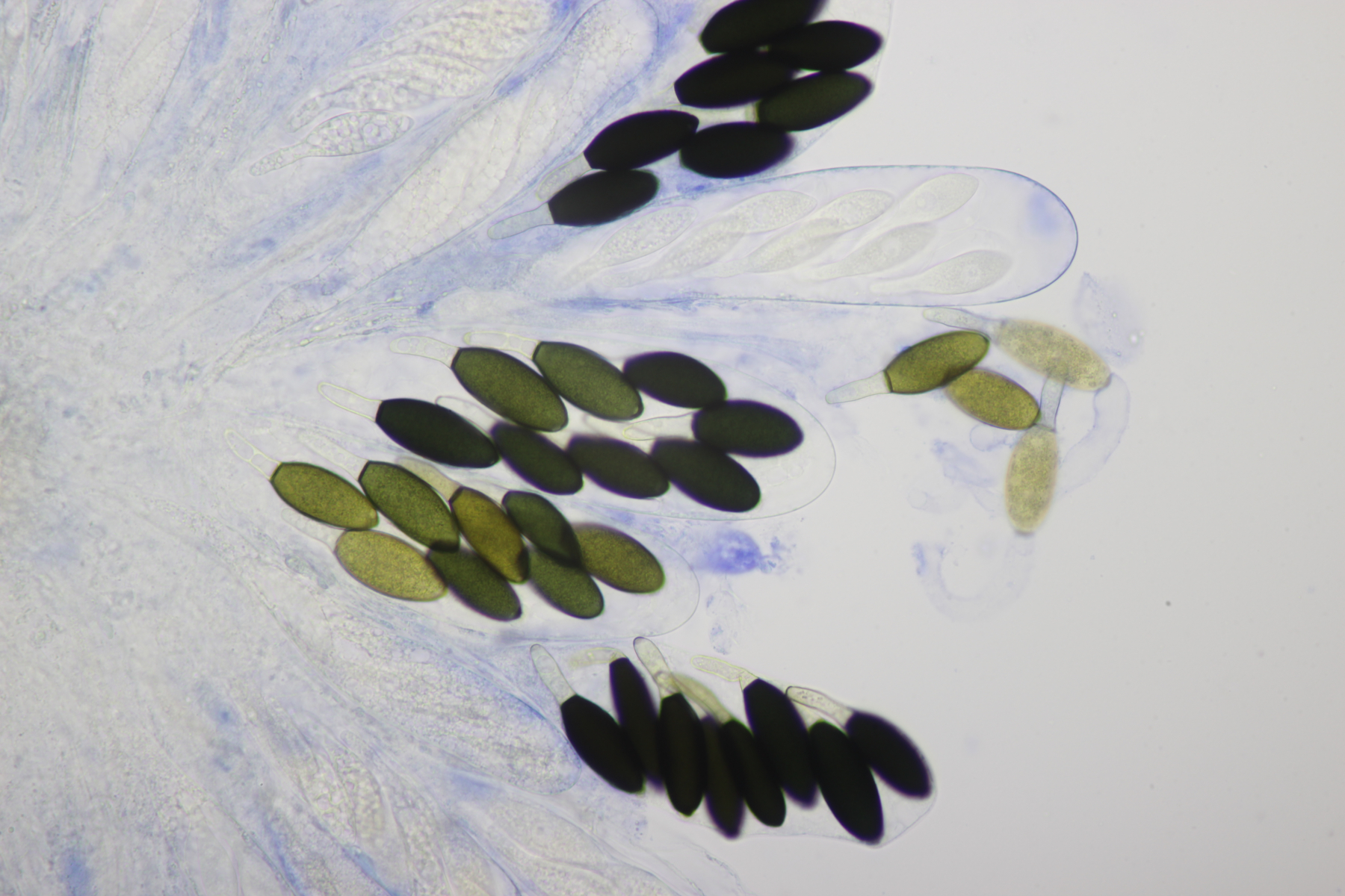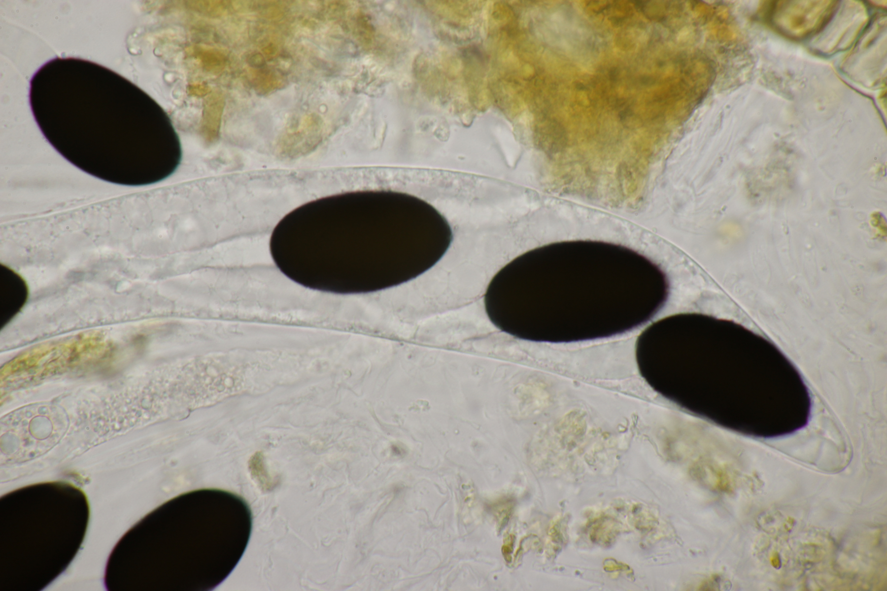 3. Der dritte Pilz hat auch sehr große Sporen: (46.2+-1.1) µm x (25.0+-0.8) µm, Q=1.8+-0.1 bzw. (43.6-47.6) µm x (23.3-26.5) µm, Q=1.7-2.0. Dazu zeigten sich dann mit etwas Tinte sehr lange Anhängsel. Bei einer Spore konnte ich ein über 300 µm langes Anhängsel auf einer Seite beobachten. Auf der anderen Seite war es geschützt ähnlich lang, ließ sich aber nicht so gut ausmessen. Dazu kommen hier noch septierte, steife Haare am Perithecium. Auch hier sind die Asci 4-sporig.