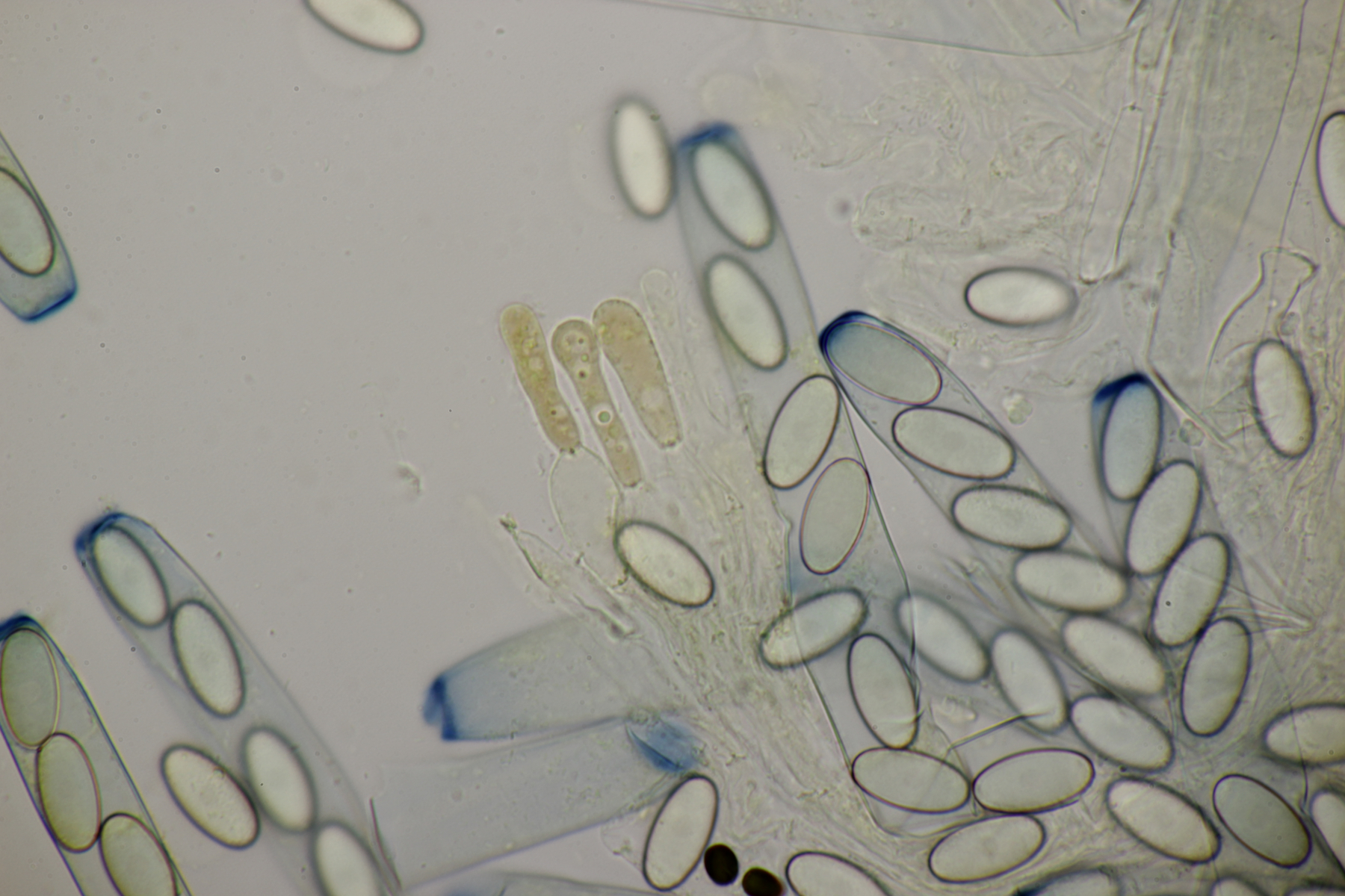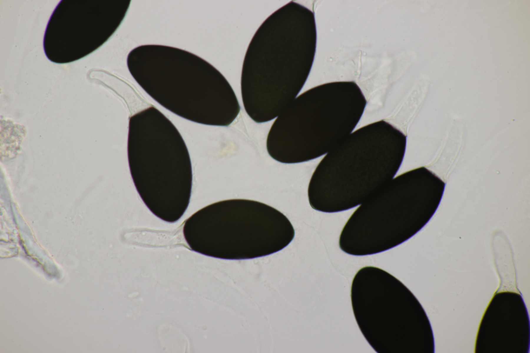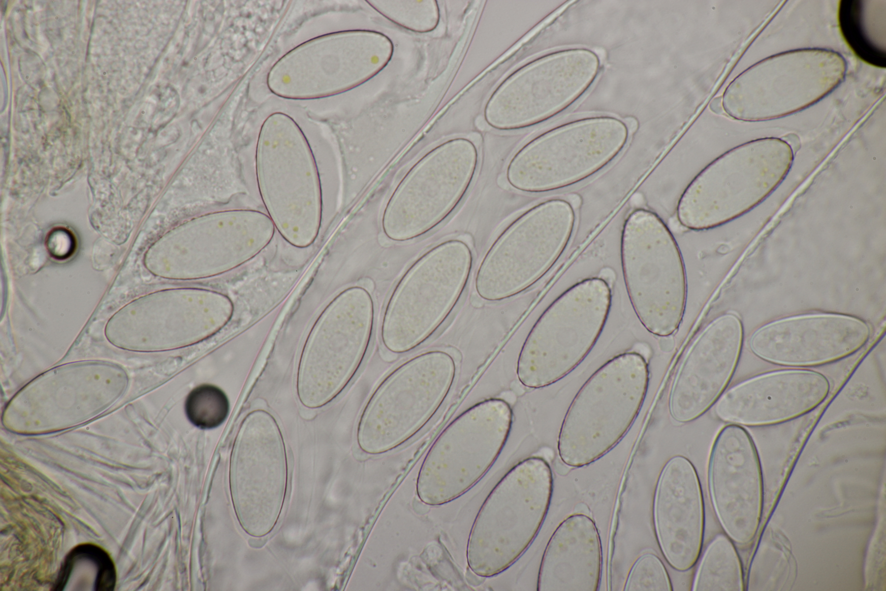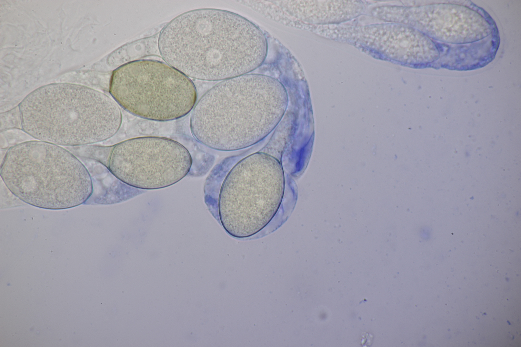 Und vom gleichen Tag noch ein dritter Fruchtkörper, diesmal mit extremer Vorsicht behandelt, so daß auch Anhängsel am Kopf der Spore und unten am Pedicel sichtbar wurden. Hier messen die Sporen (49.3+-2.5) µm x (26.9+-2.0) µm , (44.8-53.5) µm x (24.0-32.5) µm