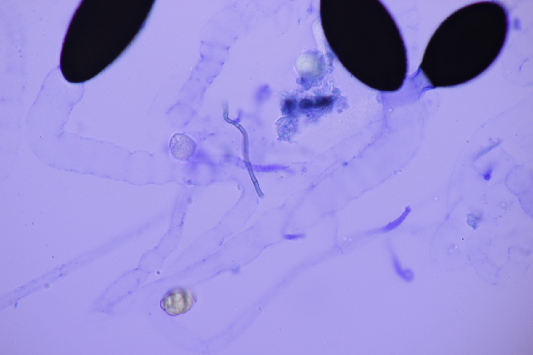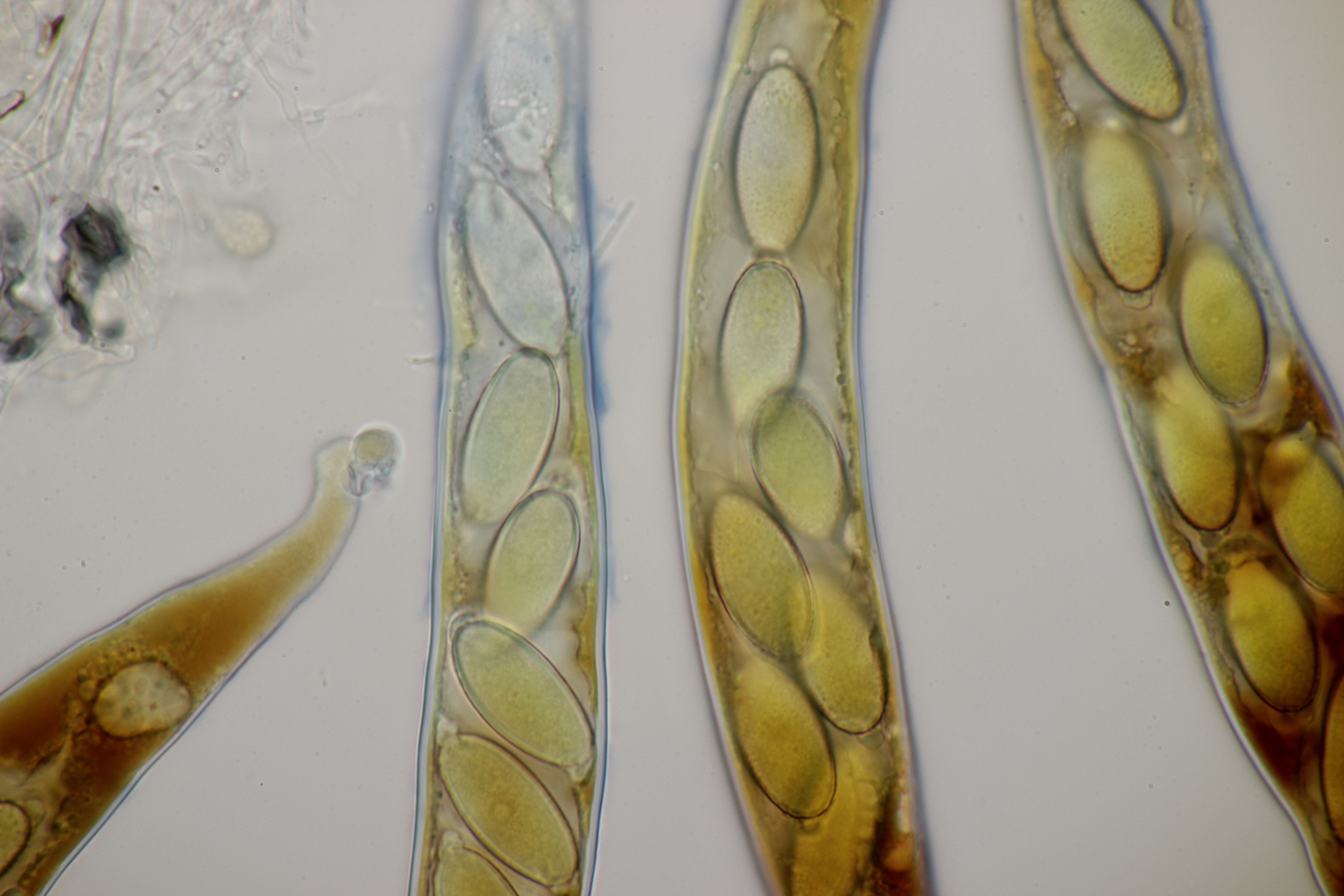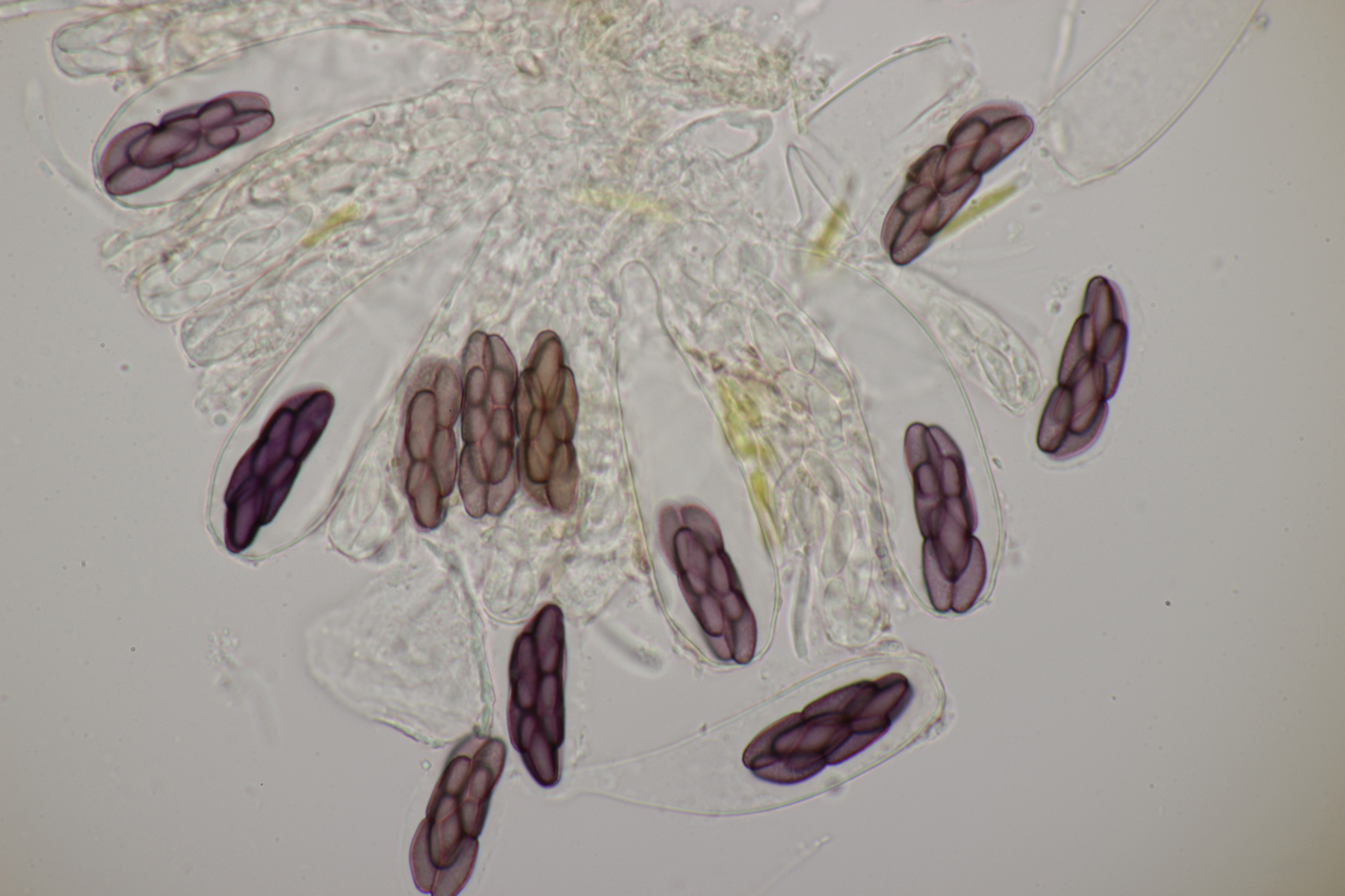 Das erste Exemplar hat Sporen von (43.8+-2.1) µm x (26.4+-1.8) µm, (39.9-46.5) µm x (23.1-30.0) µm, Pedicel (22.5-25.5) µm x (6-8) µm. Leider habe ich hier keine Aufnahmen des Peritheciums gemacht. Anhängsel waren leider auch nicht erkennbar - ich fürchte, ich hab mal wieder etwas zu stark gedrückt.