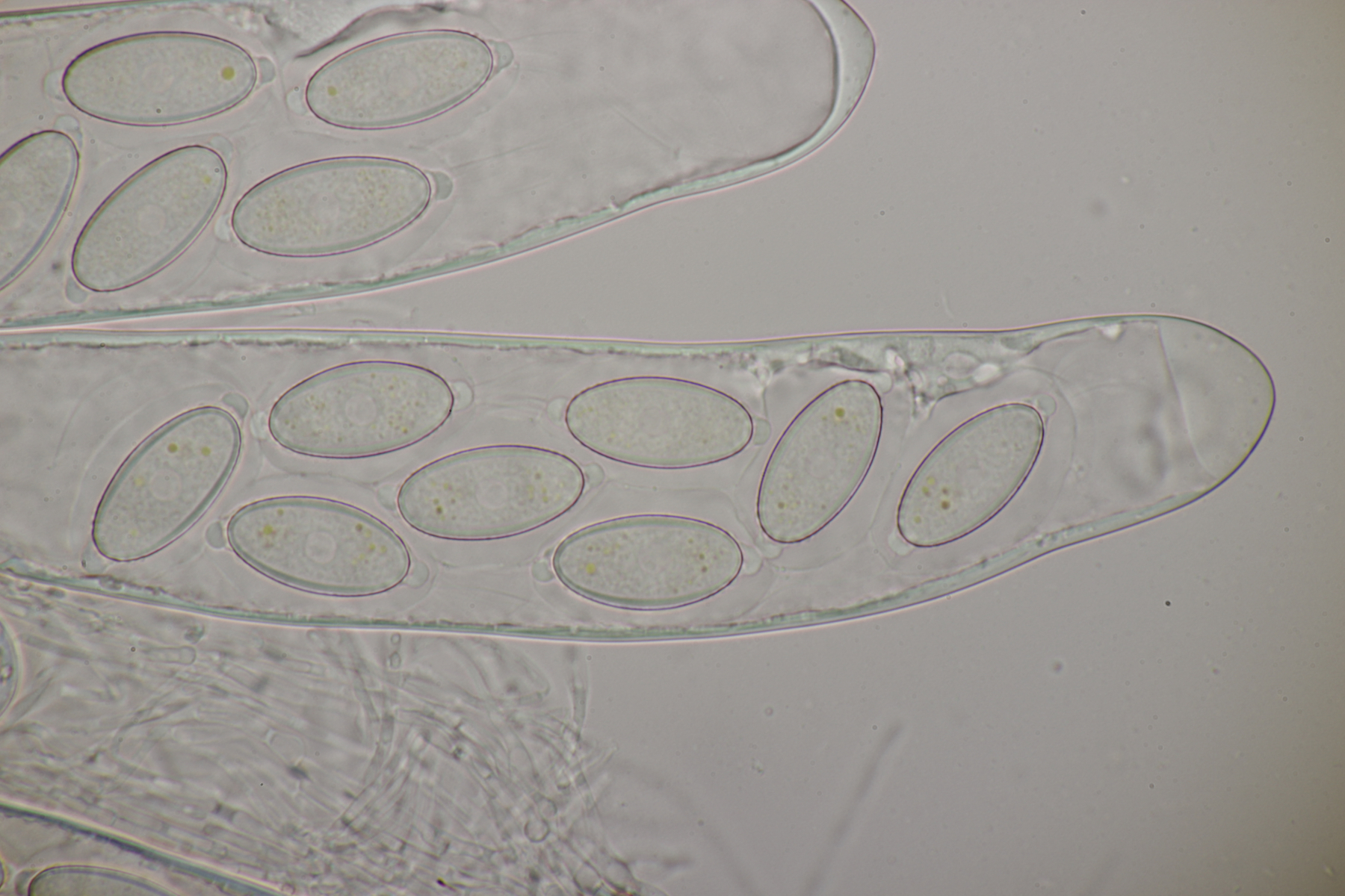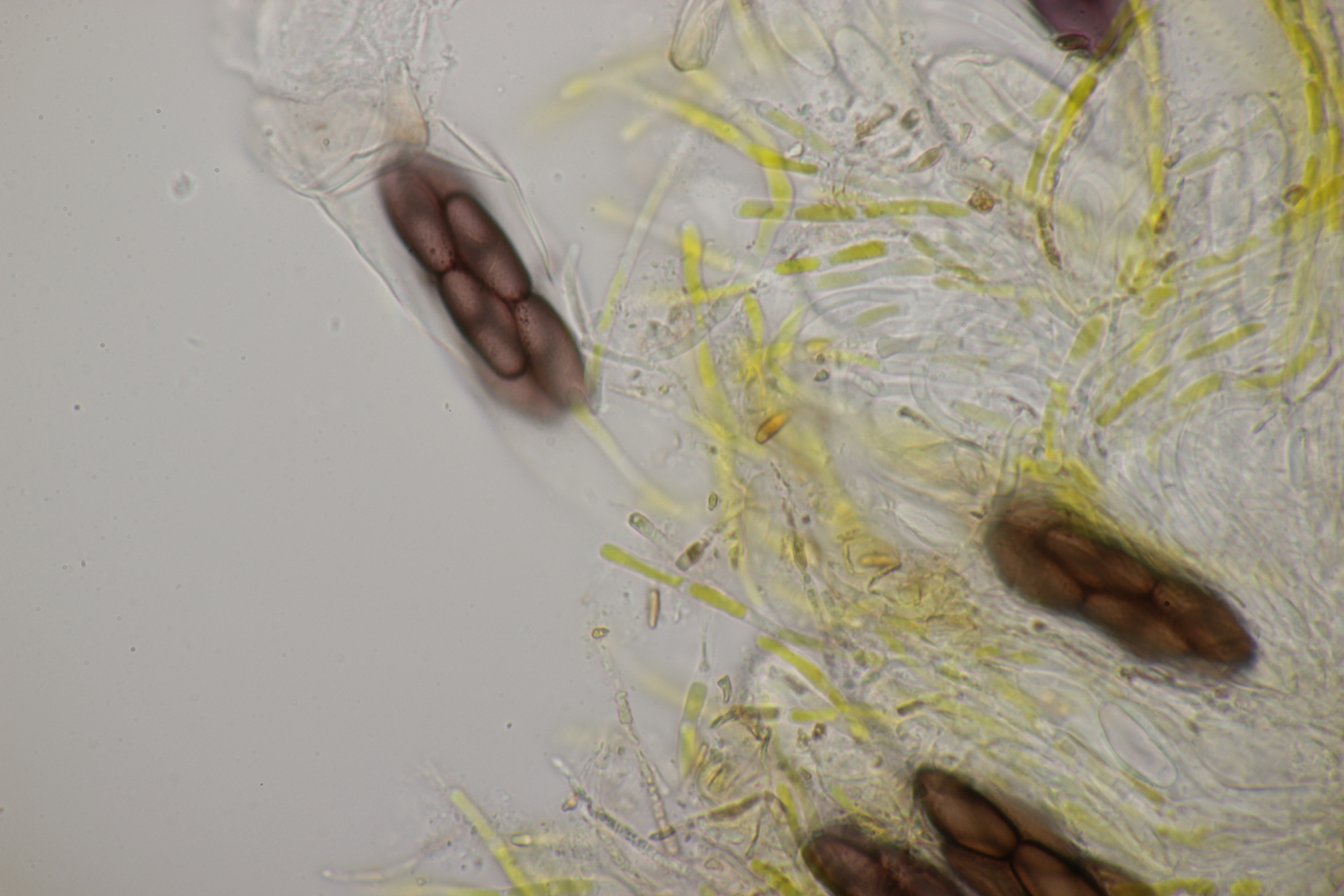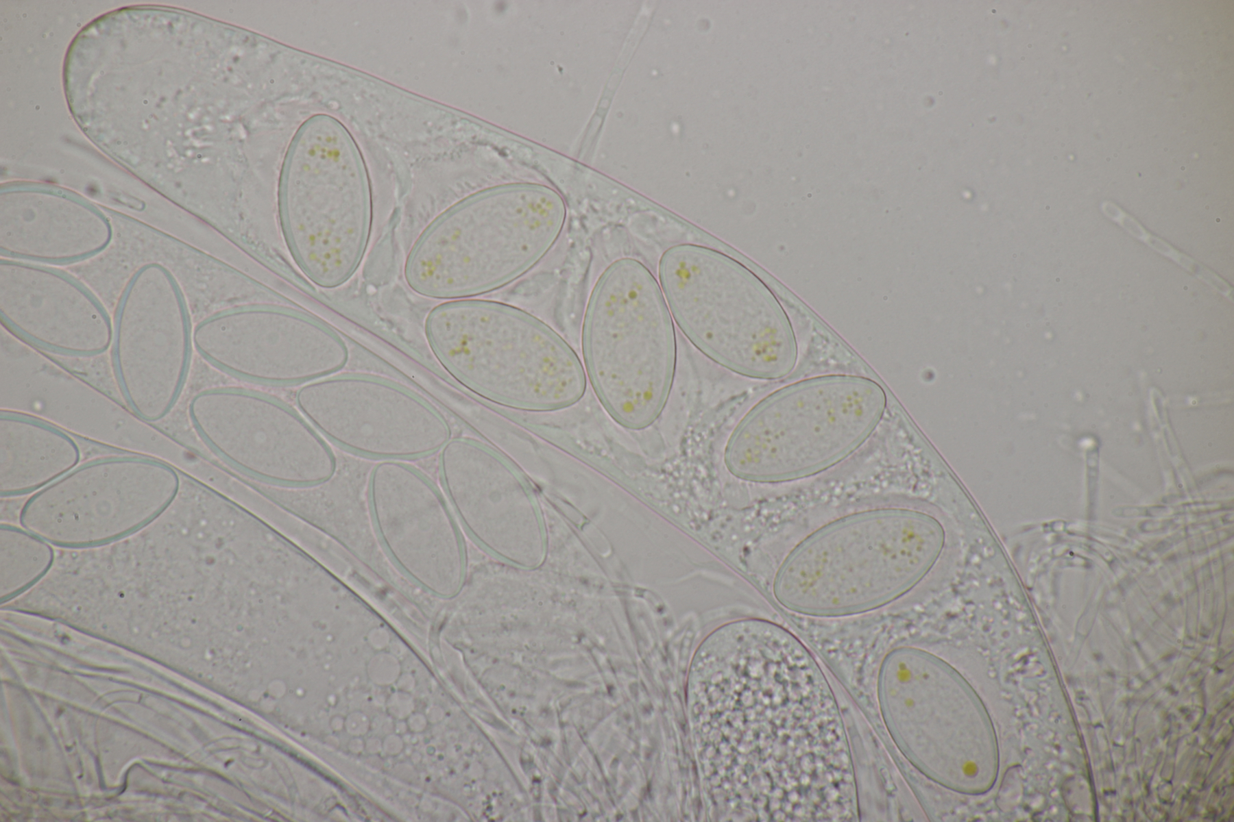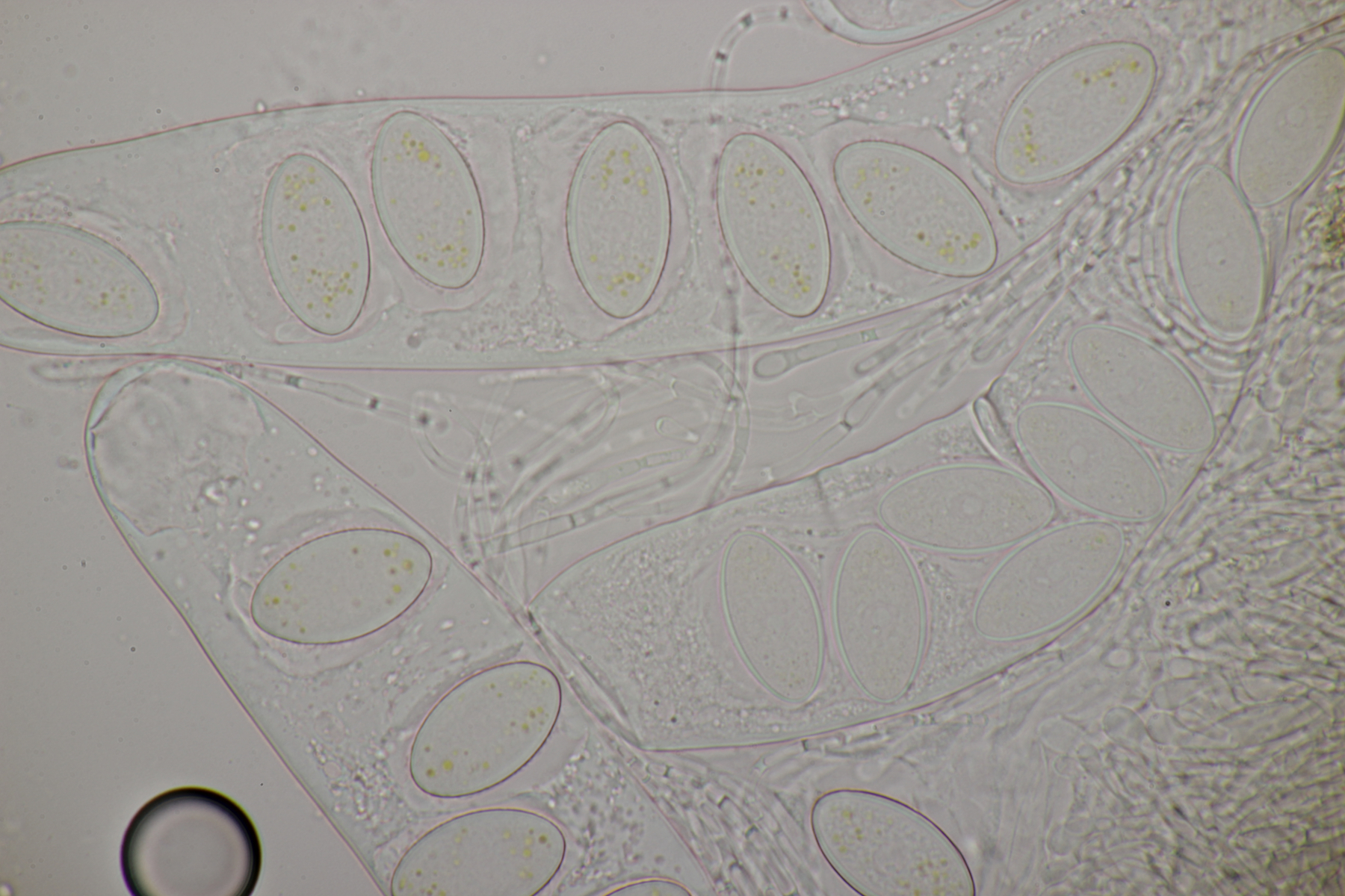 Die Sporen sind jung hyalin, dann violett und am Ende braun-violett. Sie messen ca (20-22) µm x (8-9) µm, sind überwiegend feinwarzig, teilweise auch mit etwas gröberen Warzen und weisen vereinzelt auch Risse auf. Mit van Brummelen lande ich wegen der gelben Paraphysen in der Sect. Saccobolus und dort dann mit der Sporengröße bei Saccobolus citrinus. Was sagen die Experten?