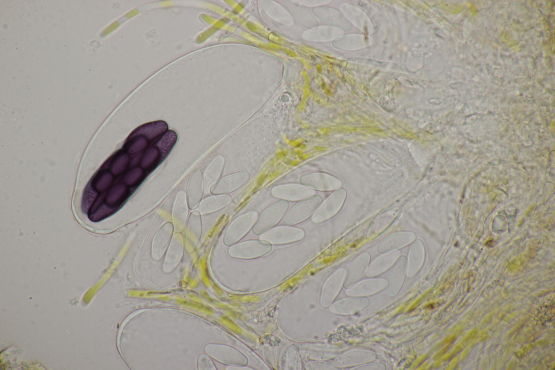 Die Sporen sind jung hyalin, dann violett und am Ende braun-violett. Sie messen ca (20-22) µm x (8-9) µm, sind überwiegend feinwarzig, teilweise auch mit etwas gröberen Warzen und weisen vereinzelt auch Risse auf. Mit van Brummelen lande ich wegen der gelben Paraphysen in der Sect. Saccobolus und dort dann mit der Sporengröße bei Saccobolus citrinus. Was sagen die Experten?