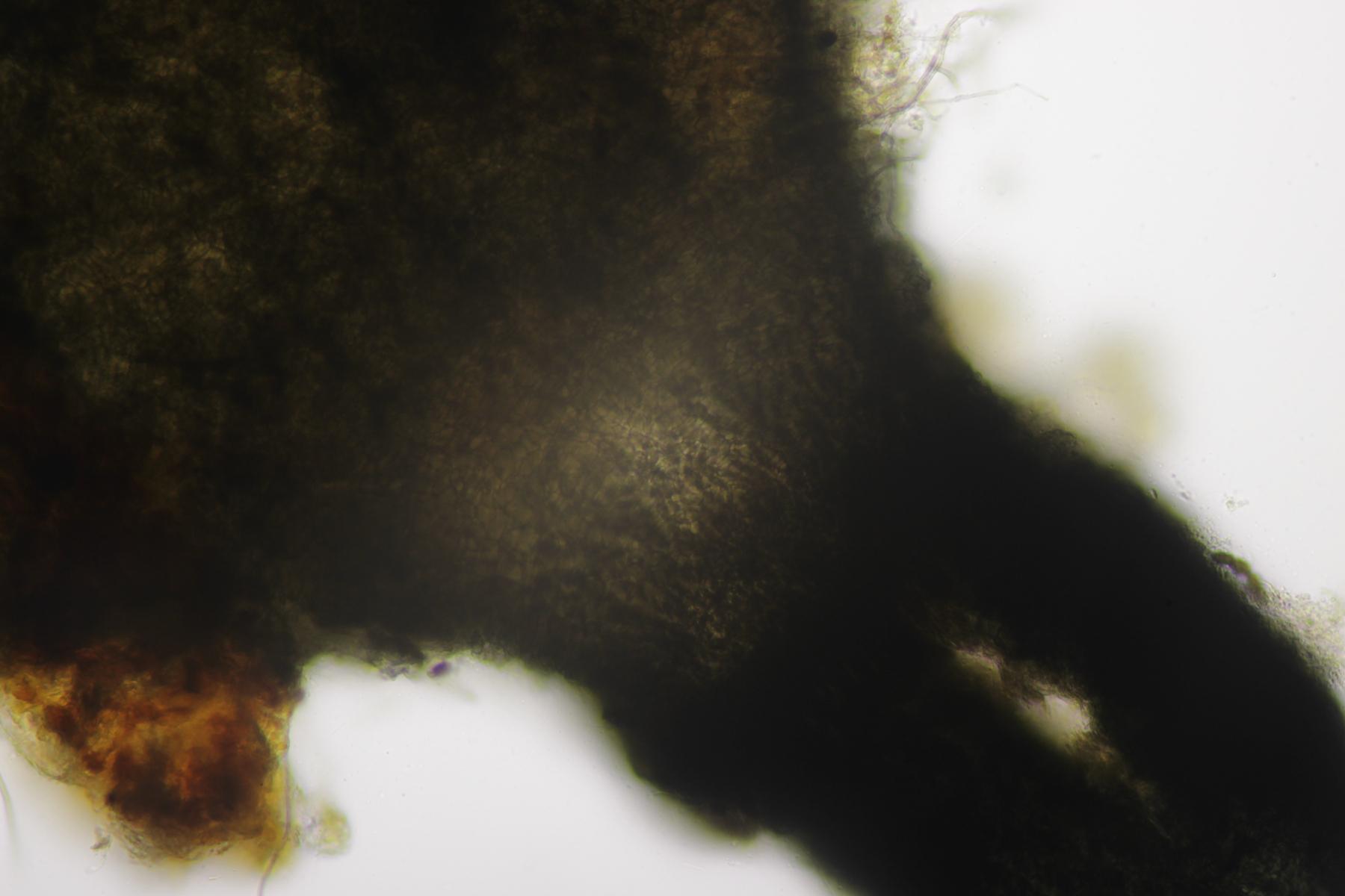 3. Der dritte Pilz hat auch sehr große Sporen: (46.2+-1.1) µm x (25.0+-0.8) µm, Q=1.8+-0.1 bzw. (43.6-47.6) µm x (23.3-26.5) µm, Q=1.7-2.0. Dazu zeigten sich dann mit etwas Tinte sehr lange Anhängsel. Bei einer Spore konnte ich ein über 300 µm langes Anhängsel auf einer Seite beobachten. Auf der anderen Seite war es geschützt ähnlich lang, ließ sich aber nicht so gut ausmessen. Dazu kommen hier noch septierte, steife Haare am Perithecium. Auch hier sind die Asci 4-sporig.