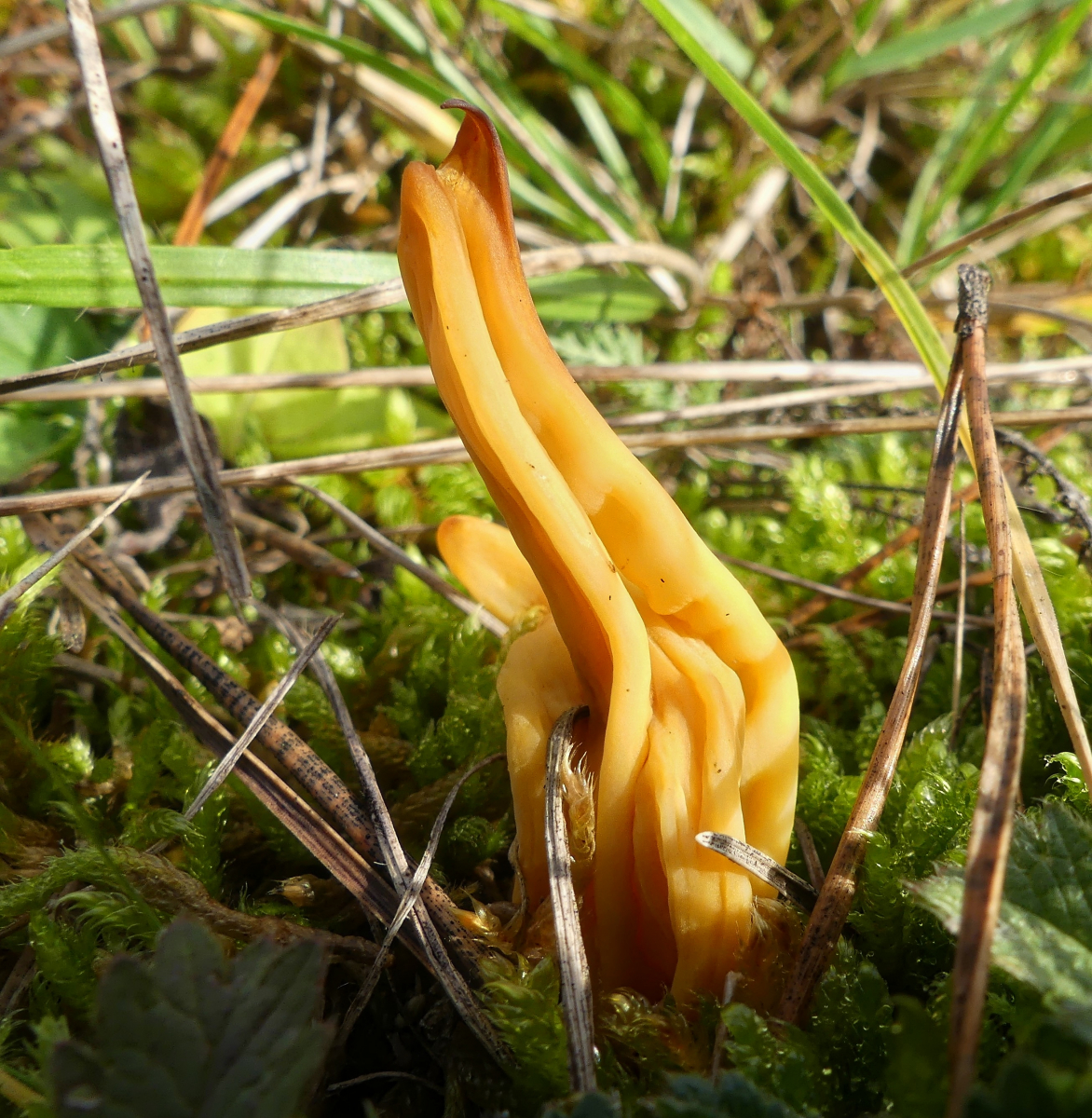 Ich vermute, dass dies Orangefarbene Wurzelbecherlinge (Sowerbyella imperialis) sein könnten. Jedenfalls standen da auf einmal sehr, sehr viele davon.