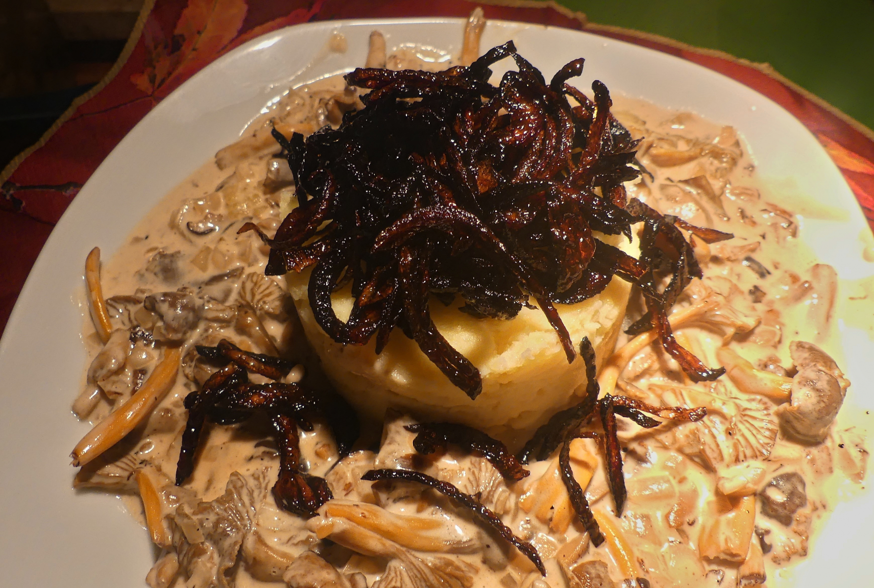 Ragout von Trompetenpfifferlingen und Maronen in leicht saurer Sahnesoße mit Stopfer (Kartoffelpüree) und dunkel gerösteten Zwiebeln - unglaublich lecker!