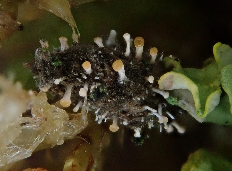 was habe ich denn da gefunden? Diese kleinen Pilzchen wachsen auf einem Mäusekötel, den ich zwischen Flechten fand. Meine Vermutung ist ein Zygomyzet mit Stiel und Sporangium drauf, aber so eine rechte Idee habe ich nicht. Die gelbe Kappe ist gallertig, nicht fest; wenn ich das ganze Ding quetsche kommen da massenhaft diese Sporen raus. Die Sporen sind klein, so um 4-5(-7) x 3 µ.