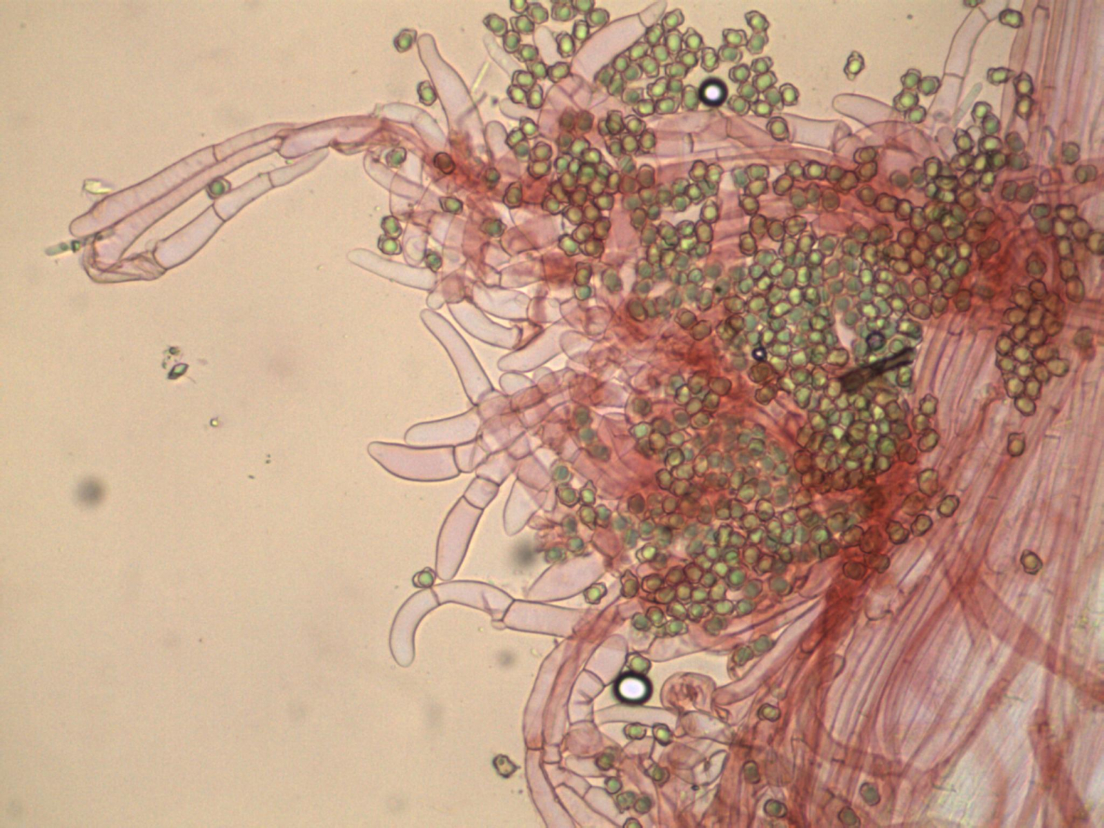 Viele Zystiden vorhanden. Meist mit Kristallschopf, aber auch ohne. Dazwischen ein paar keulige.