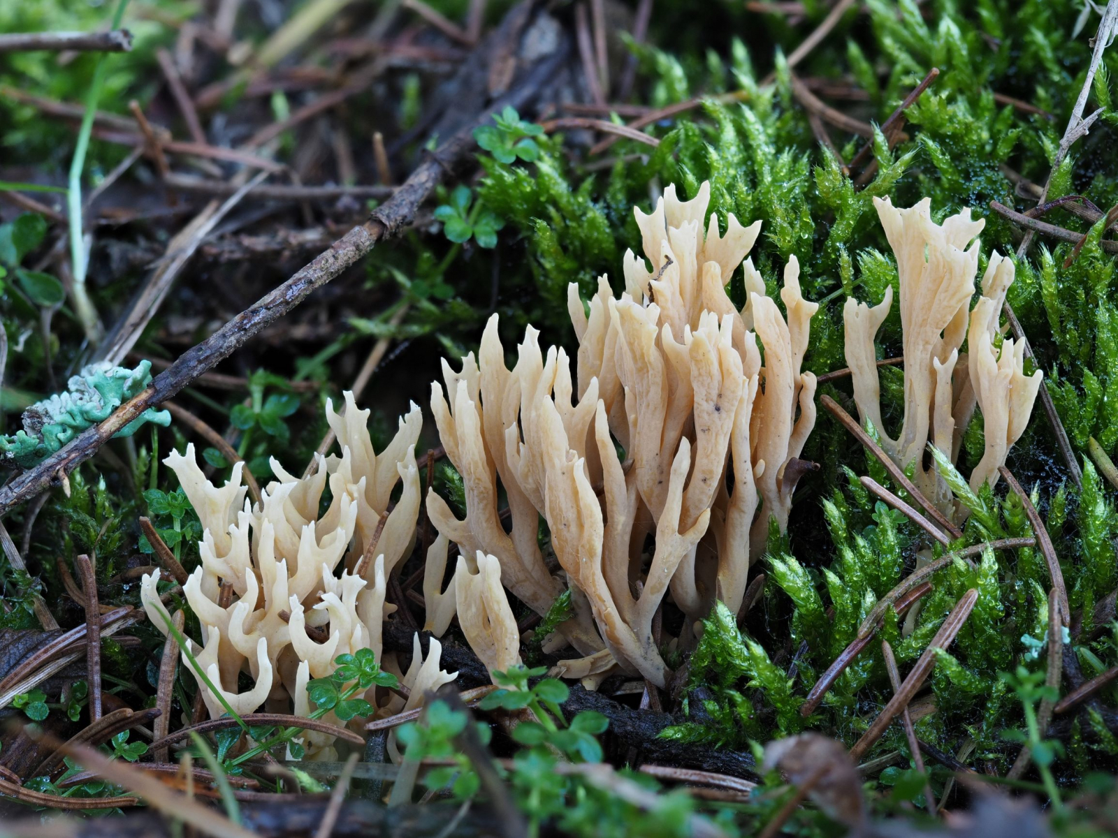 Am zurück liegenden Mittwoch unternahmen wir eine Tour ins Westerzgebirge, um auf einer Calluna-reichen Fläche nach der Heide-Keule zu schauen. Leider hatten wir nicht das Glück wie unsere Pilzfreunde aus der Dresdner Ecke und entdeckten kein Wachstum dieser interessanten Pilzart. Vielleicht war es ihr zu kalt gewesen in ca. 900 m Höhe ü. NN. Dennoch freuten wir uns an der Landschaft und am Wiederfund von Zypressenbärlapp, einer uns unbekannten Ramaria- oder Phaeoclavulina-Art (könnte ggf. in Richtung R. stricta gehen?, FK wuchsen an verrottenden Fichtenzweigen) sowie unserem Erstfund der Isländisch Moos-Flechte in diesem Areal.