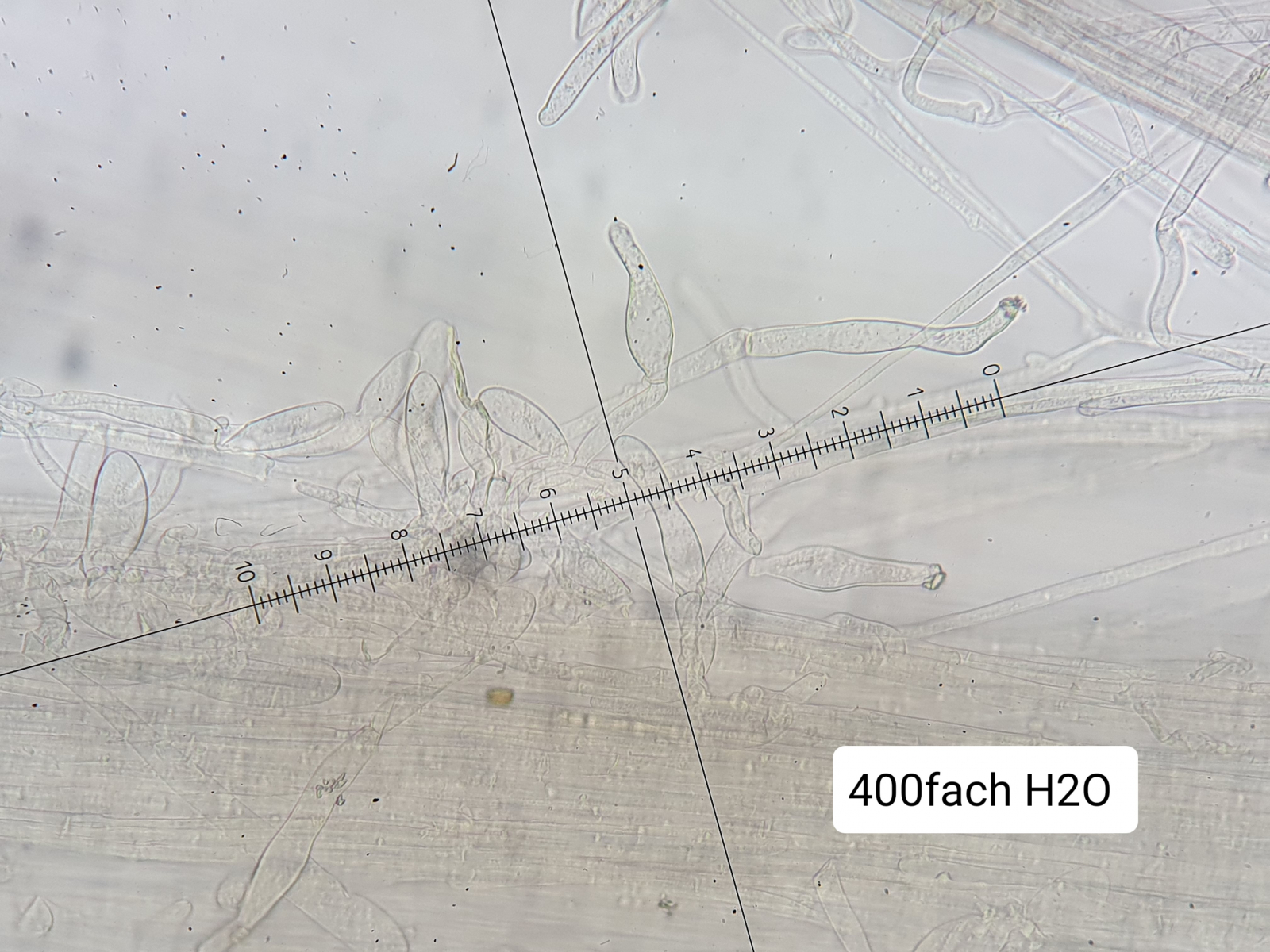 Auf diesem Bild sieht man zwar die Zystide nicht gut (wegen der Schärfeebene), dafür aber den Fuss.