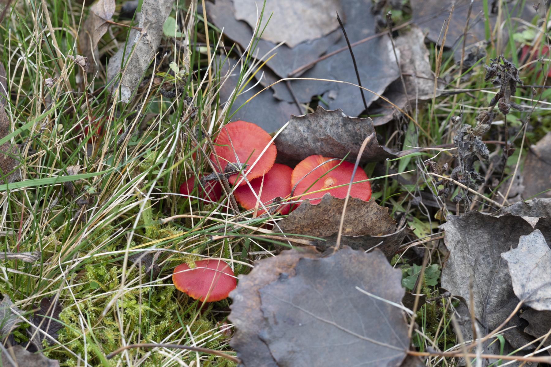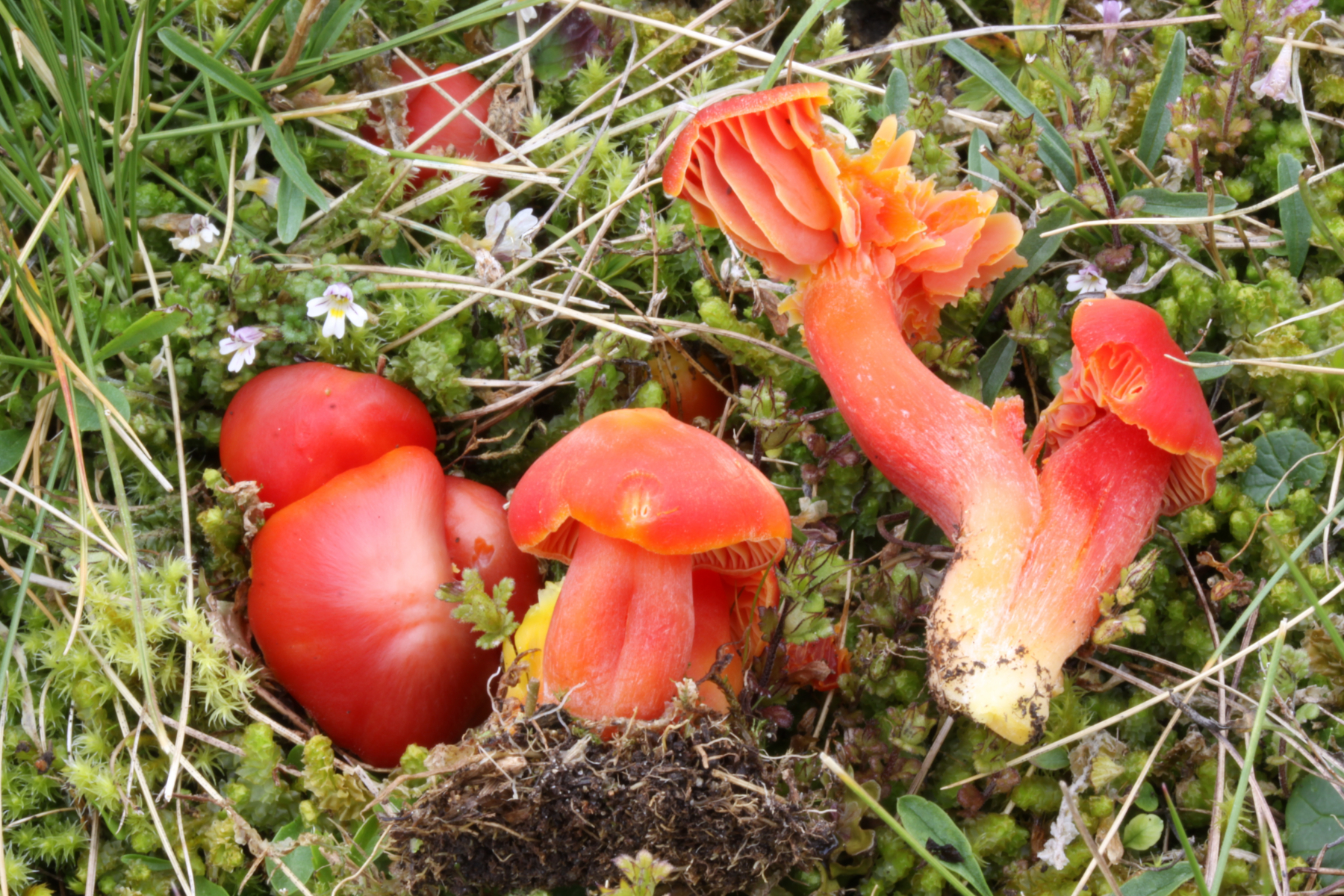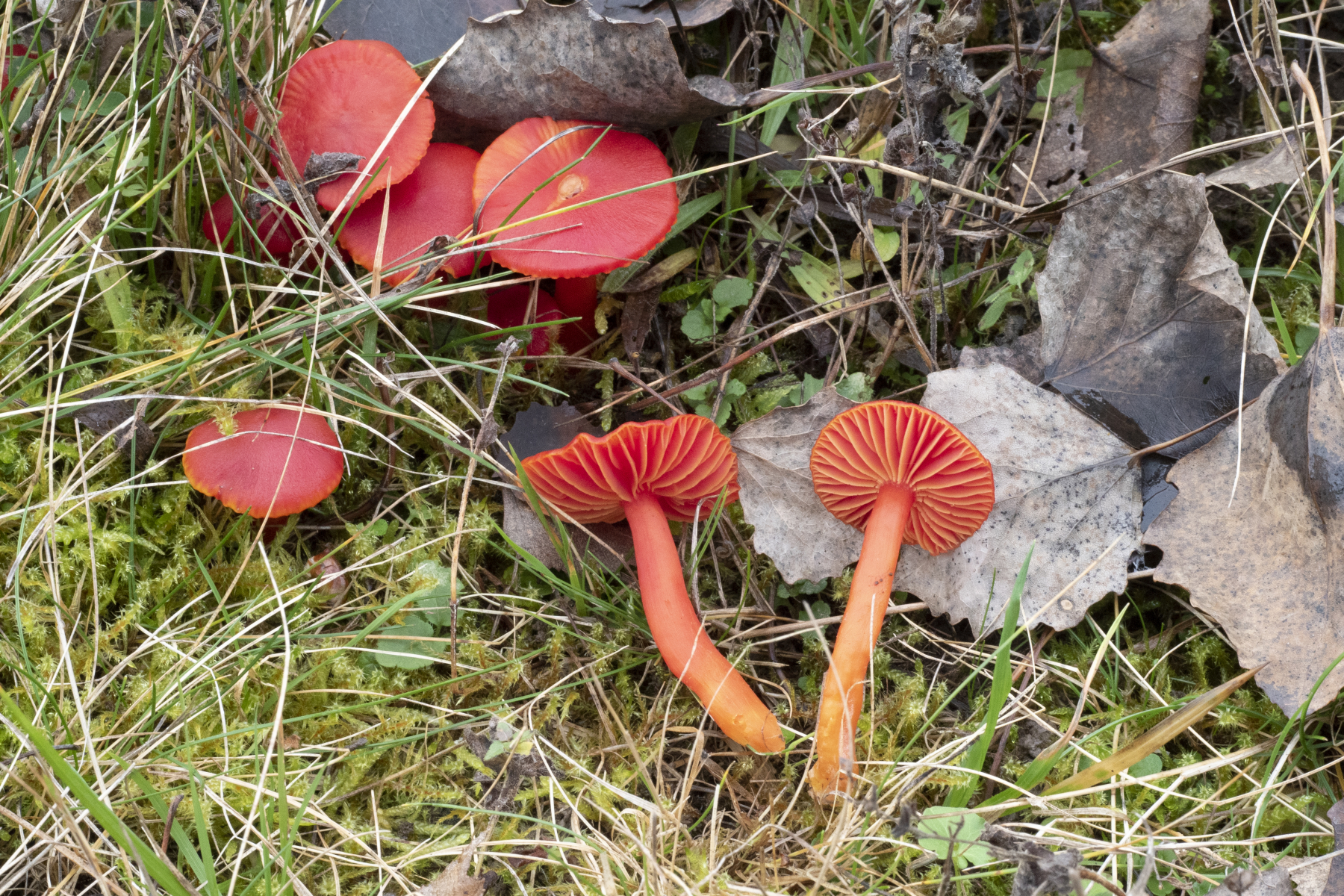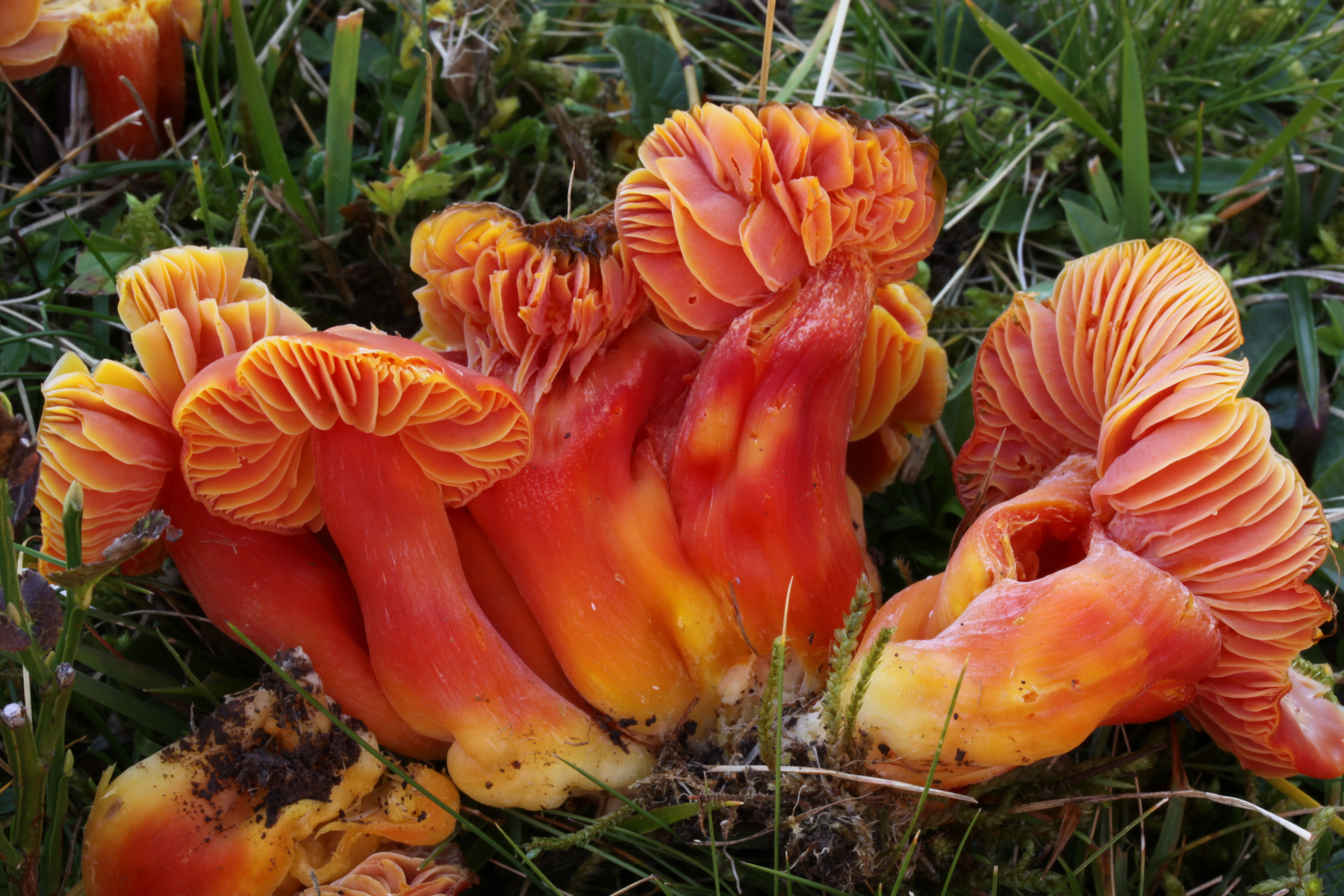 Hier kann man's leider nicht so gut sehen - ich hätte einen Fruchtkörper durchschneiden müssen. Ich war vom Farbrausch so gefangen, dass ich gar nicht mehr dran gedacht habe. Bei Hygrocybe splendidissima sind die Lamellen aufsteigend bis fast frei, sie können aber eben auch mal mit Zahn etwas runterlaufen, sind dann aber auch noch ausgebuchtet. Und ausgebuchtet sehen die Lamellen bei dir aus, finde ich. Richtig runterlaufend sind sie nicht - passt daher für mich noch in die Variationsbreite von H. splendidissima.