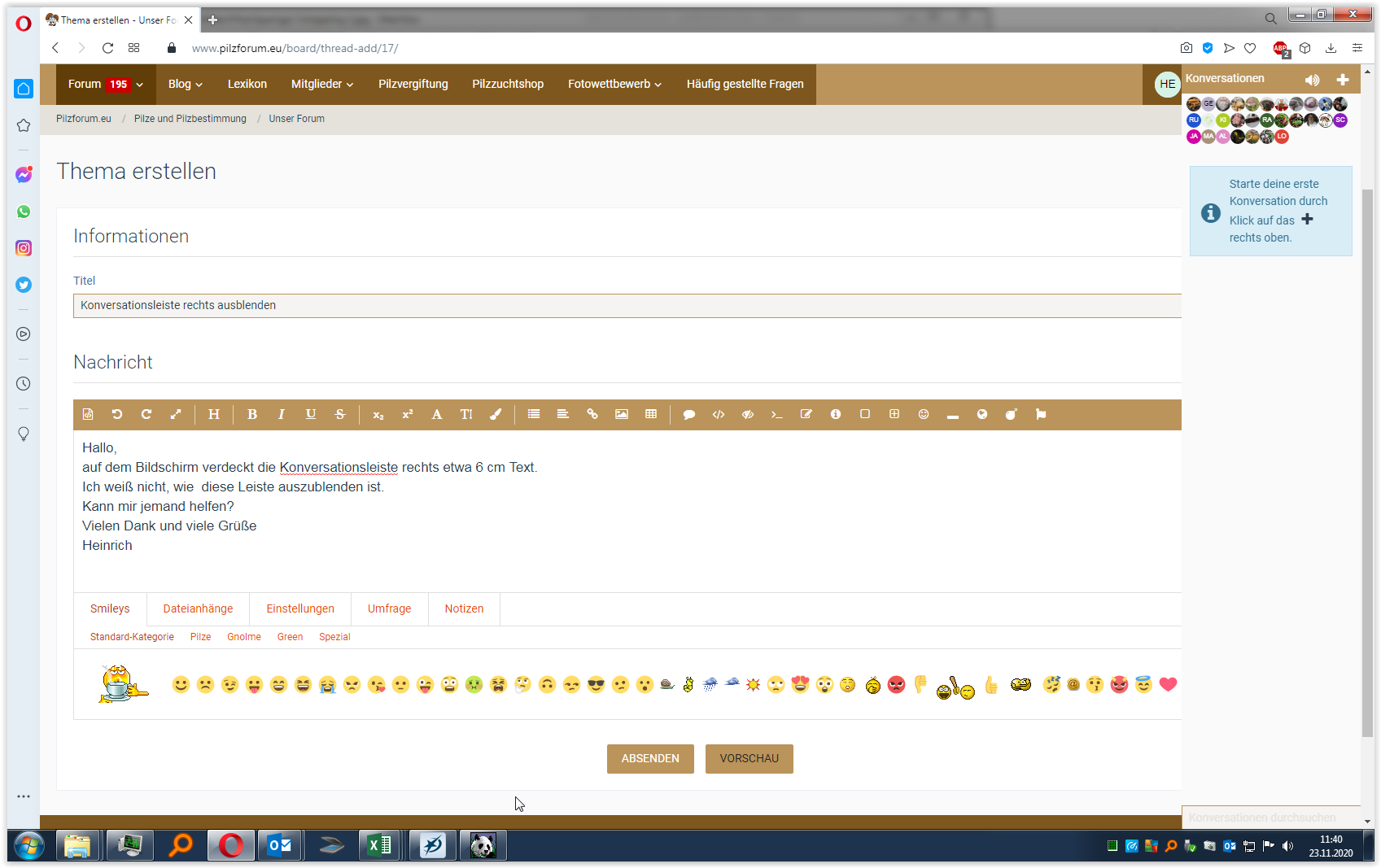 auf dem Bildschirm verdeckt die Konversationsleiste rechts etwa 6 cm Text.