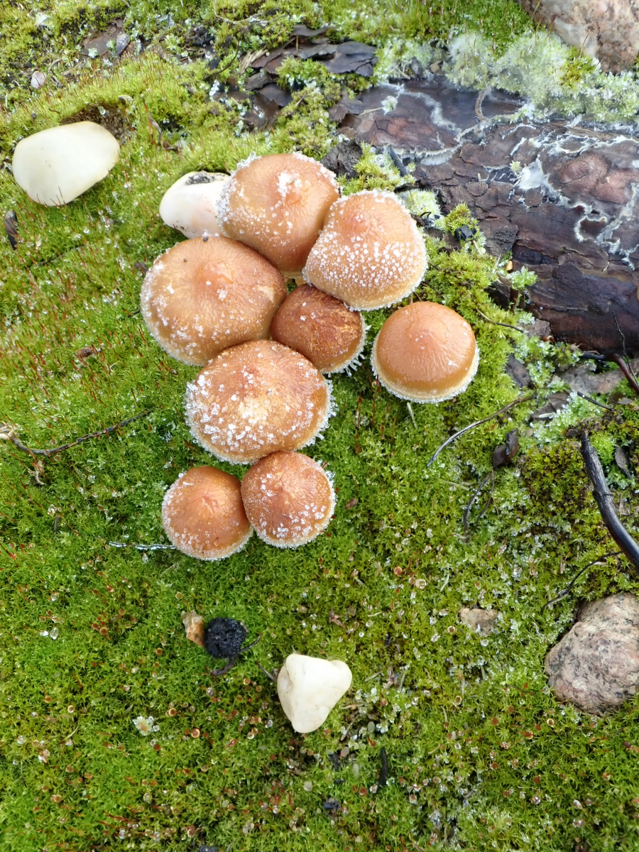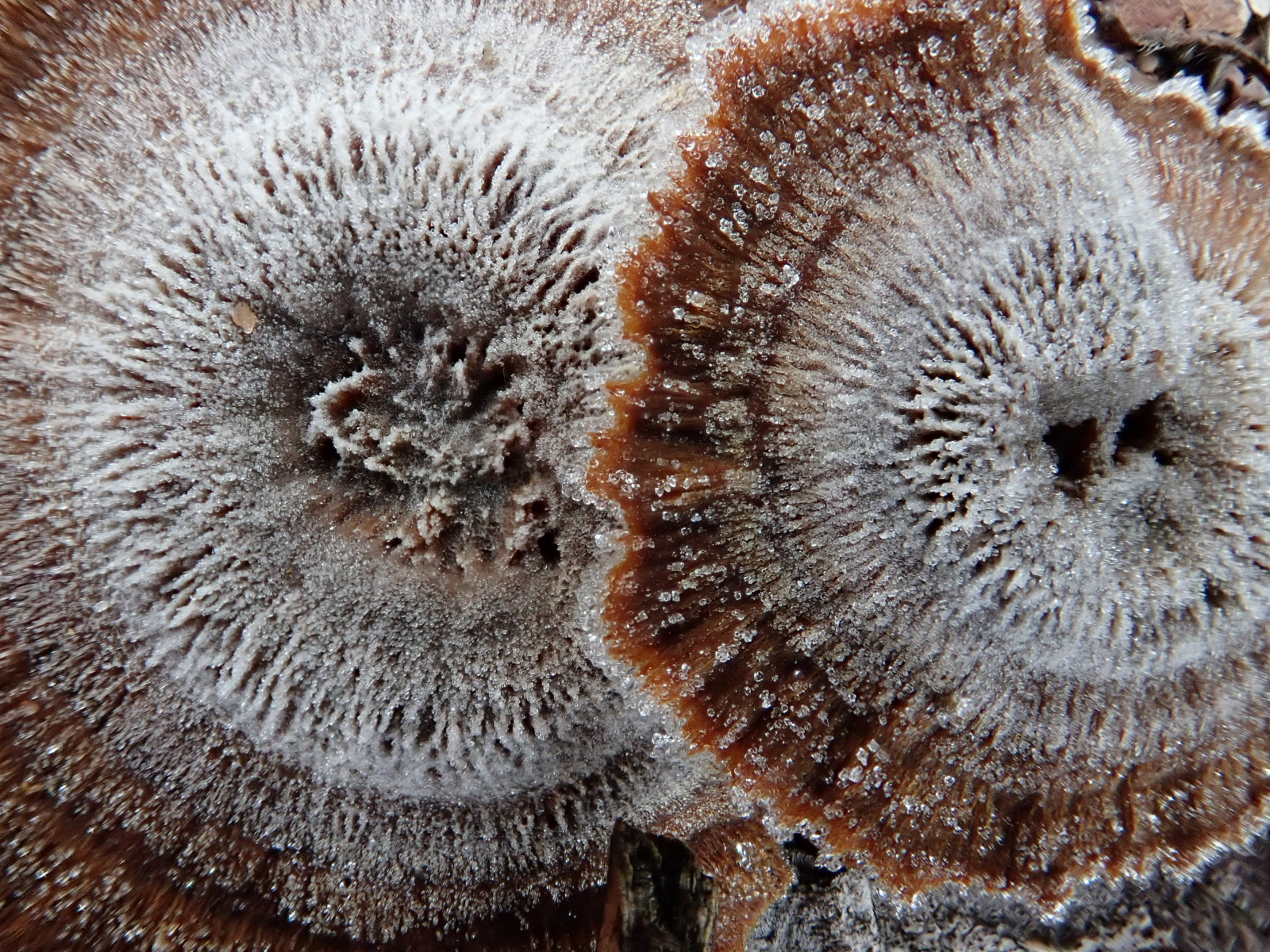 Am Morgen herrschte noch Frost. Die Dauerporlinge (Coltricia perennis) hatten sich mit glitzernden Kristallen geschmückt, die Kohle-Schüpplinge ebenso.