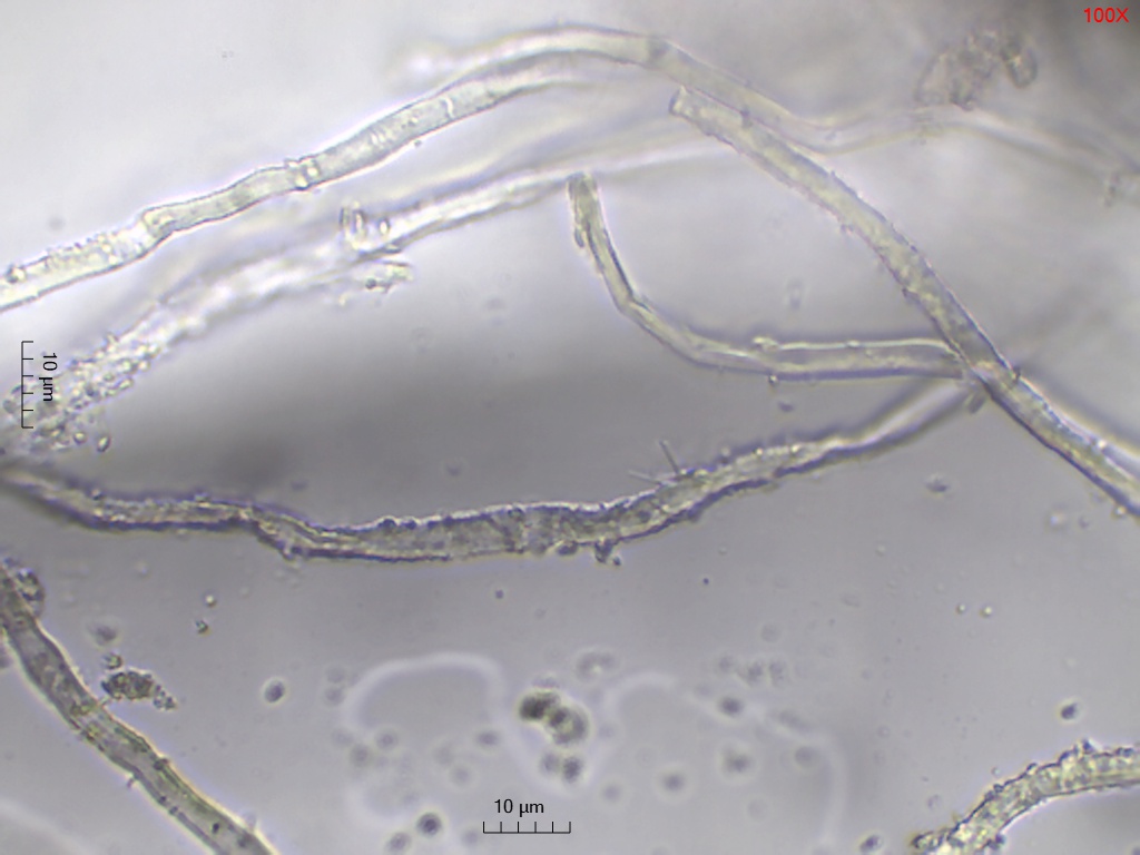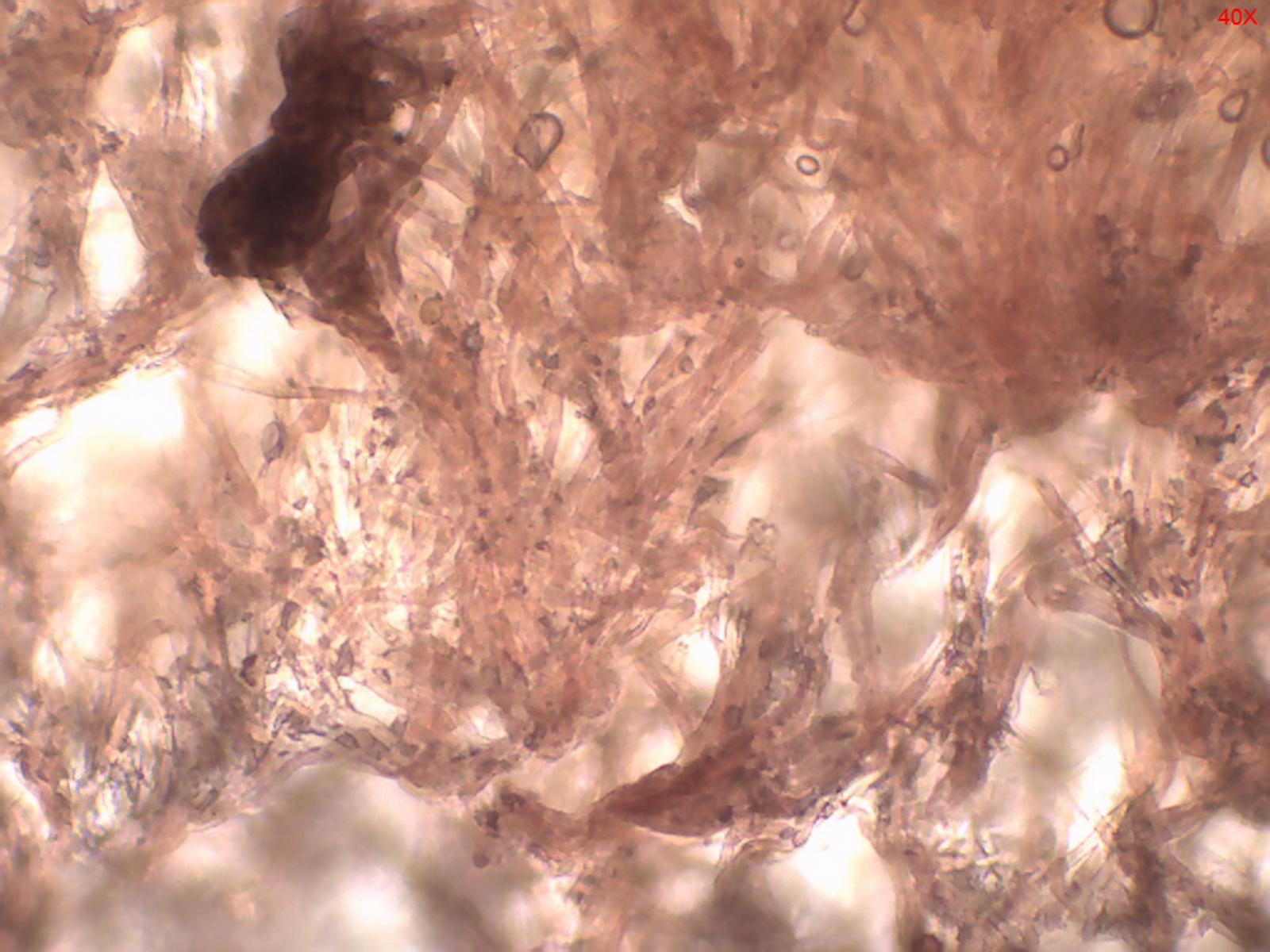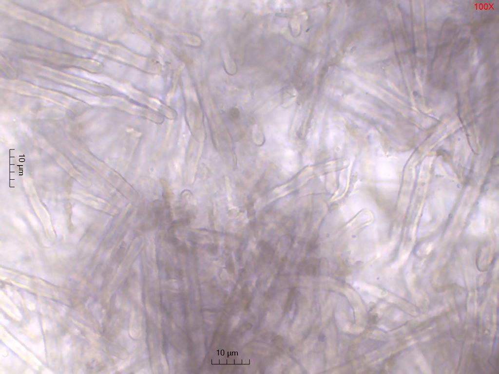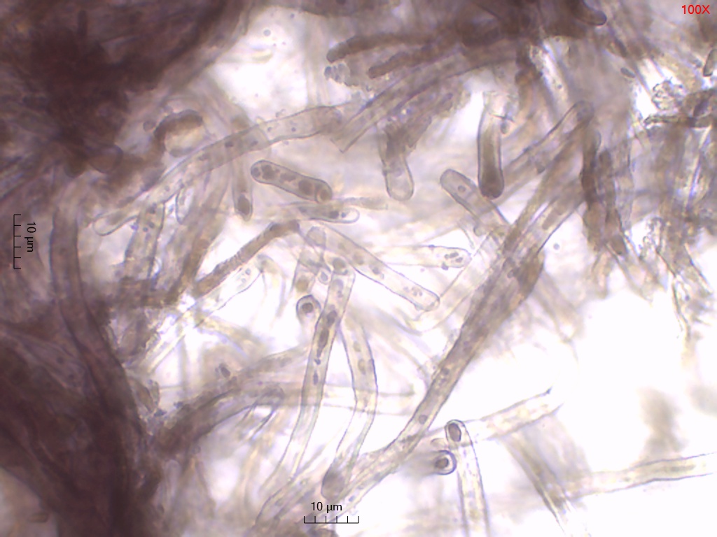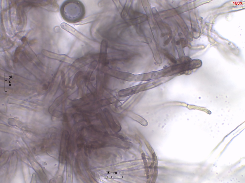 Ich füge mal einige Bilder bei. Bei meiner Mikroskopie habe ich violette Substanzen in und außerhalb der Hyphen gefunden. Bei einem war schon das Primordium entsprechend gefärbt. Soweit ich sehe keine Fremdhyphen, nur Skelett- und Bindehyphen. Daedalea quercina ist trimitisch, Bernicchia schreibt in Polypores of the Mediteranean Region, dass die generativen Hyphen nur schwer zu finden sein.