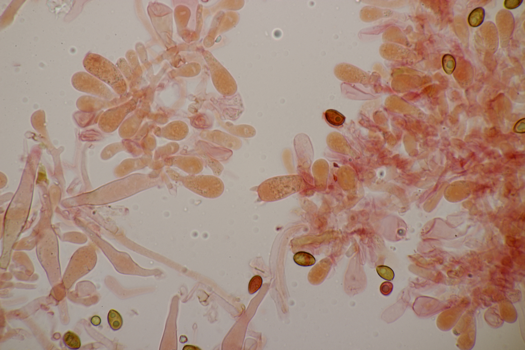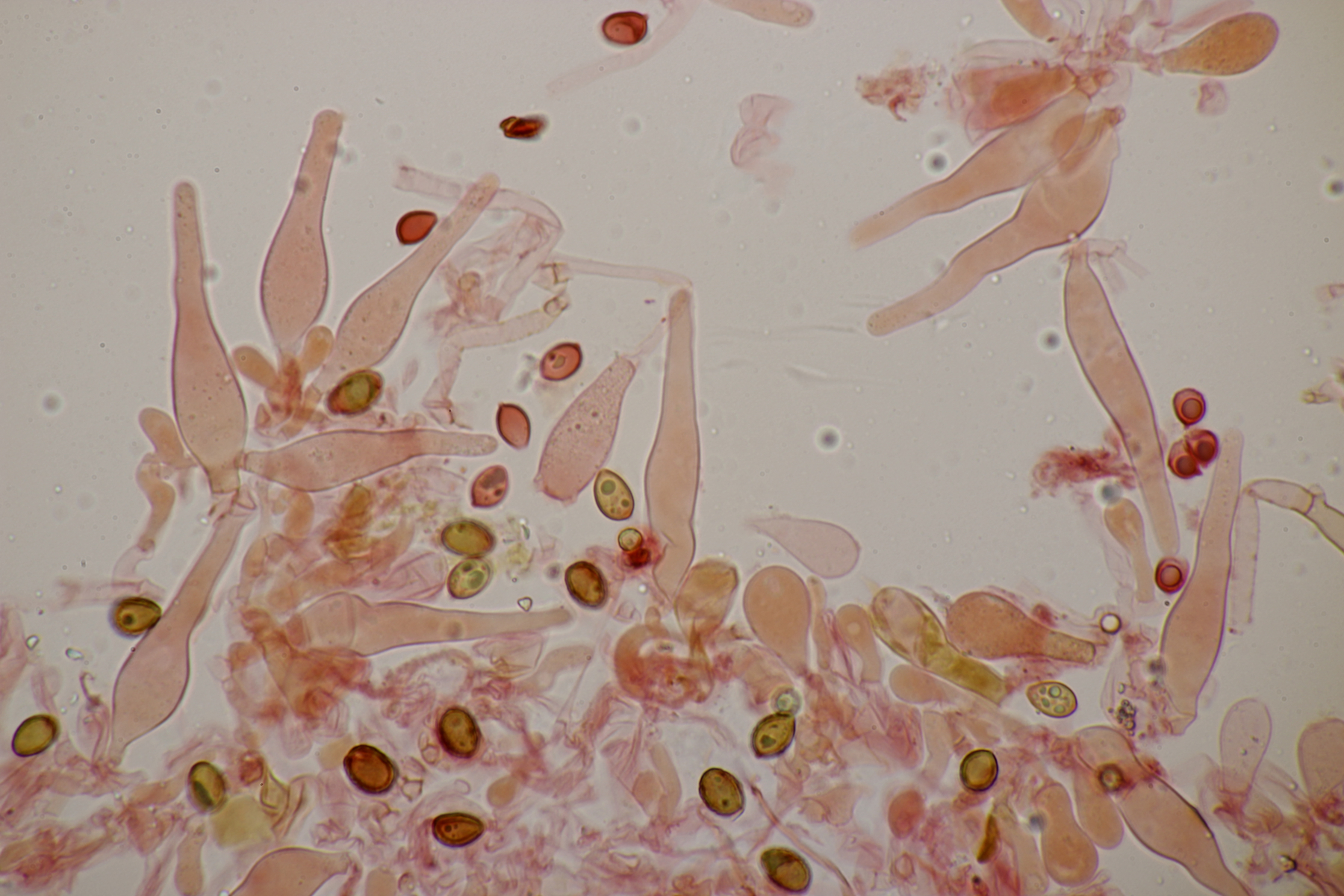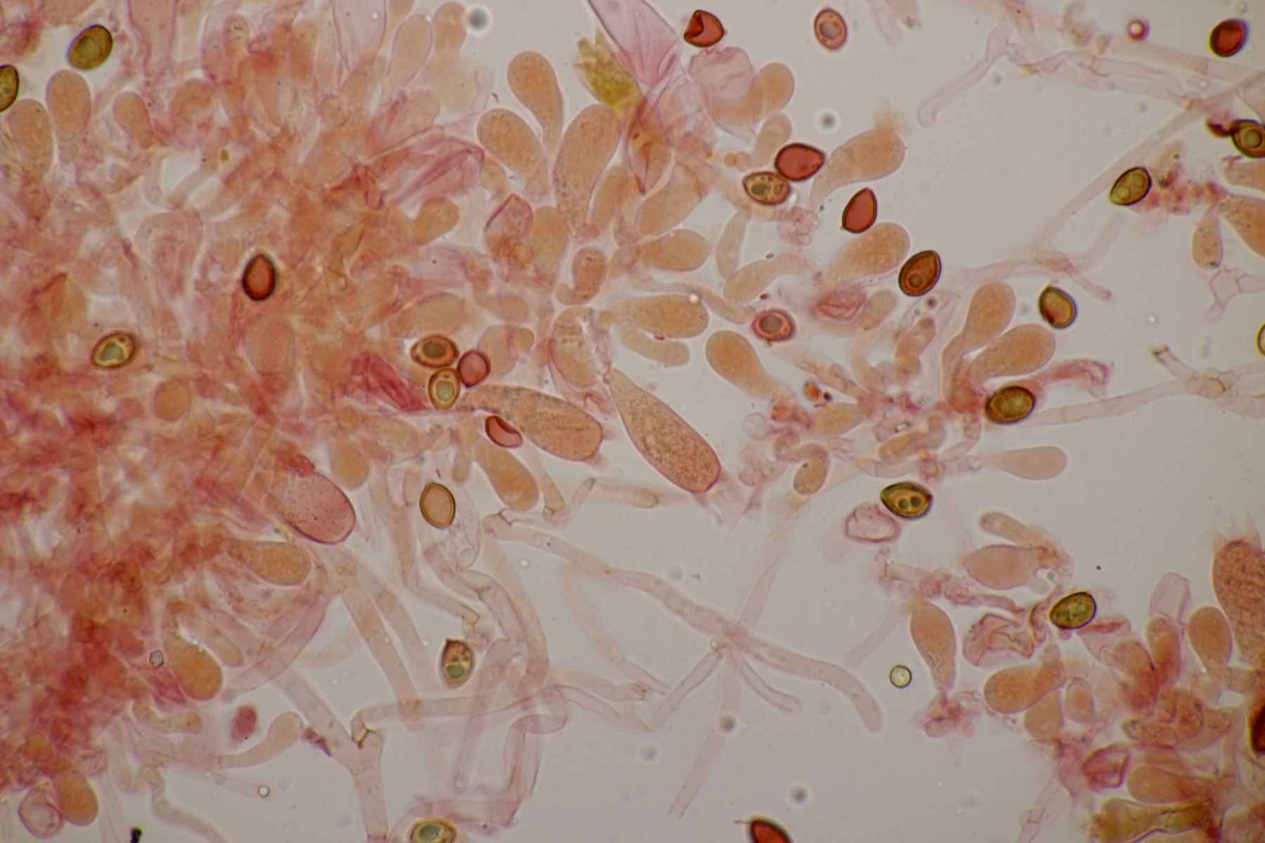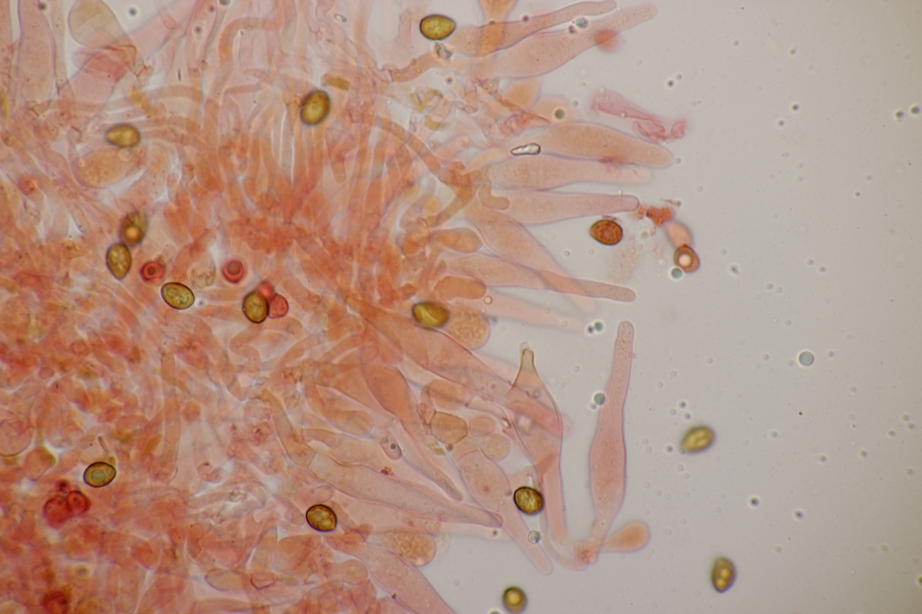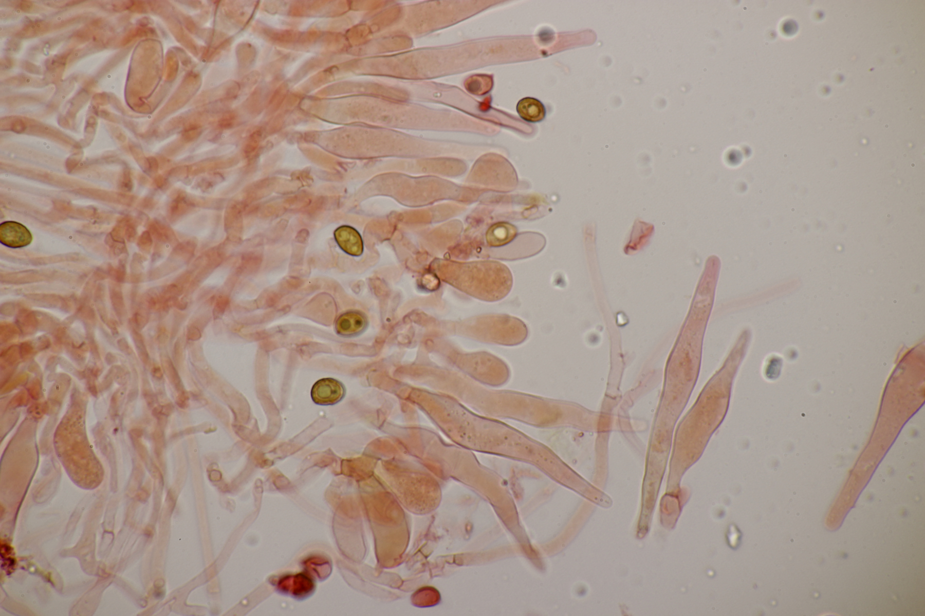 2. Galerinchen gab es auch. Diese hier haben Schnallen, dünnwandige Pleurozystiden, keine Velumsreste am Stiel, die Sporen sind ornamentiert und messen (8.5+-0.5) µm x (5.6+-0.2) µm, Q=1.5+-0.1 bzw. (7.9-10.0) µm x (5.1-5.9) µm, Q=1.4-1.7, sind dextrinoid. Pileozystiden habe ich keine gefunden, so daß ich mit den 4-sporigen Basidien dann bei Galerina vittiformis var. vittiformis lande. Was sagen die Experten dazu?