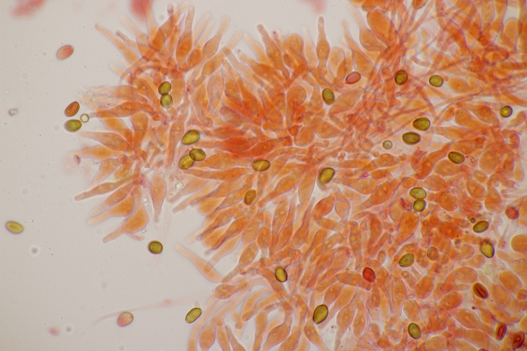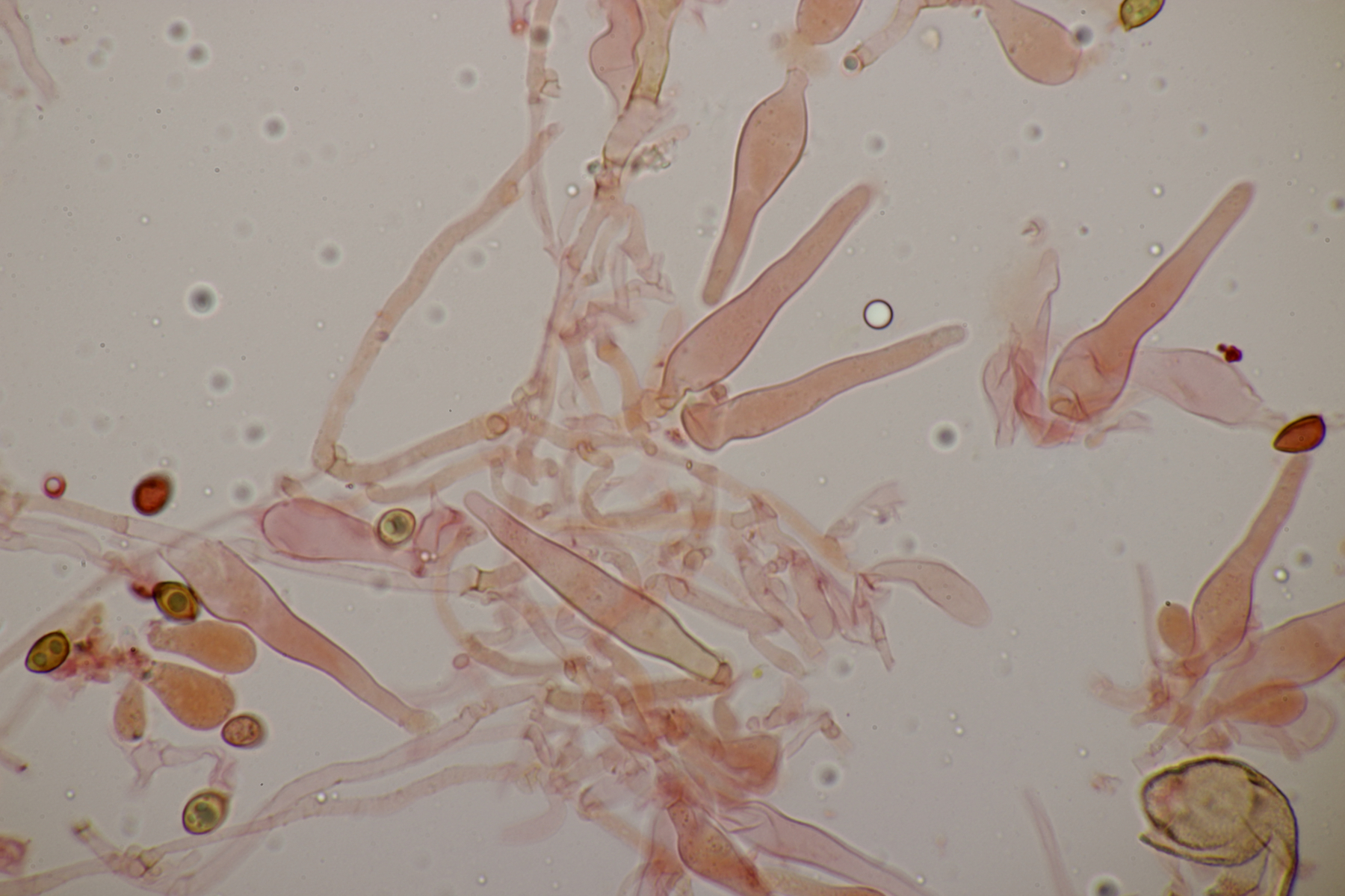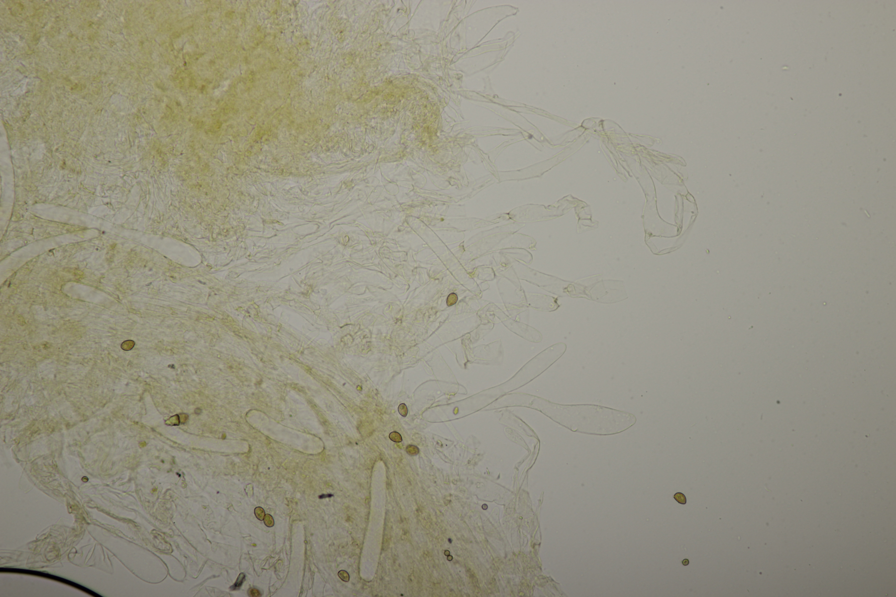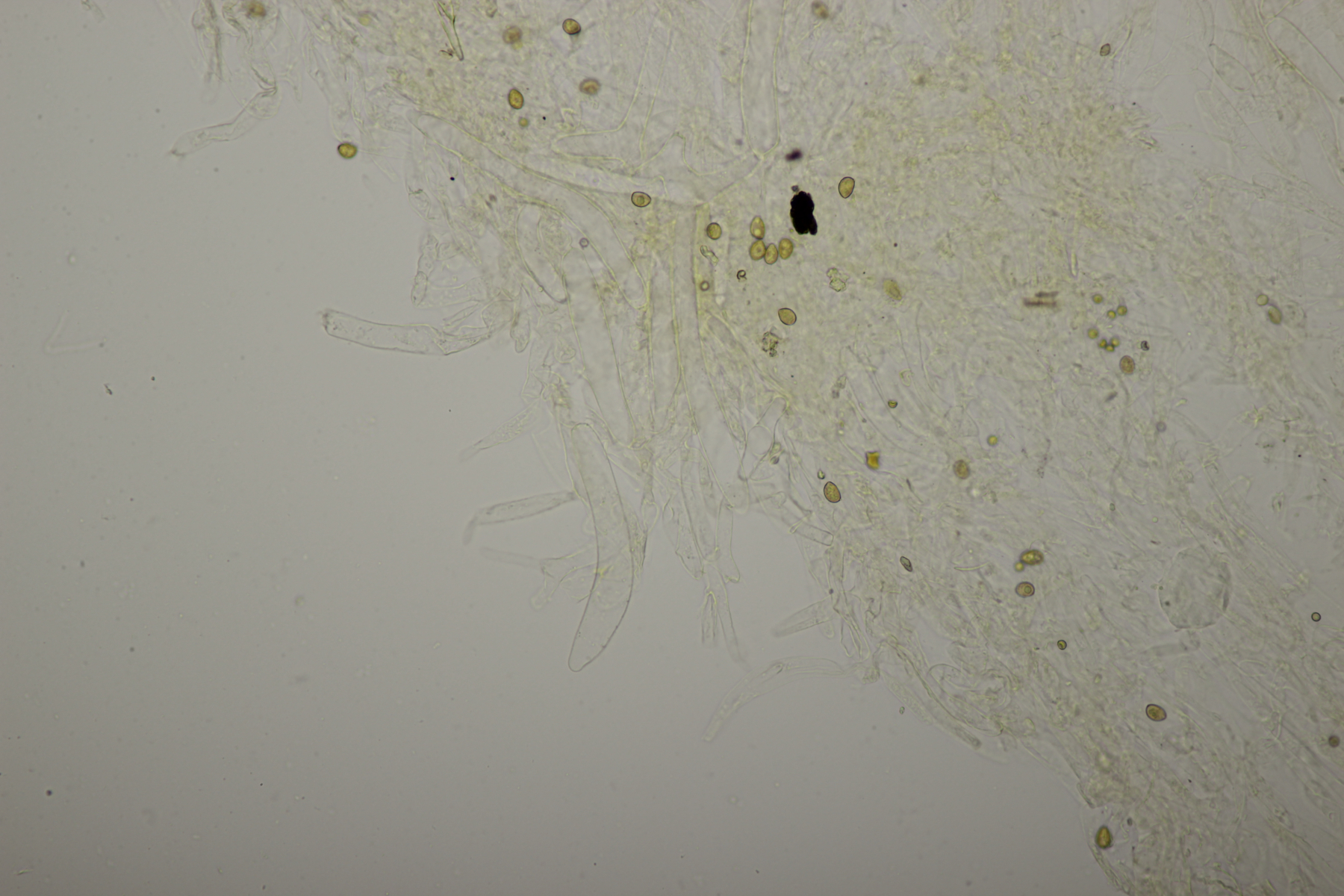 2. Galerinchen gab es auch. Diese hier haben Schnallen, dünnwandige Pleurozystiden, keine Velumsreste am Stiel, die Sporen sind ornamentiert und messen (8.5+-0.5) µm x (5.6+-0.2) µm, Q=1.5+-0.1 bzw. (7.9-10.0) µm x (5.1-5.9) µm, Q=1.4-1.7, sind dextrinoid. Pileozystiden habe ich keine gefunden, so daß ich mit den 4-sporigen Basidien dann bei Galerina vittiformis var. vittiformis lande. Was sagen die Experten dazu?