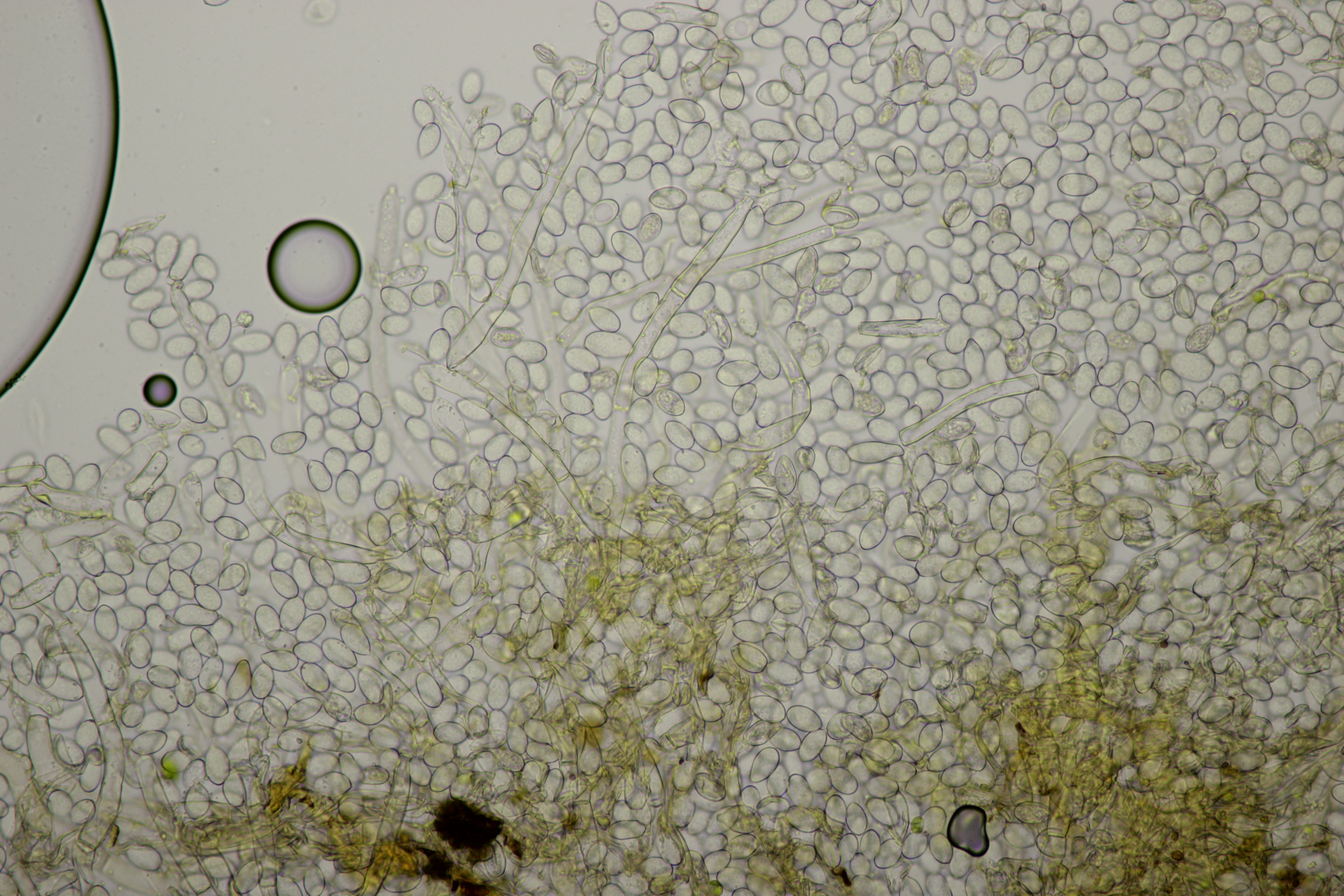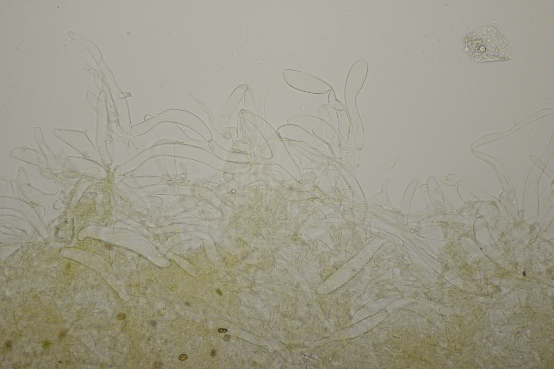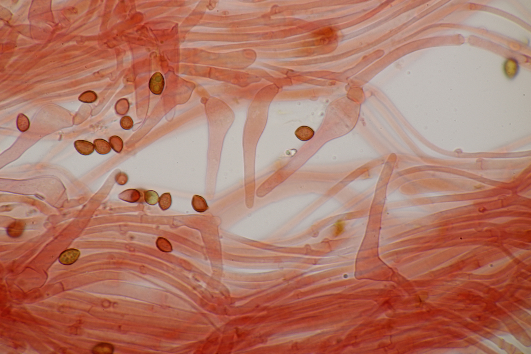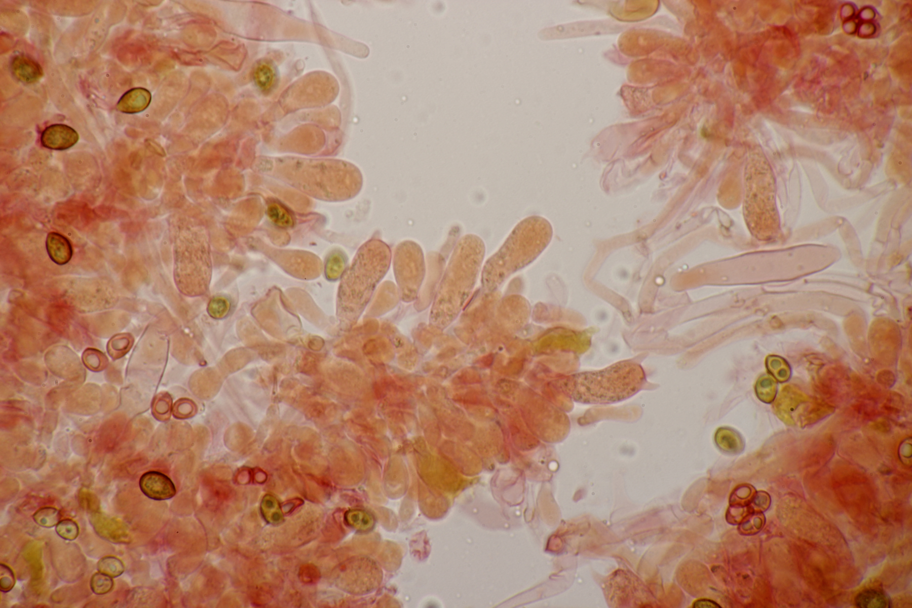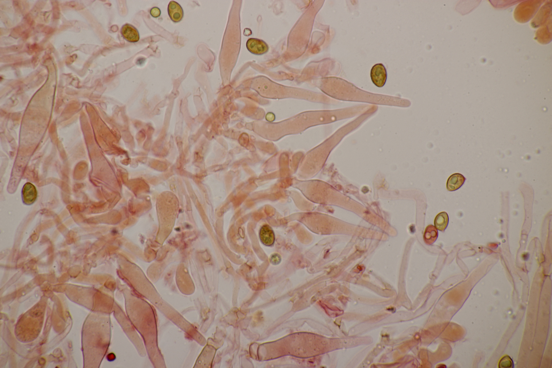 2. Galerinchen gab es auch. Diese hier haben Schnallen, dünnwandige Pleurozystiden, keine Velumsreste am Stiel, die Sporen sind ornamentiert und messen (8.5+-0.5) µm x (5.6+-0.2) µm, Q=1.5+-0.1 bzw. (7.9-10.0) µm x (5.1-5.9) µm, Q=1.4-1.7, sind dextrinoid. Pileozystiden habe ich keine gefunden, so daß ich mit den 4-sporigen Basidien dann bei Galerina vittiformis var. vittiformis lande. Was sagen die Experten dazu?