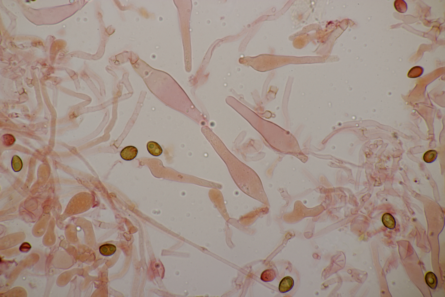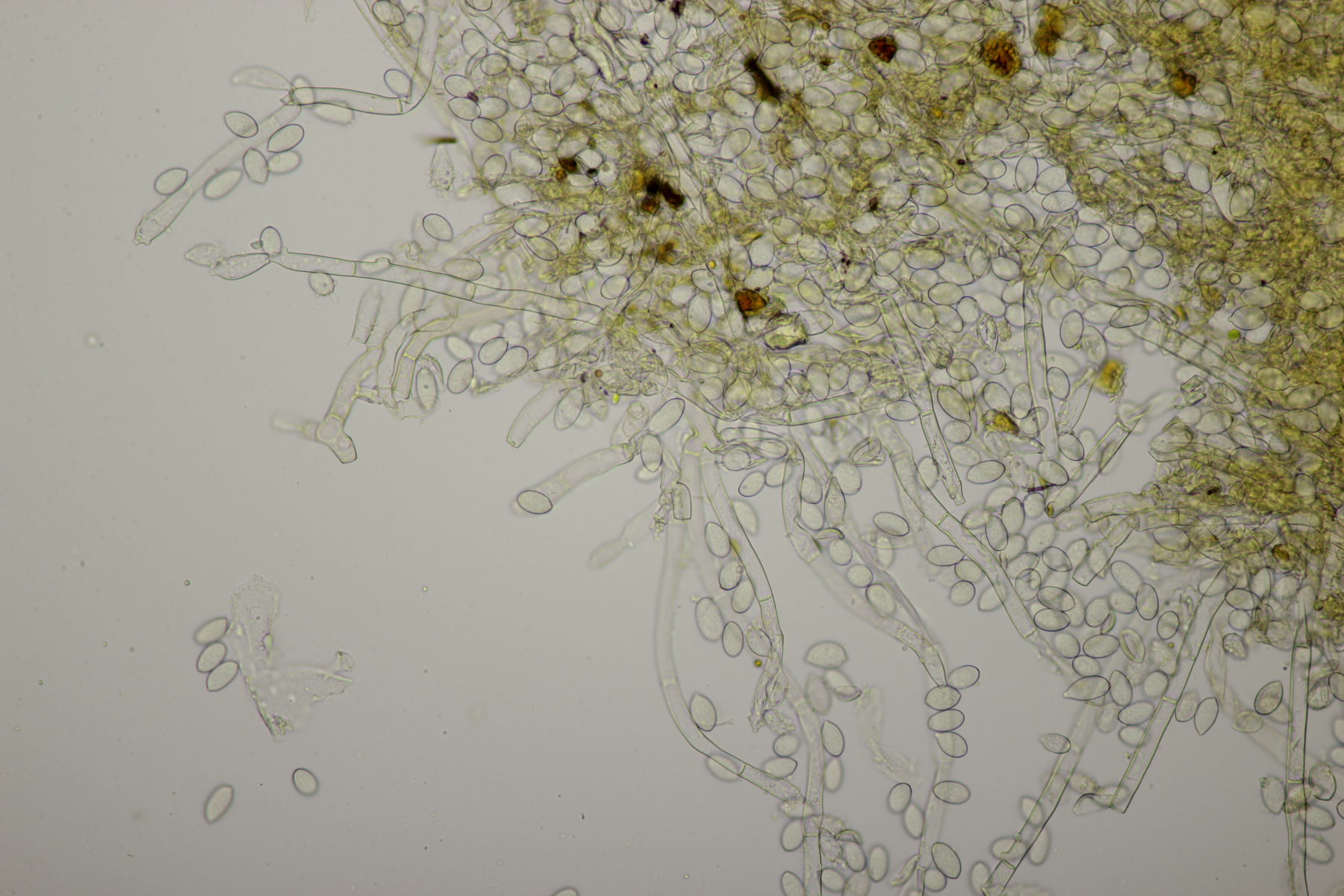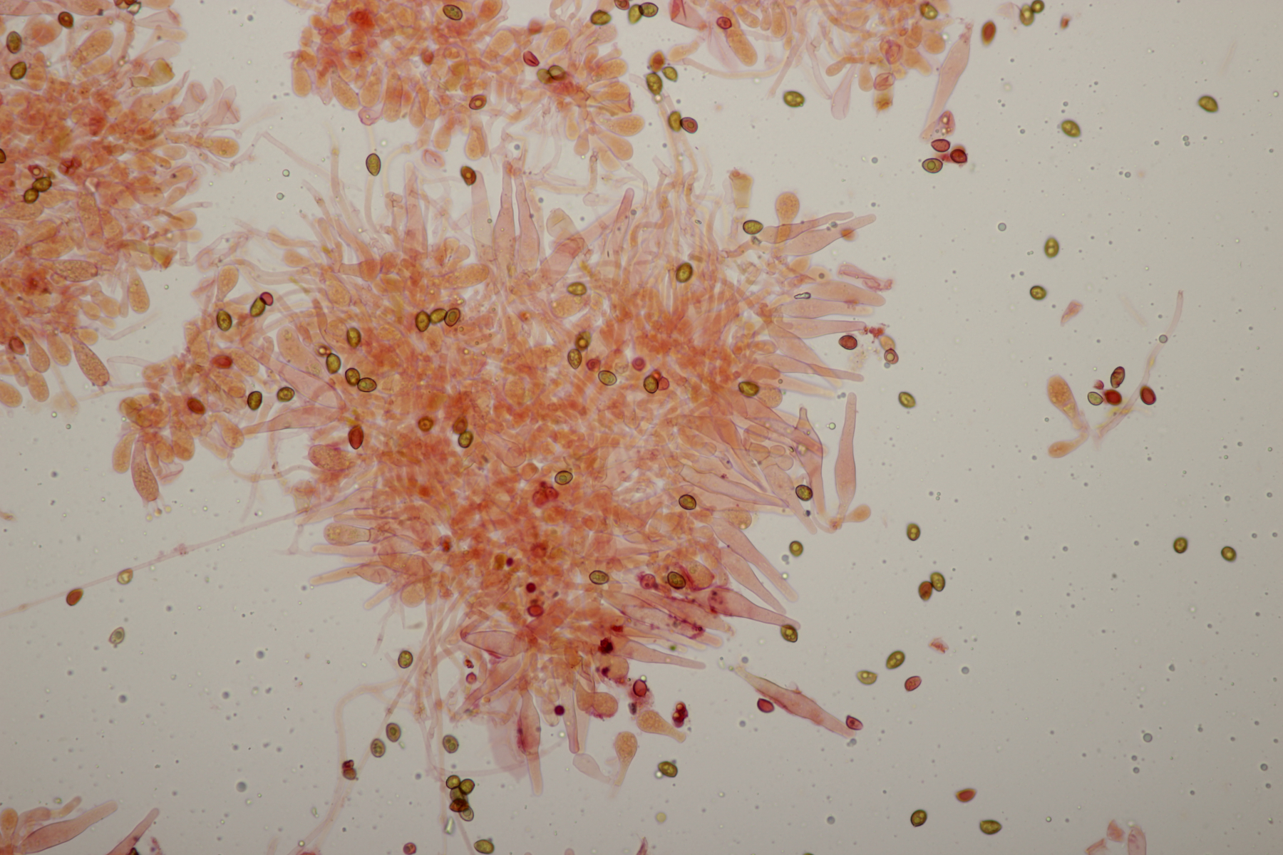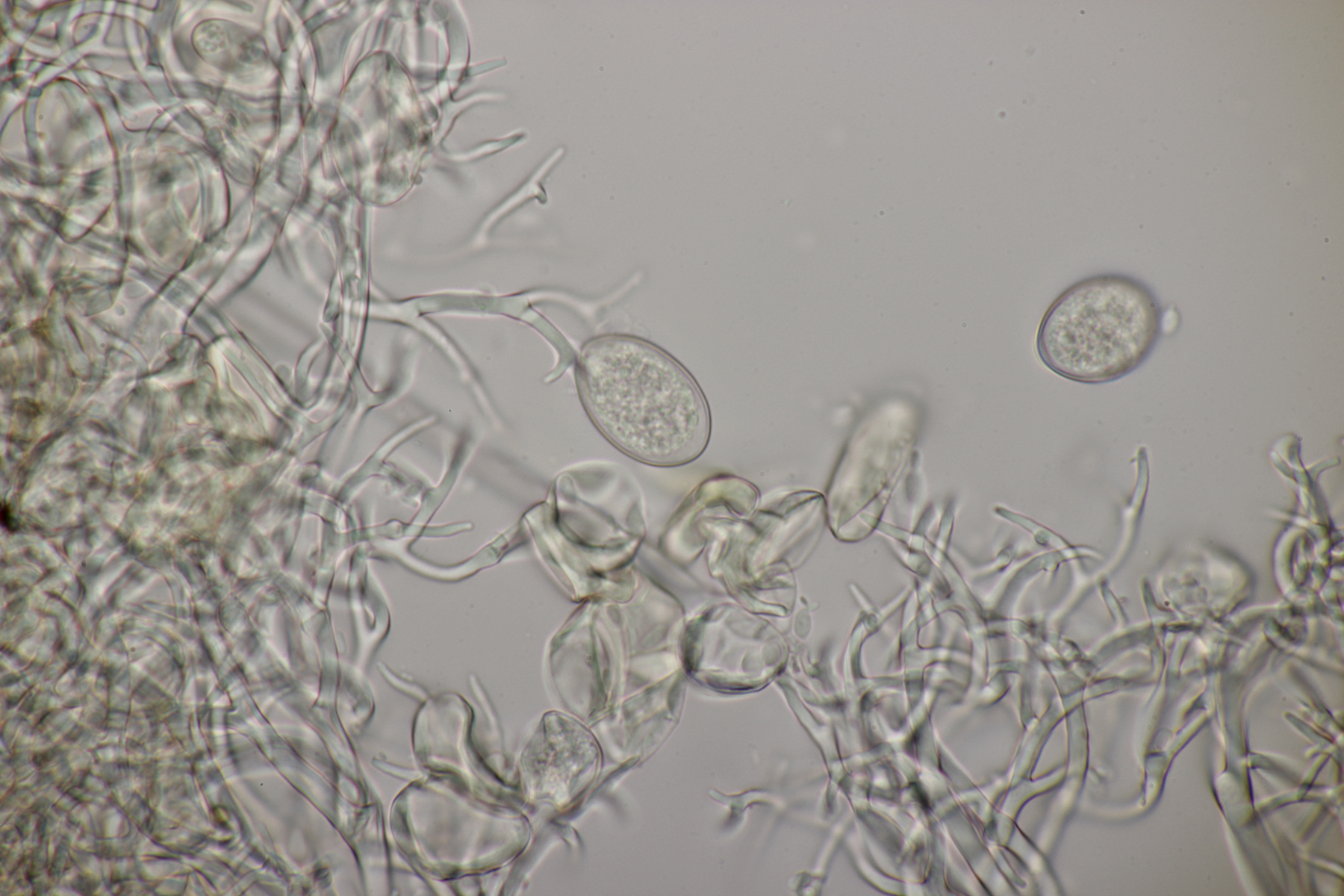 2. Galerinchen gab es auch. Diese hier haben Schnallen, dünnwandige Pleurozystiden, keine Velumsreste am Stiel, die Sporen sind ornamentiert und messen (8.5+-0.5) µm x (5.6+-0.2) µm, Q=1.5+-0.1 bzw. (7.9-10.0) µm x (5.1-5.9) µm, Q=1.4-1.7, sind dextrinoid. Pileozystiden habe ich keine gefunden, so daß ich mit den 4-sporigen Basidien dann bei Galerina vittiformis var. vittiformis lande. Was sagen die Experten dazu?