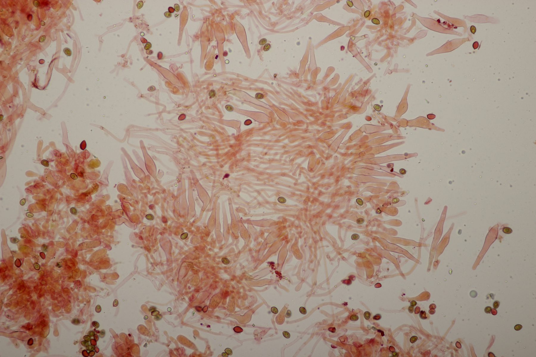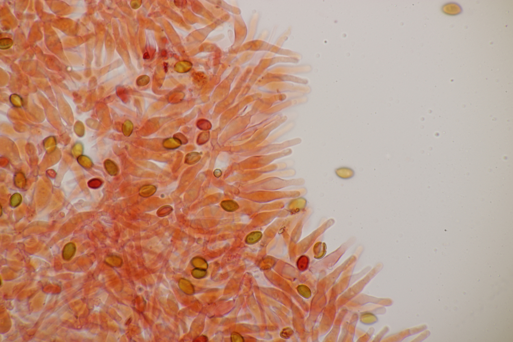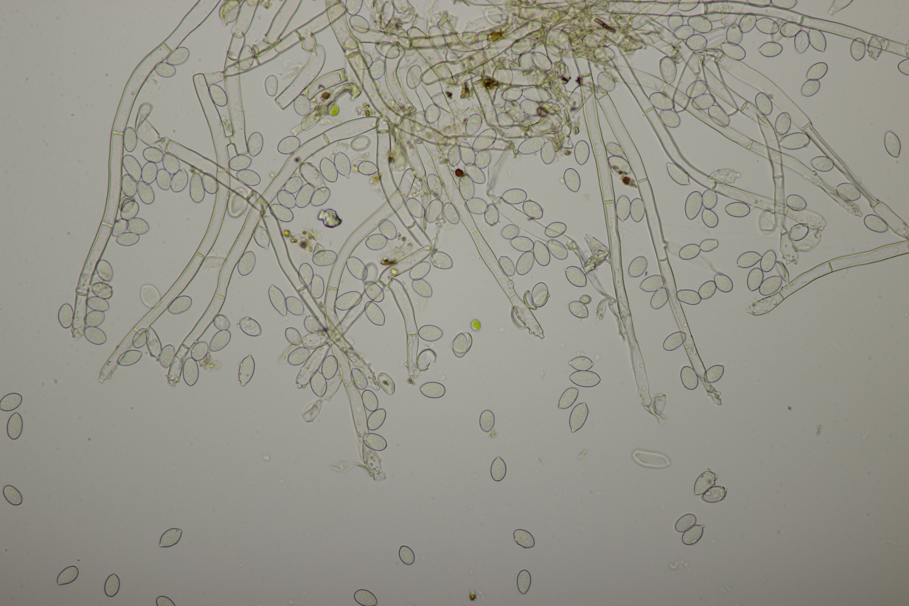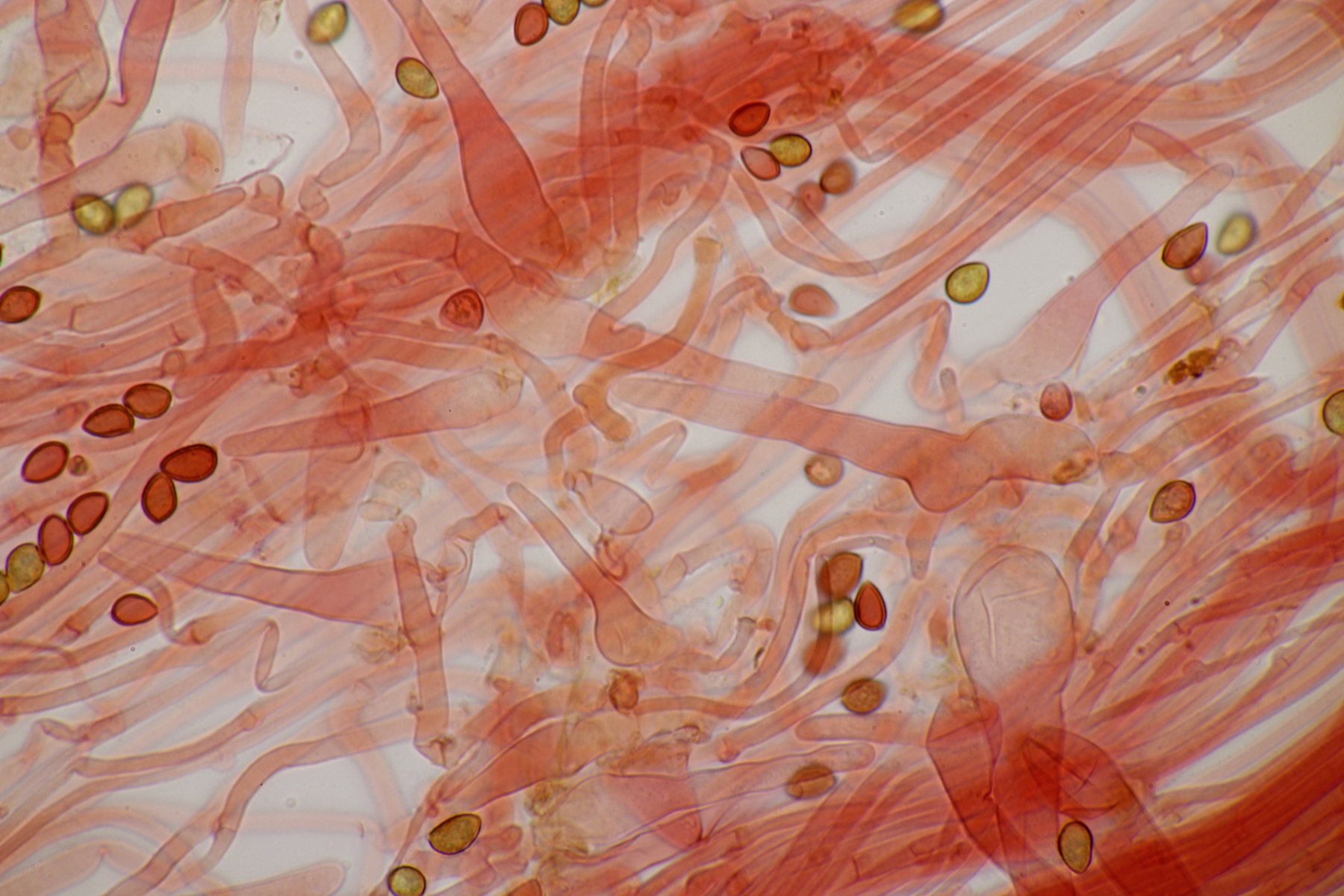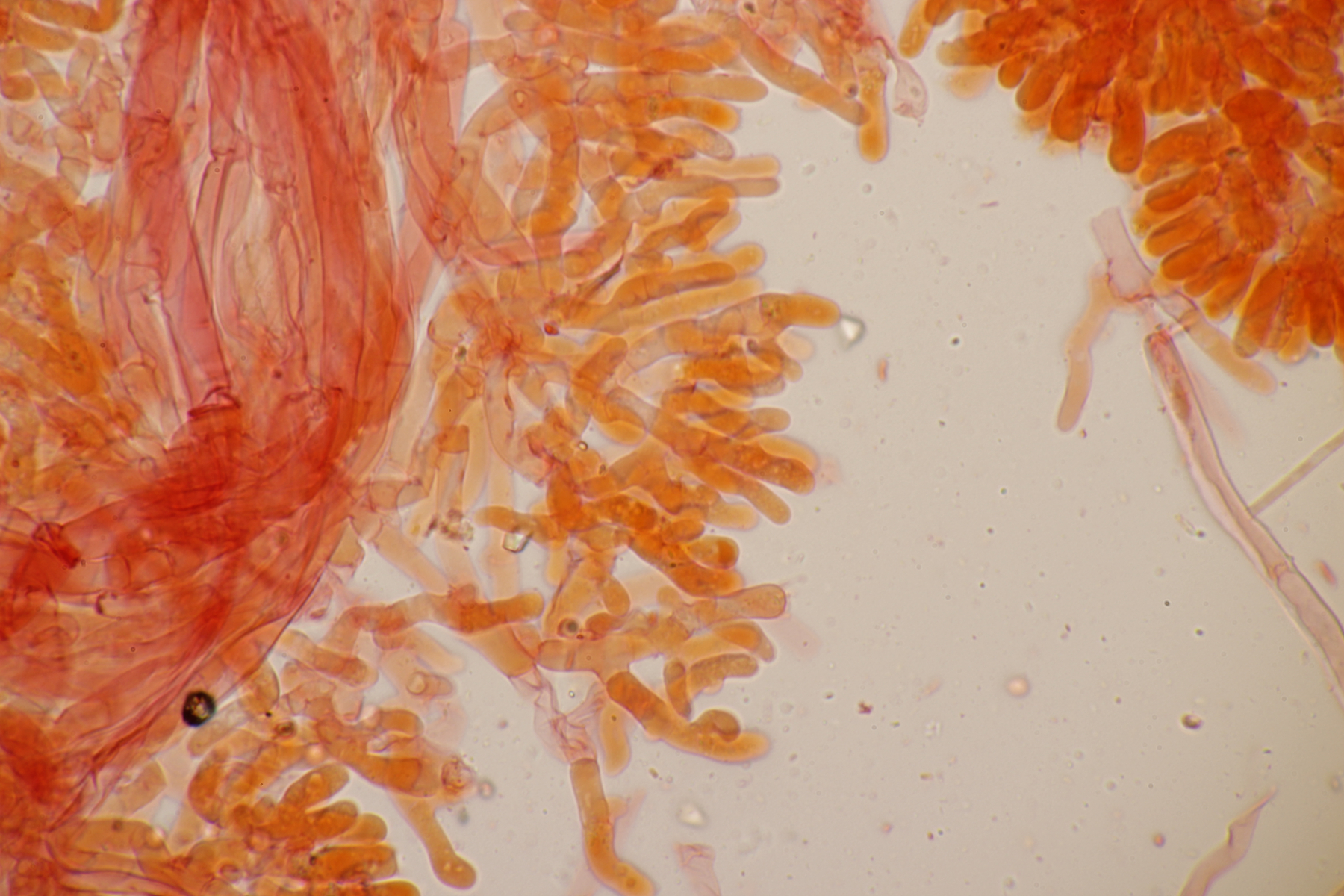 2. Galerinchen gab es auch. Diese hier haben Schnallen, dünnwandige Pleurozystiden, keine Velumsreste am Stiel, die Sporen sind ornamentiert und messen (8.5+-0.5) µm x (5.6+-0.2) µm, Q=1.5+-0.1 bzw. (7.9-10.0) µm x (5.1-5.9) µm, Q=1.4-1.7, sind dextrinoid. Pileozystiden habe ich keine gefunden, so daß ich mit den 4-sporigen Basidien dann bei Galerina vittiformis var. vittiformis lande. Was sagen die Experten dazu?