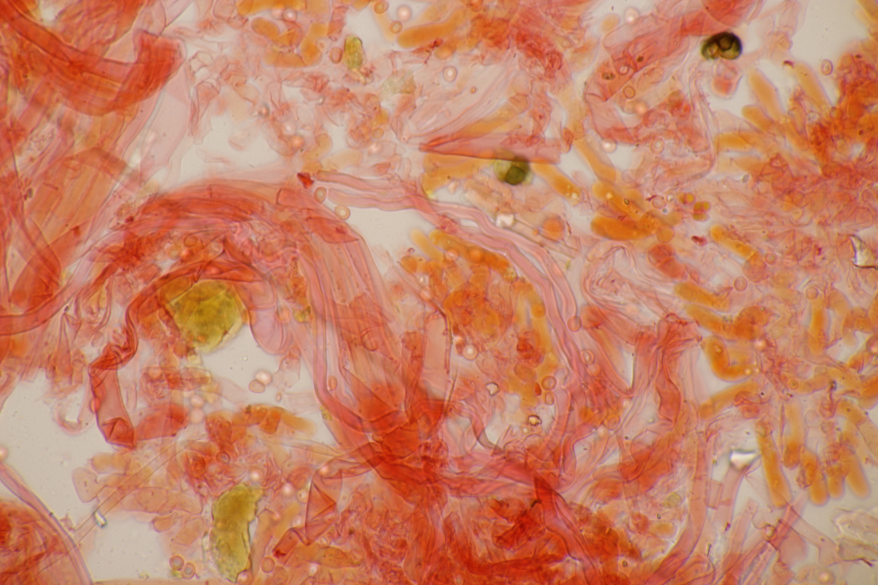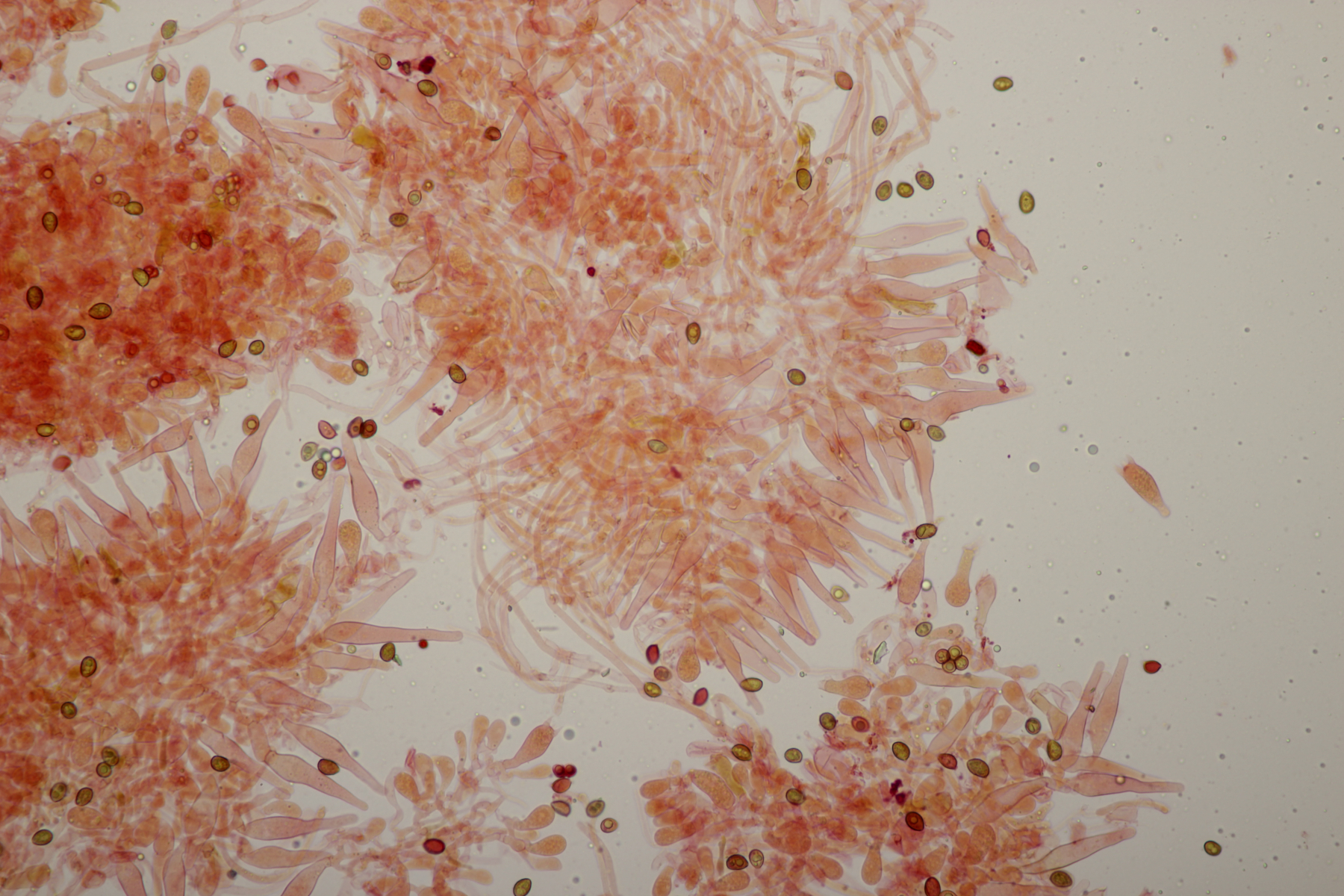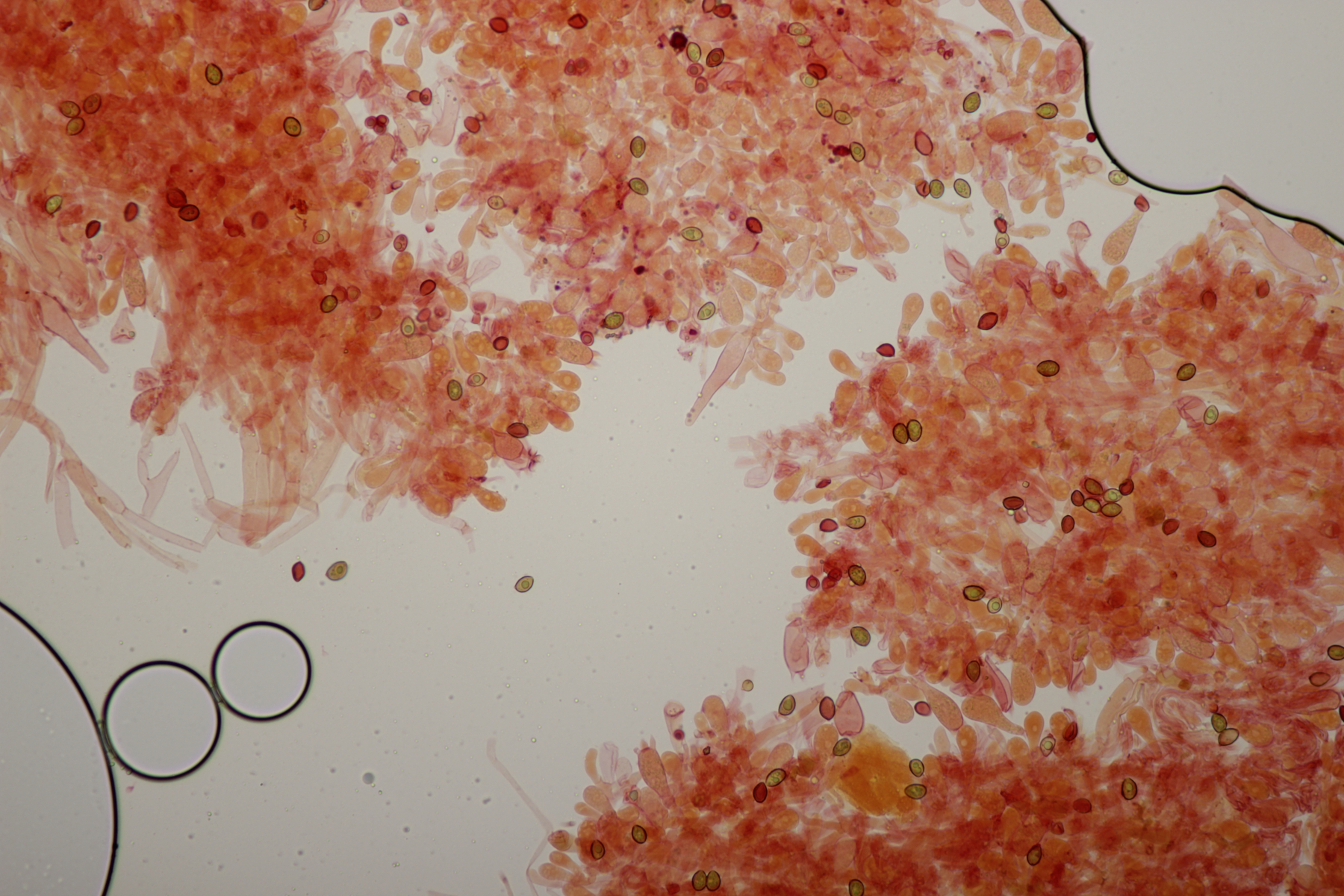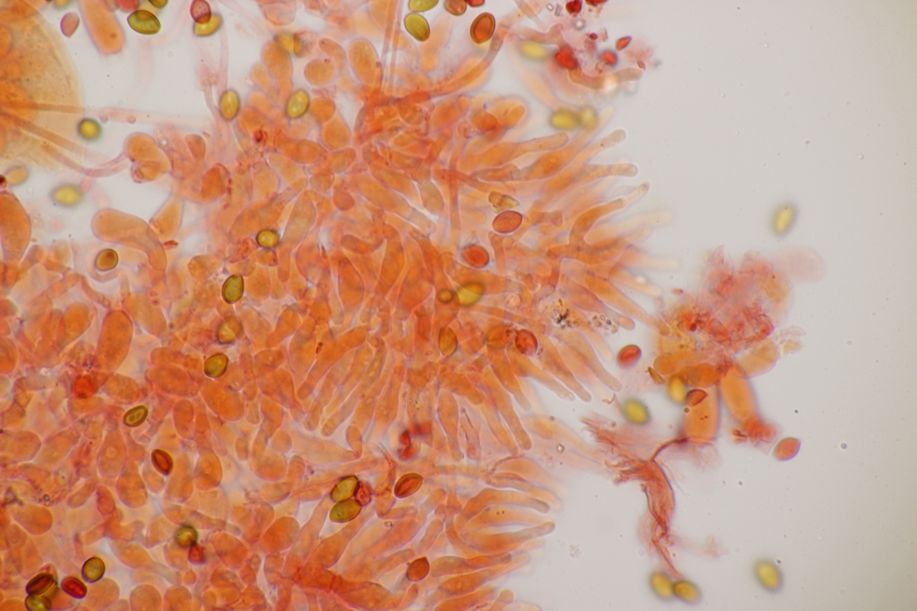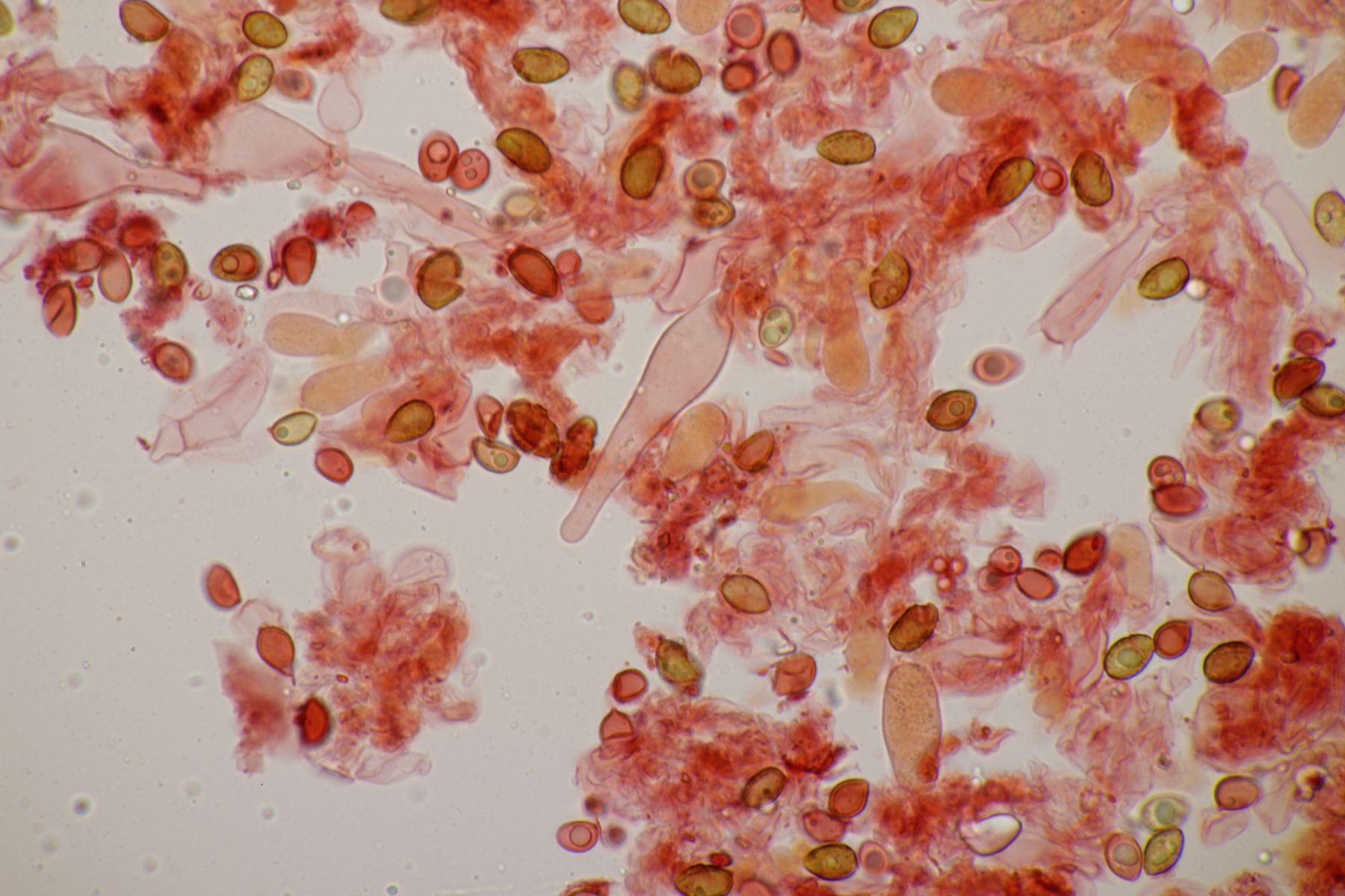 2. Galerinchen gab es auch. Diese hier haben Schnallen, dünnwandige Pleurozystiden, keine Velumsreste am Stiel, die Sporen sind ornamentiert und messen (8.5+-0.5) µm x (5.6+-0.2) µm, Q=1.5+-0.1 bzw. (7.9-10.0) µm x (5.1-5.9) µm, Q=1.4-1.7, sind dextrinoid. Pileozystiden habe ich keine gefunden, so daß ich mit den 4-sporigen Basidien dann bei Galerina vittiformis var. vittiformis lande. Was sagen die Experten dazu?