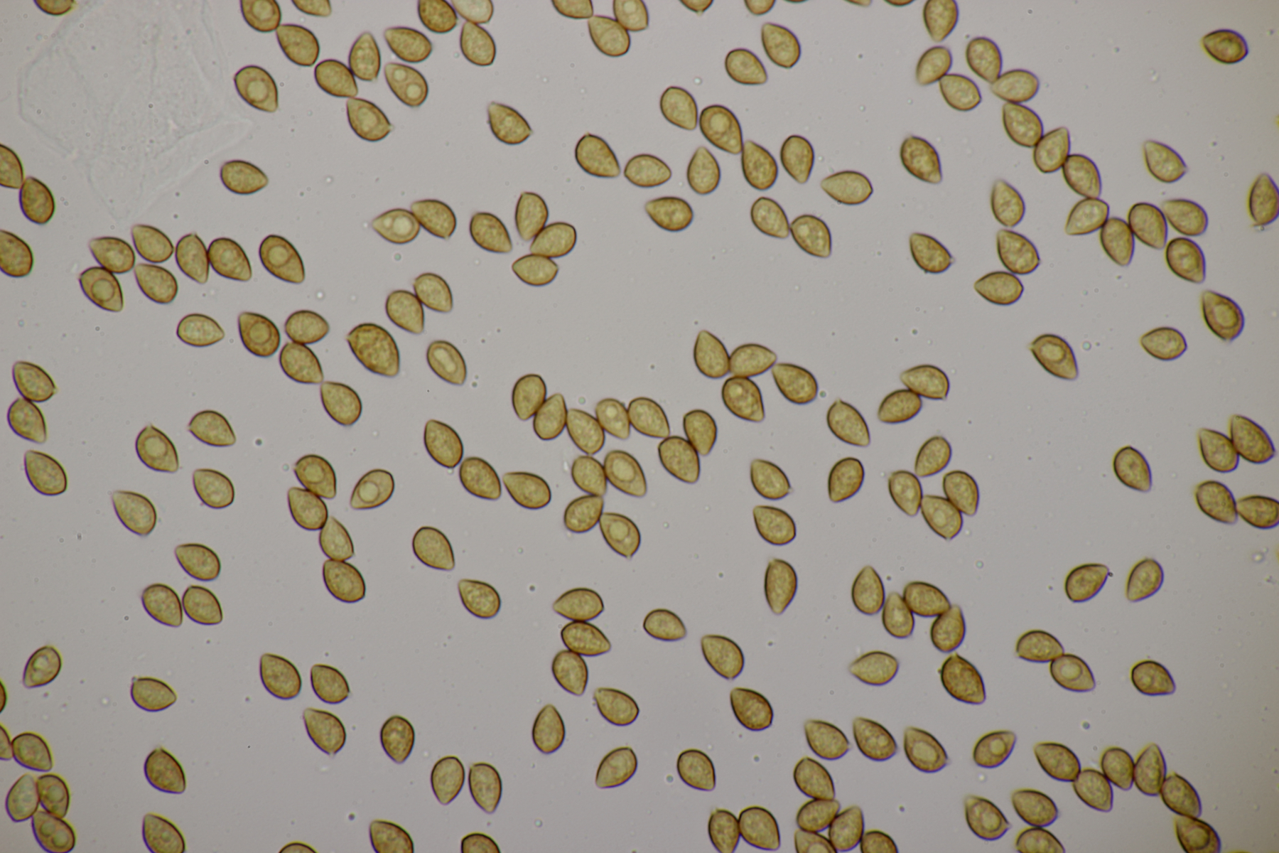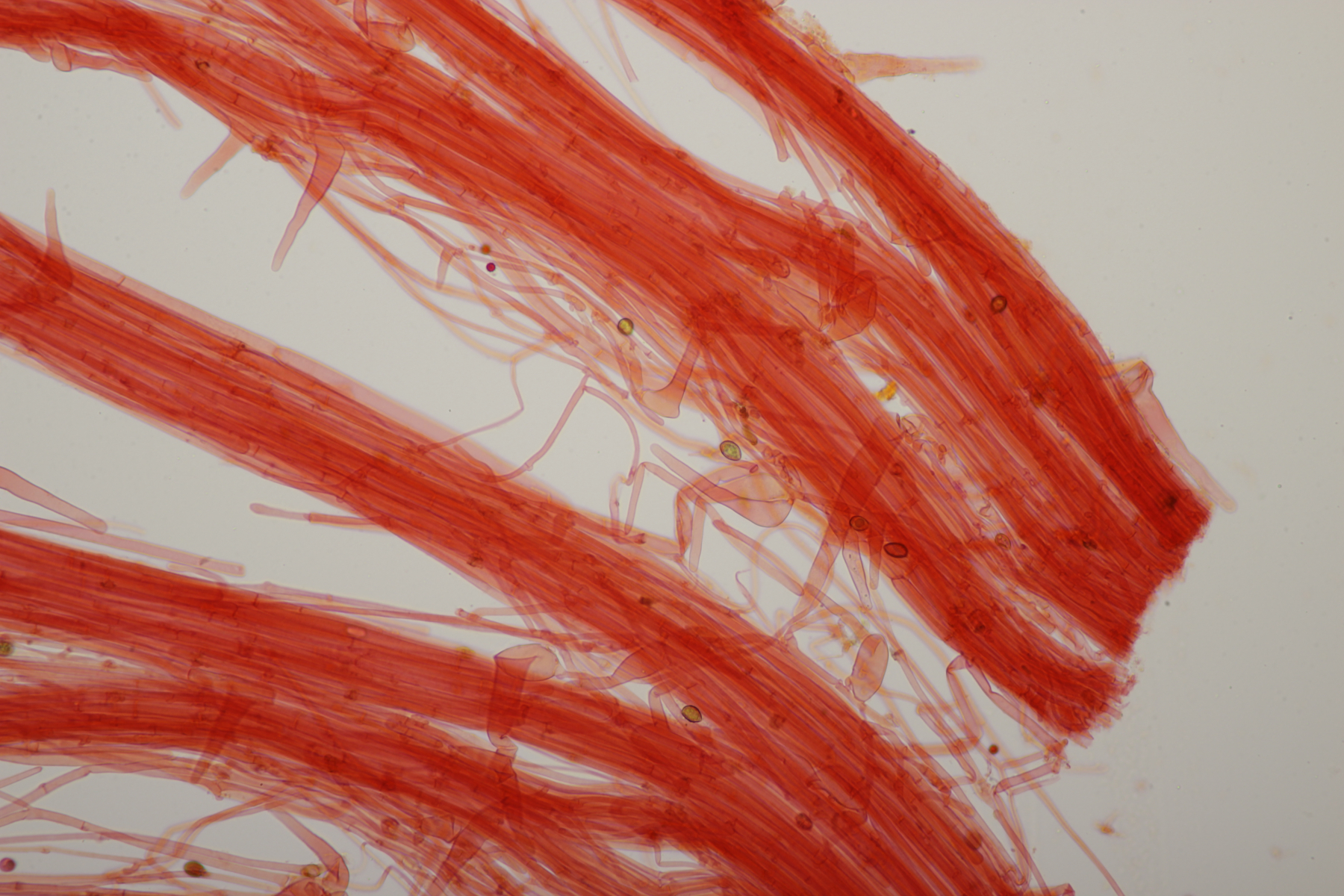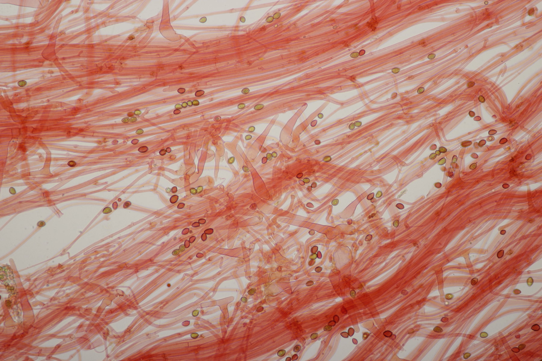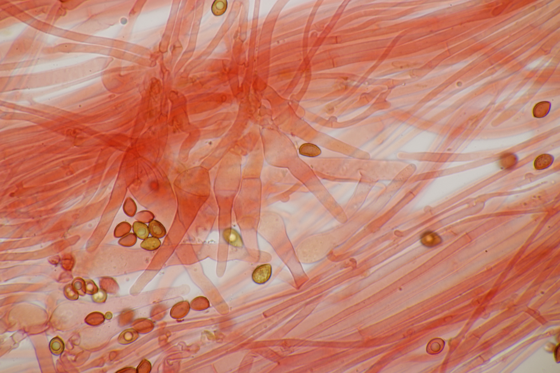 2. Galerinchen gab es auch. Diese hier haben Schnallen, dünnwandige Pleurozystiden, keine Velumsreste am Stiel, die Sporen sind ornamentiert und messen (8.5+-0.5) µm x (5.6+-0.2) µm, Q=1.5+-0.1 bzw. (7.9-10.0) µm x (5.1-5.9) µm, Q=1.4-1.7, sind dextrinoid. Pileozystiden habe ich keine gefunden, so daß ich mit den 4-sporigen Basidien dann bei Galerina vittiformis var. vittiformis lande. Was sagen die Experten dazu?