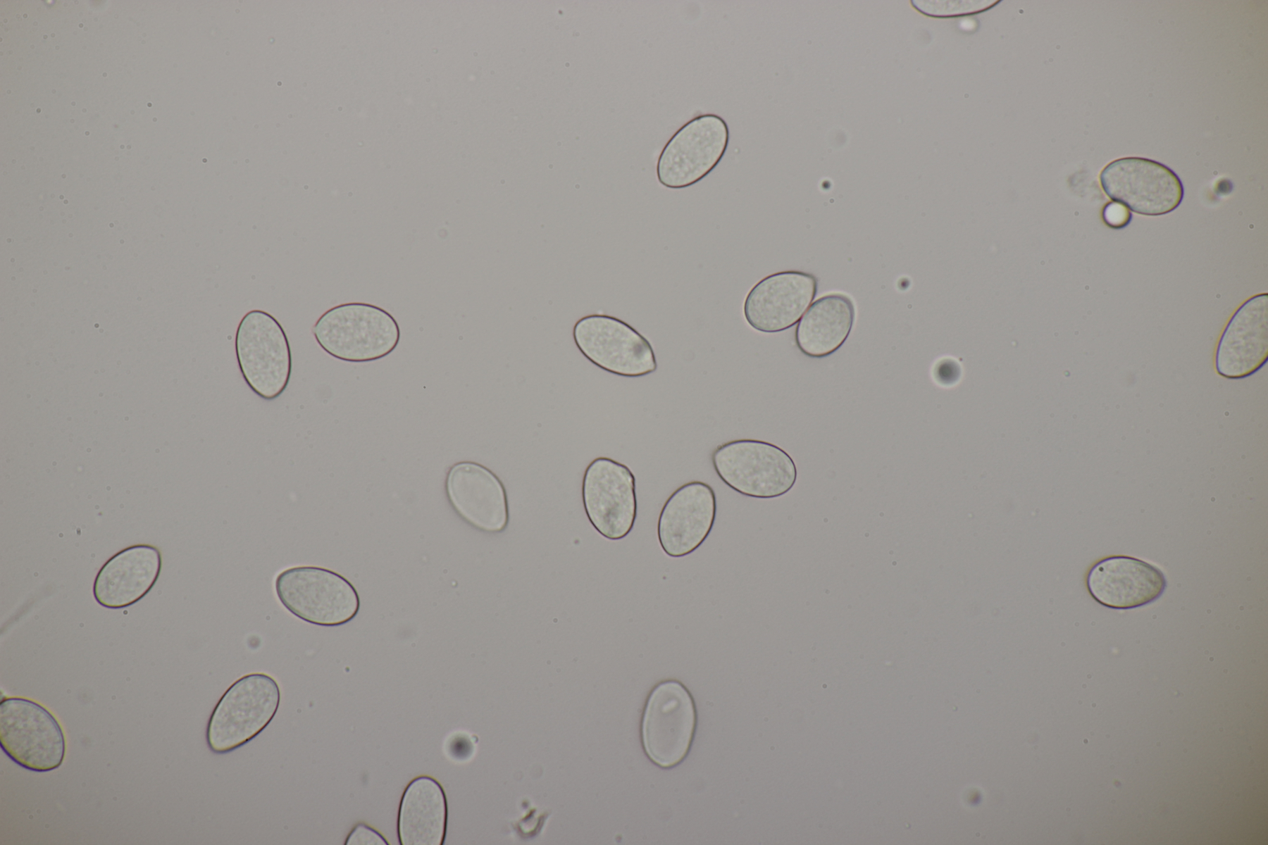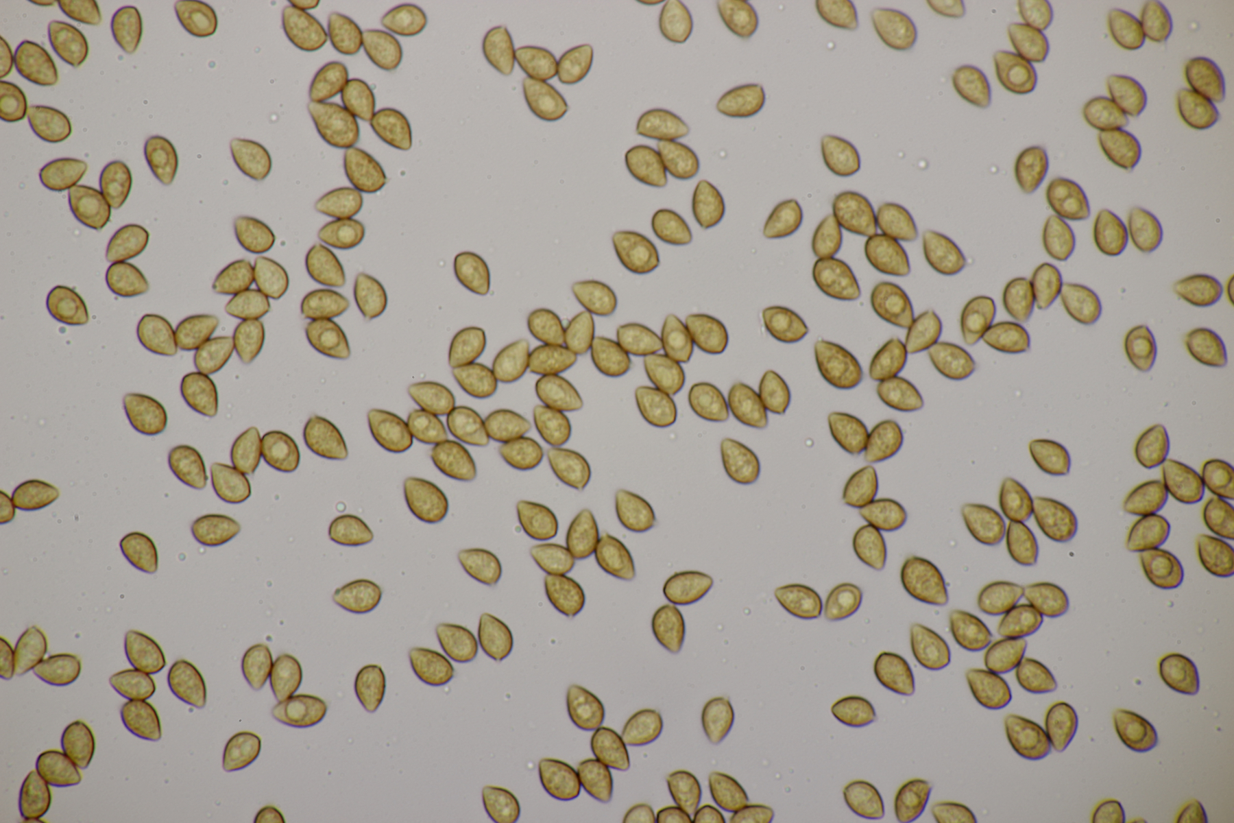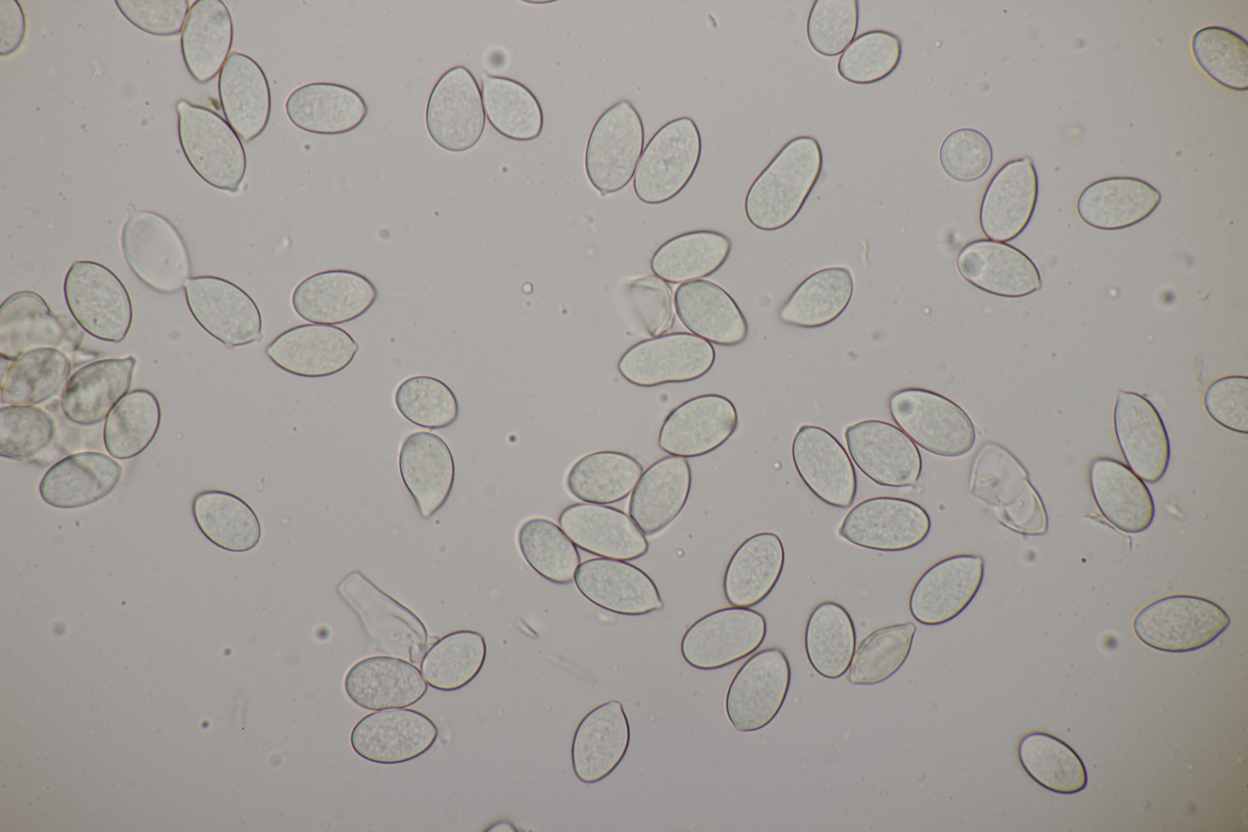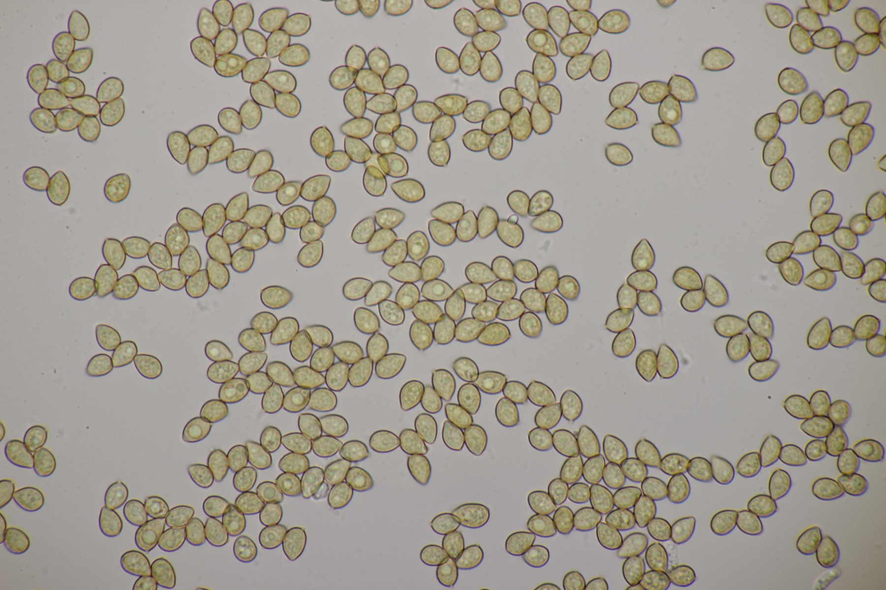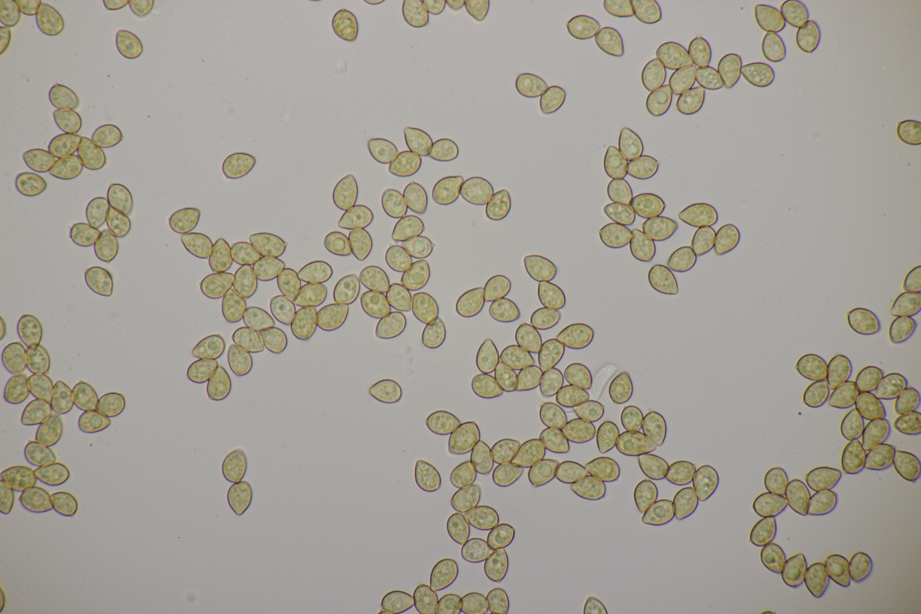 2. Galerinchen gab es auch. Diese hier haben Schnallen, dünnwandige Pleurozystiden, keine Velumsreste am Stiel, die Sporen sind ornamentiert und messen (8.5+-0.5) µm x (5.6+-0.2) µm, Q=1.5+-0.1 bzw. (7.9-10.0) µm x (5.1-5.9) µm, Q=1.4-1.7, sind dextrinoid. Pileozystiden habe ich keine gefunden, so daß ich mit den 4-sporigen Basidien dann bei Galerina vittiformis var. vittiformis lande. Was sagen die Experten dazu?