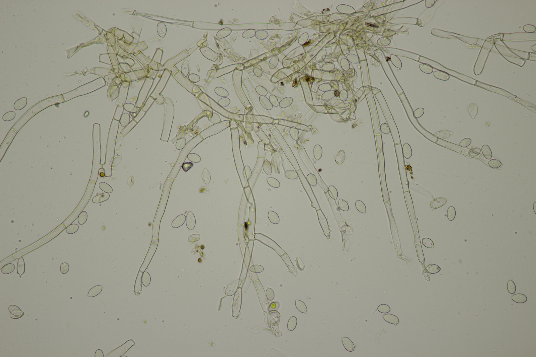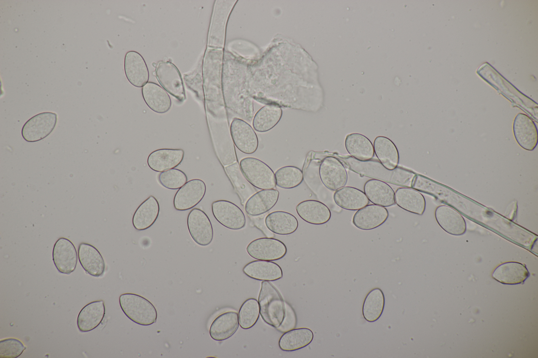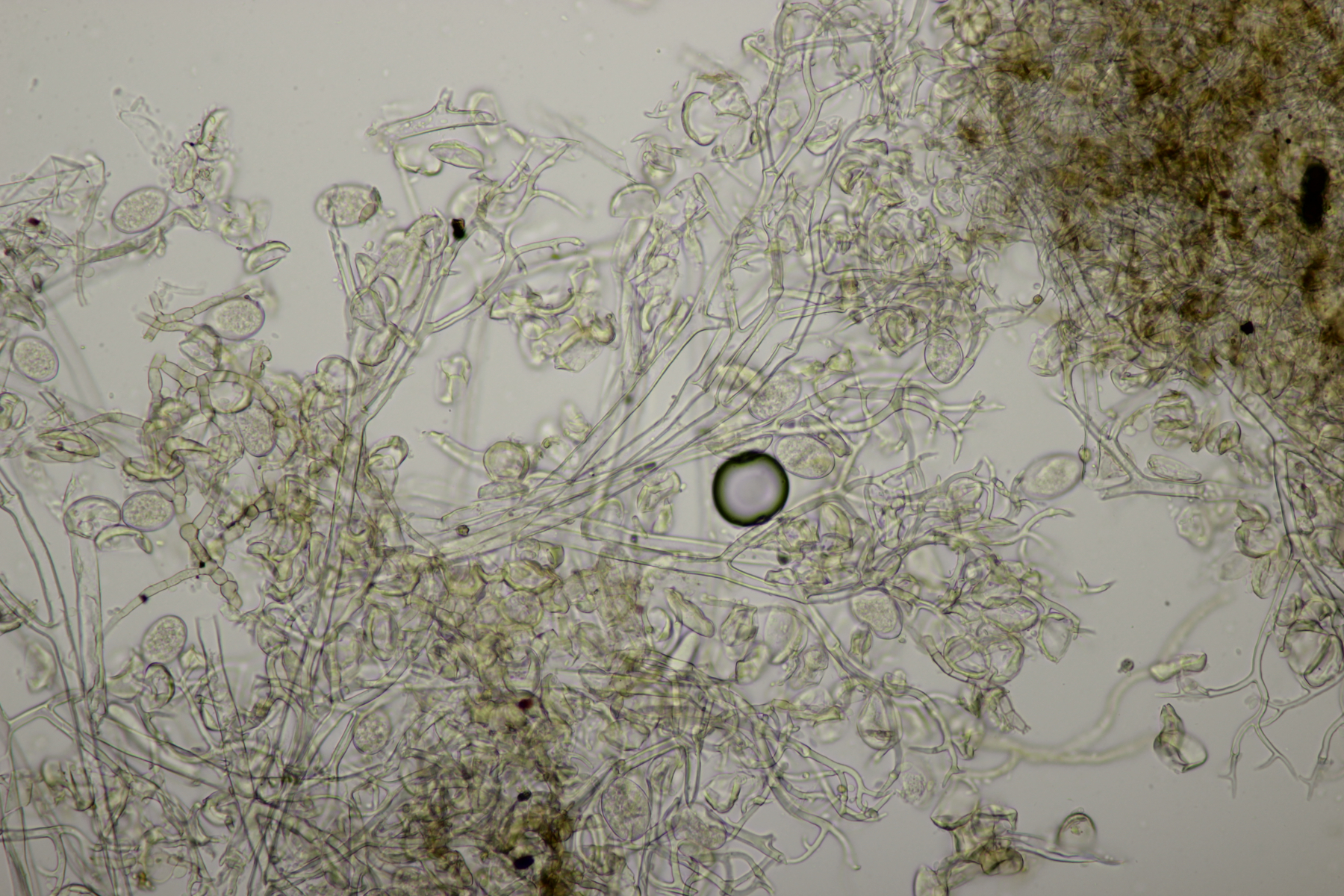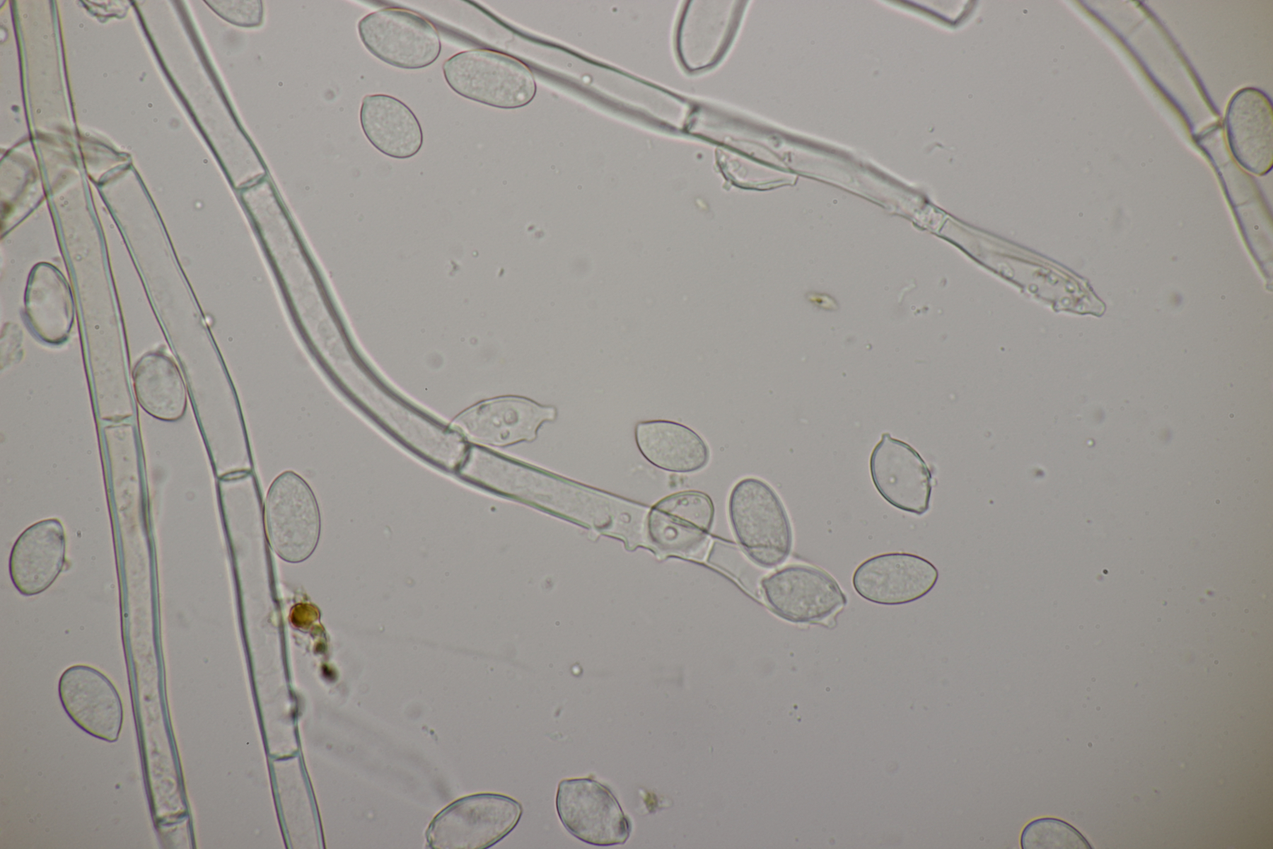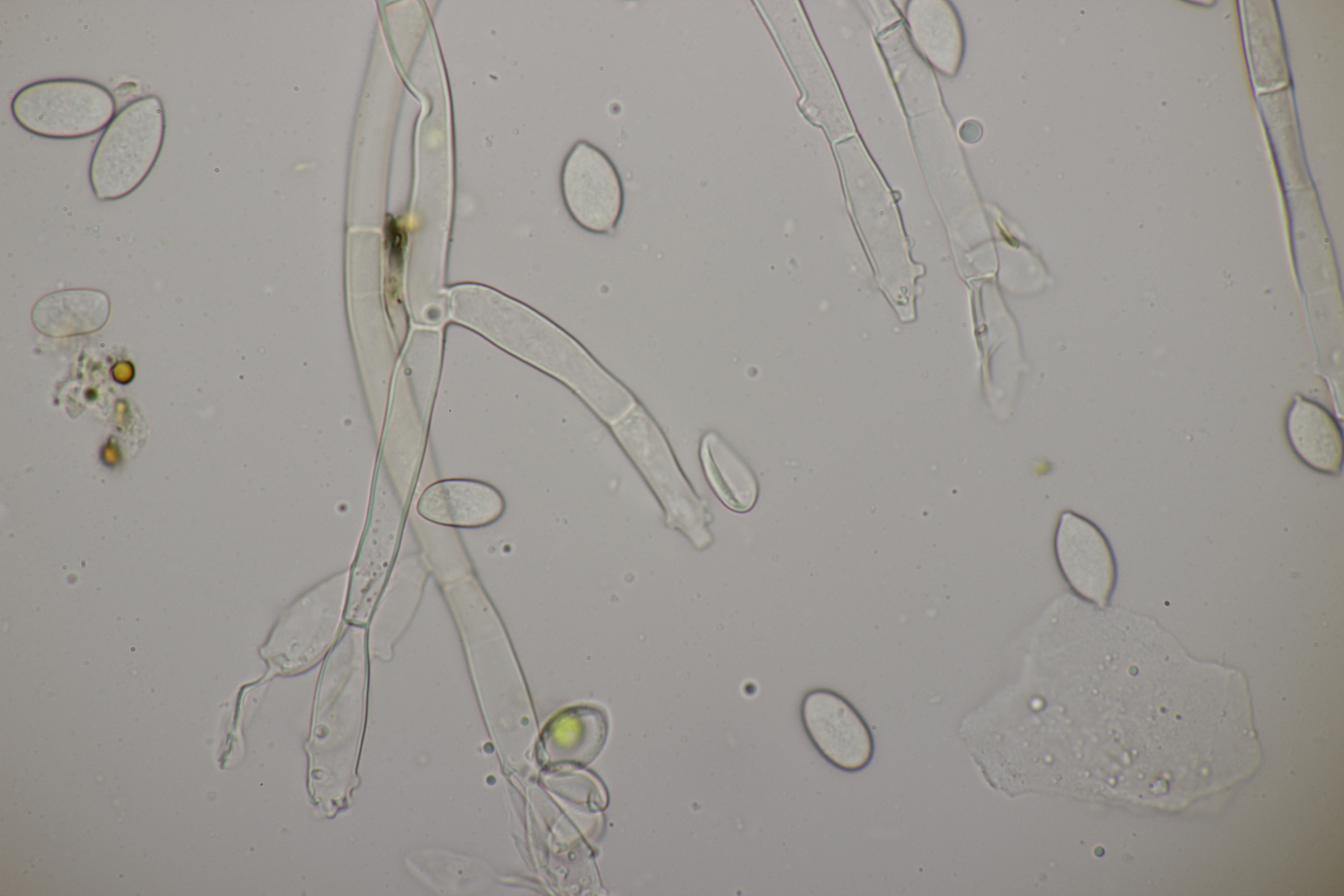 7. Noch ein Rindenpilz, hier fehlt mir gerade jede Idee. Sporen (3.9+-0.2) µm x (3.3+-0.2) µm, Q=1.2+-0.1 bzw. (3.6-4.3) µm x (2.9-3.6) µm, Q=1.1-1.3, nicht amyloid oder dextrinoid soweit ich das beurteilen kann. Keine Zystiden, Schnallen vorhanden, Basidien 4-sporig. Dazu auffällige Rhizomorphen.