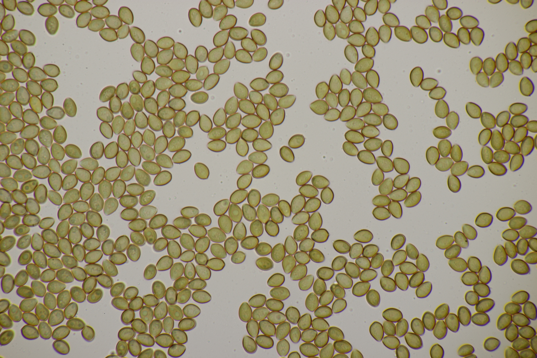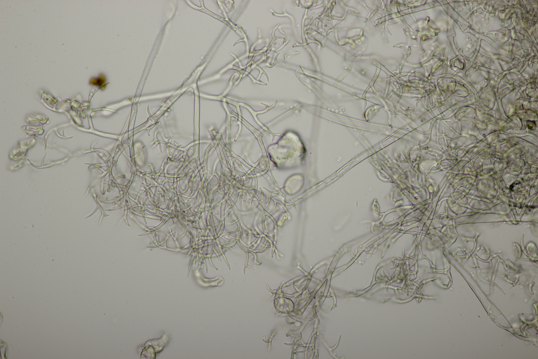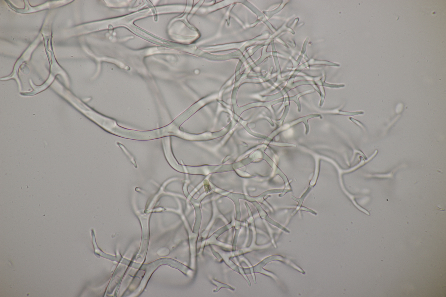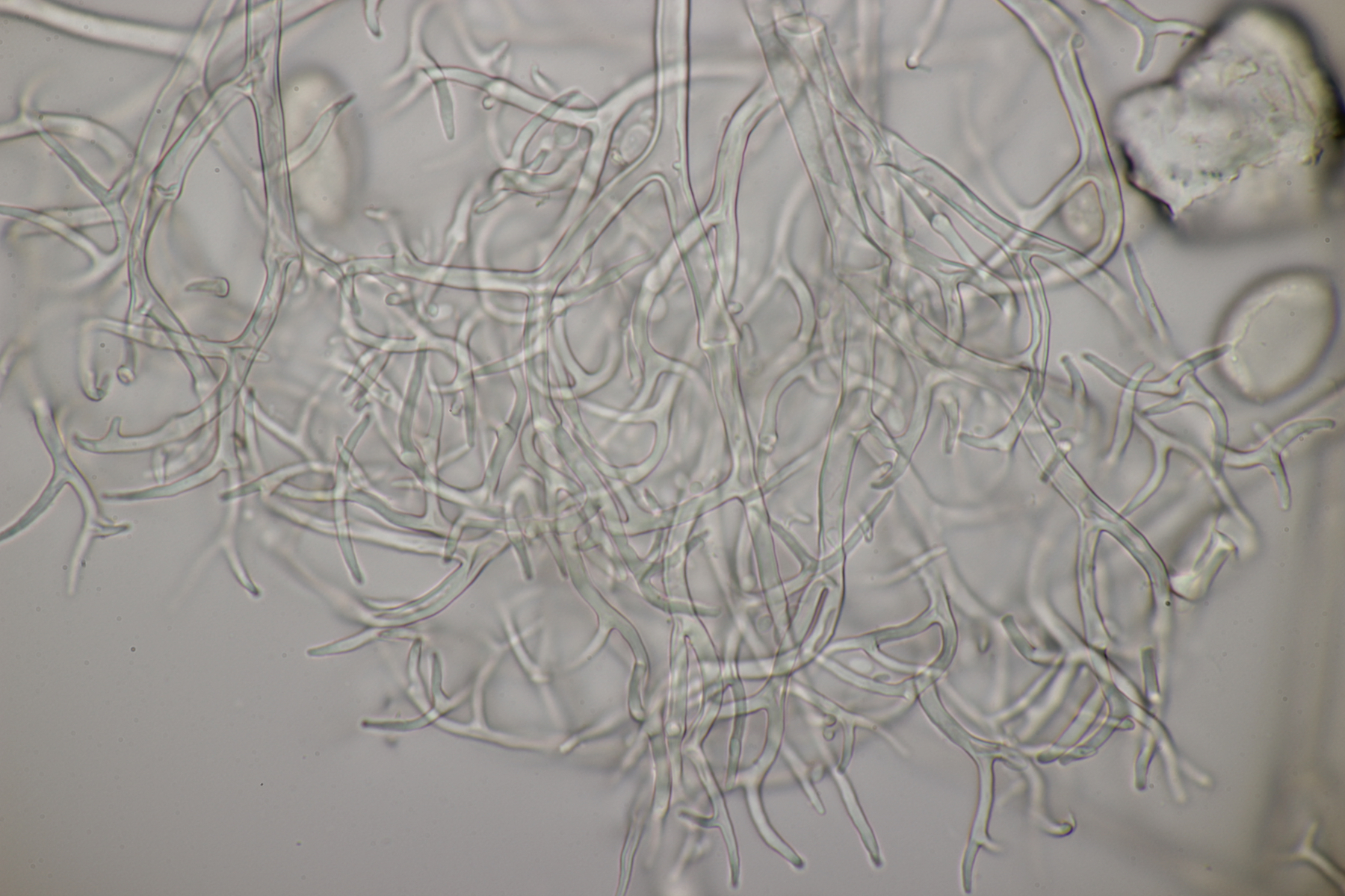 7. Noch ein Rindenpilz, hier fehlt mir gerade jede Idee. Sporen (3.9+-0.2) µm x (3.3+-0.2) µm, Q=1.2+-0.1 bzw. (3.6-4.3) µm x (2.9-3.6) µm, Q=1.1-1.3, nicht amyloid oder dextrinoid soweit ich das beurteilen kann. Keine Zystiden, Schnallen vorhanden, Basidien 4-sporig. Dazu auffällige Rhizomorphen.