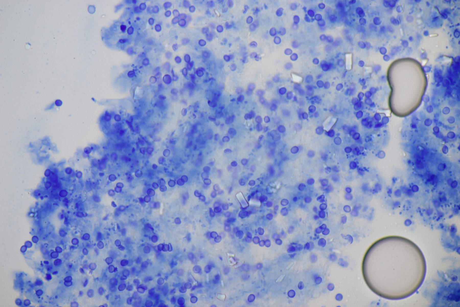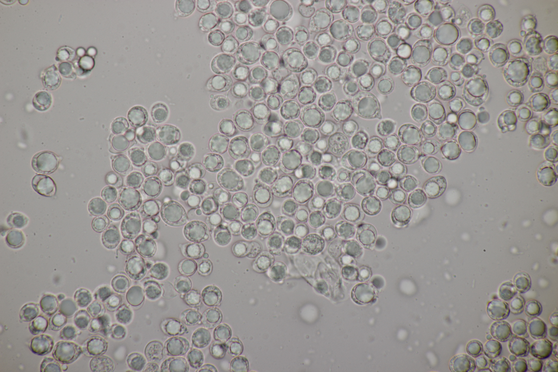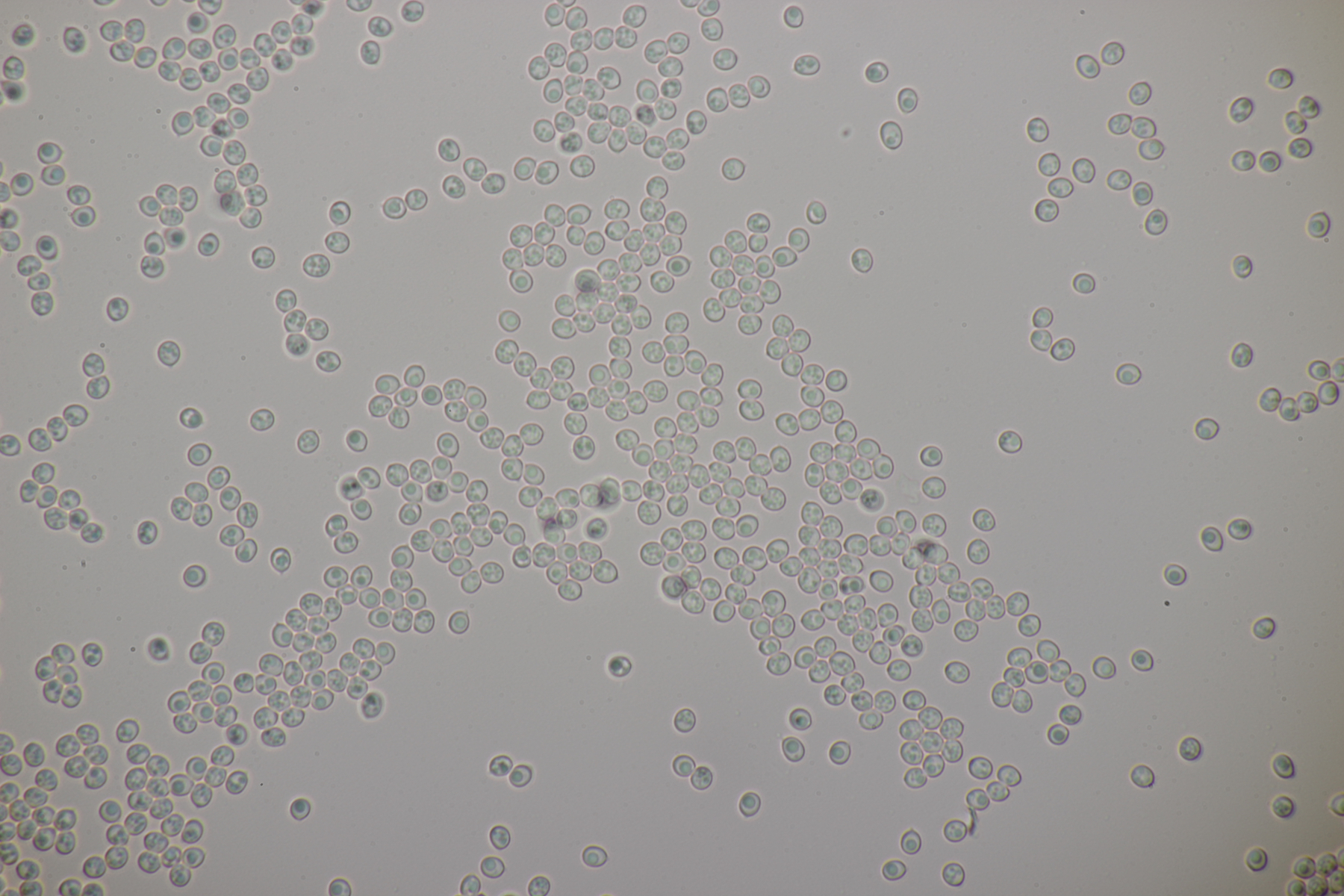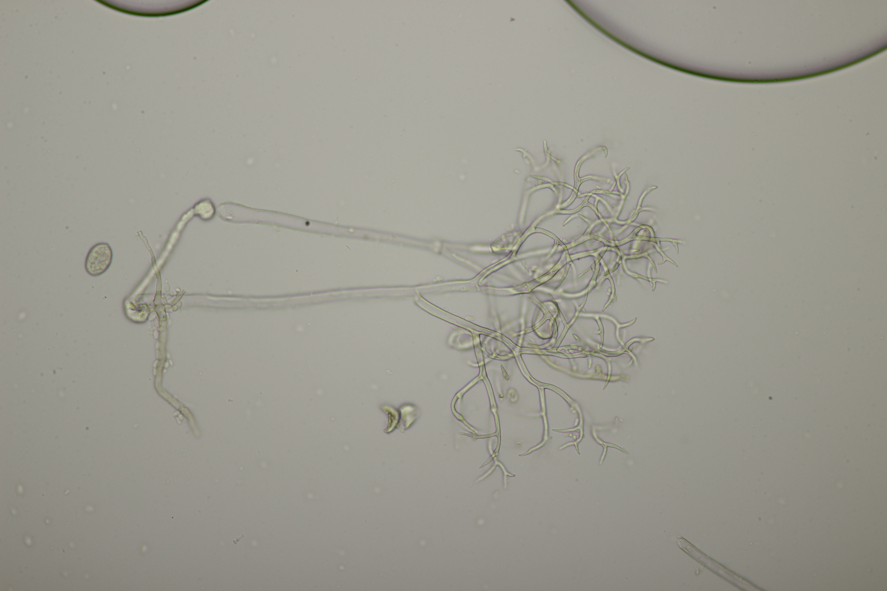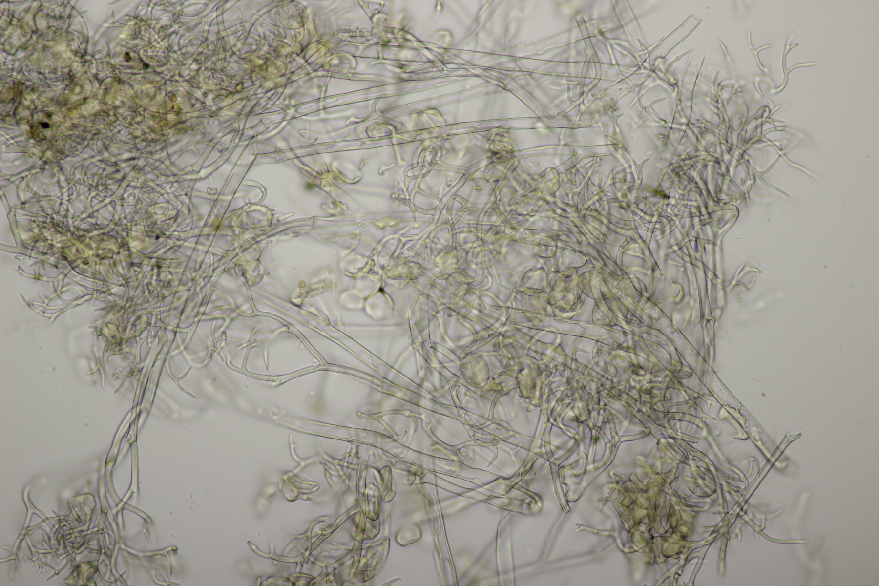 7. Noch ein Rindenpilz, hier fehlt mir gerade jede Idee. Sporen (3.9+-0.2) µm x (3.3+-0.2) µm, Q=1.2+-0.1 bzw. (3.6-4.3) µm x (2.9-3.6) µm, Q=1.1-1.3, nicht amyloid oder dextrinoid soweit ich das beurteilen kann. Keine Zystiden, Schnallen vorhanden, Basidien 4-sporig. Dazu auffällige Rhizomorphen.