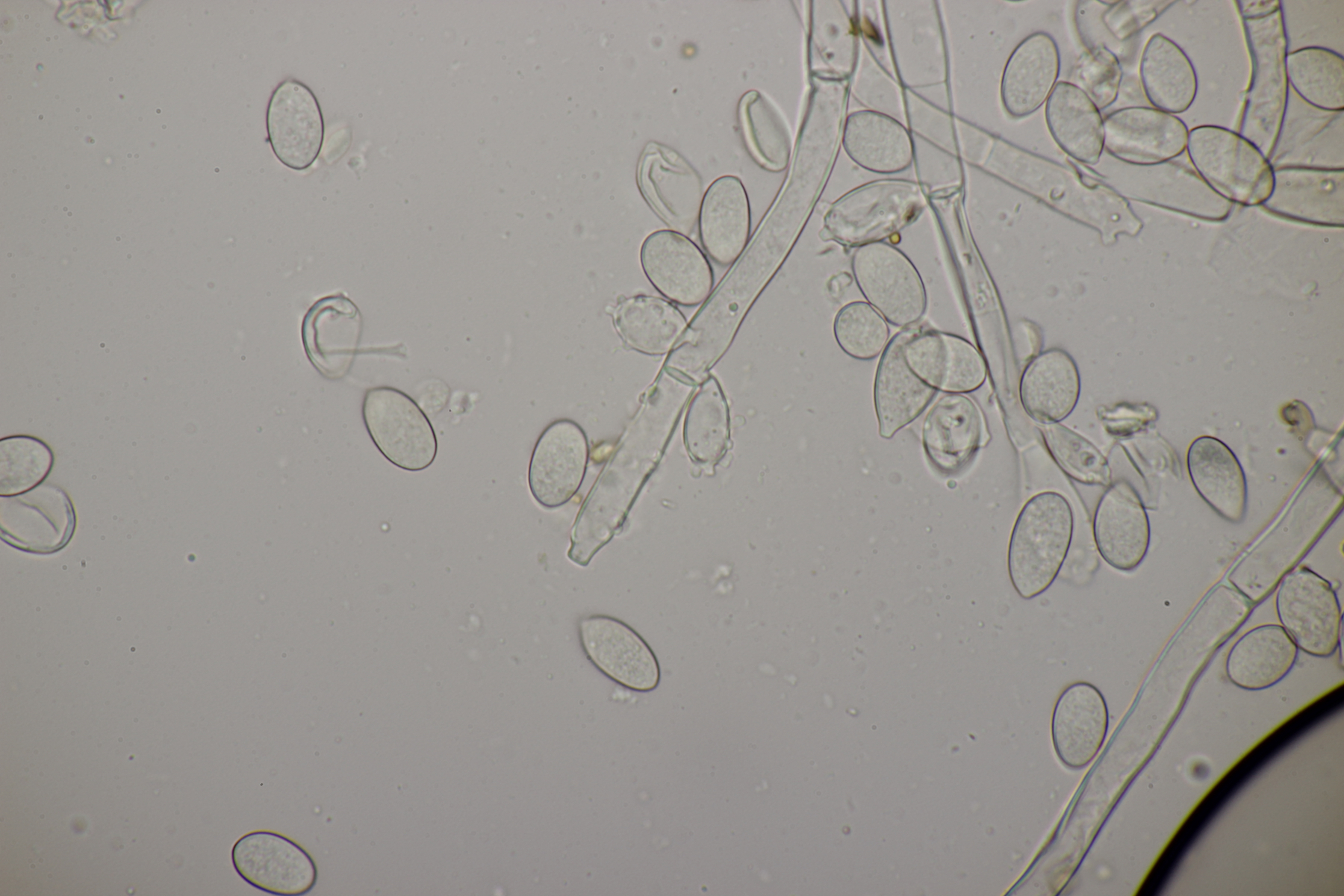 6. Ein Botryobasidium im anamorphen Zustand. Konidien zitronenförmig, (15.8+-0.9) µm x (8.9+-0.6) µm, Q=1.8+-0.2 bzw. (14.7-18.5) µm x (7.7-10.0) µm, Q=1.5-2.1, ohne Schnallen. Der obere Teil der Konidienträger scheint nicht verzweigt zu sein. Aber dann passe von der Sporengröße her weder B. ellipsosporum noch B. conspersum. Irgendeinen Rat, Pablo?