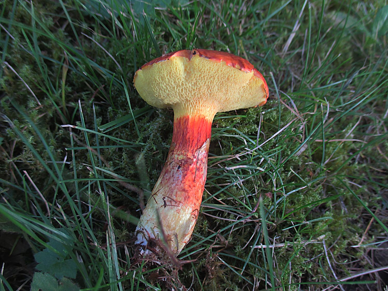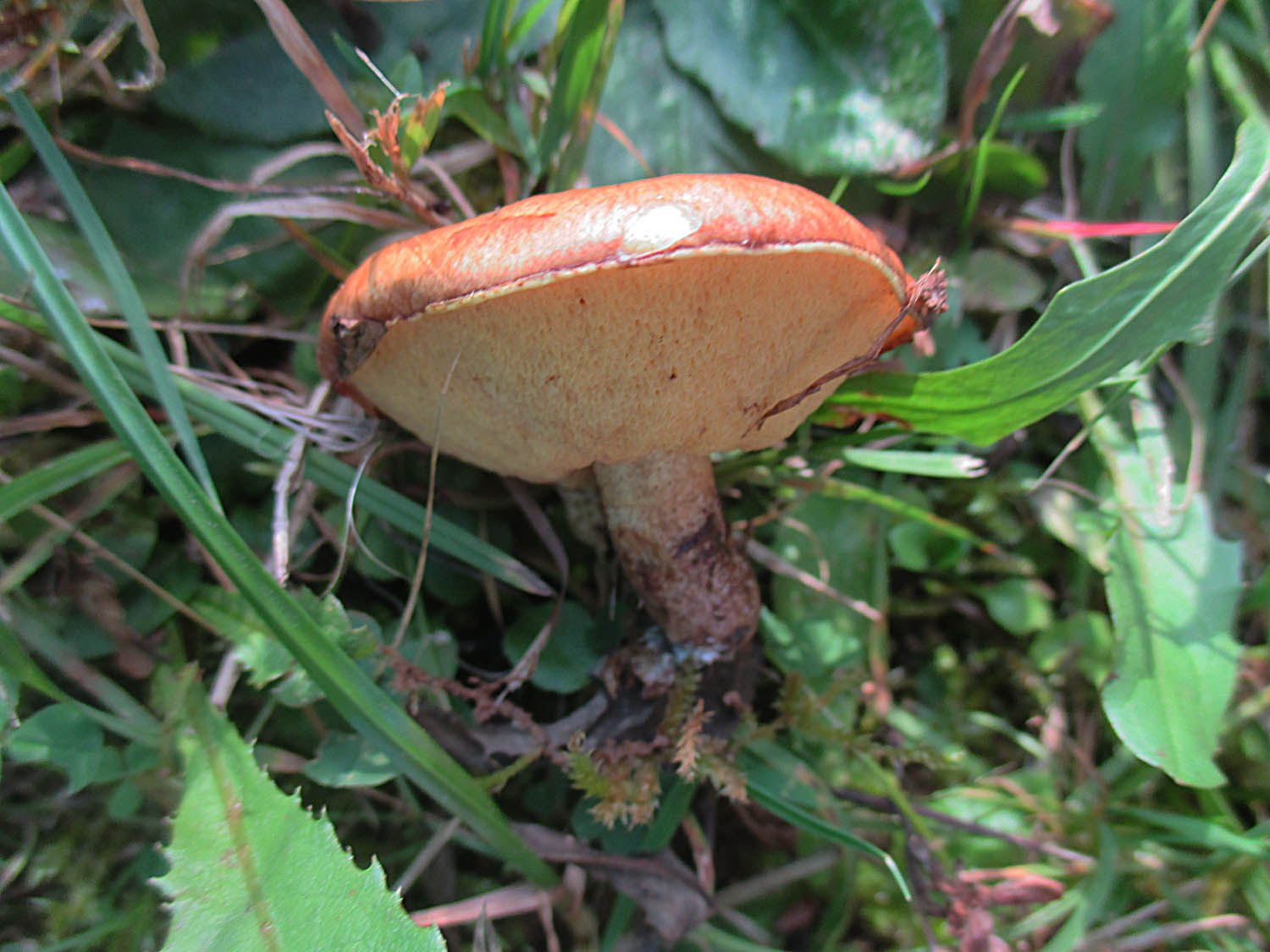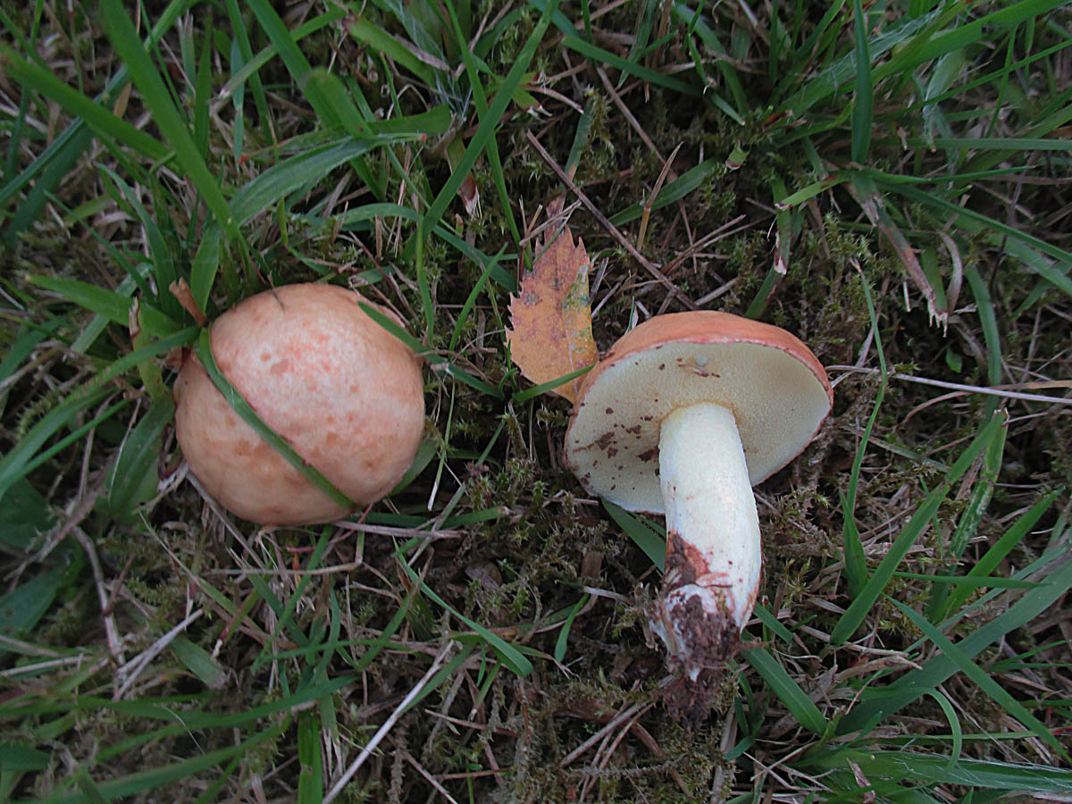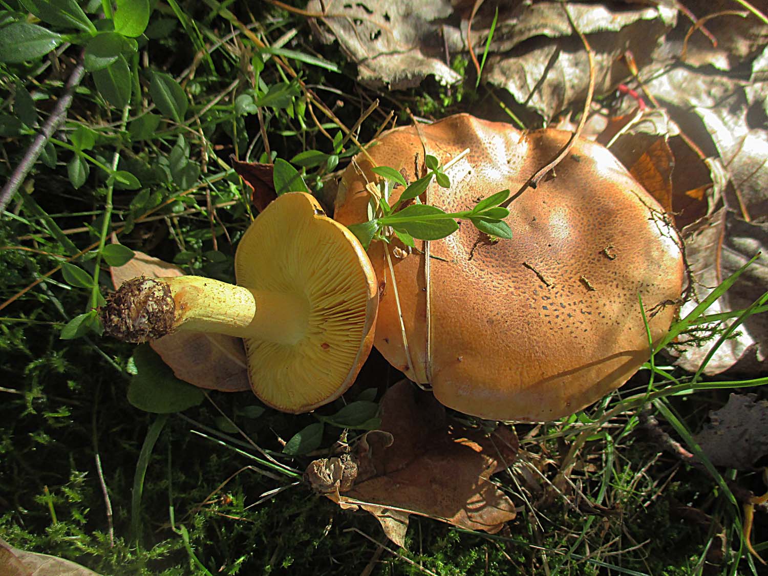 Unter einzelnen Kiefern ließen sich Körnchenröhrlinge (Suillus granulatus), Butterpilze (Suillus luteus), Gemeine Erdritterlinge (Tricholoma terreum) und unter einer Lärche ein ungewöhlich gefärbter Goldröhrling (Suillus grevillei) blicken.