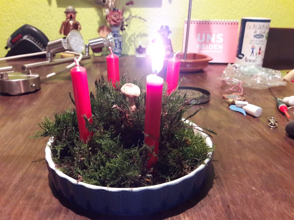 • Hallo Tuppie, jetzt in der Dämmerung ist Kerzenzeit, einen schönen 1. Advent wünsch ich dir und allen anderen anderen Pilzverrückten. Leider ist meine Adventsdeko immer mit irgendwelchem Bastelzeugs vermurkst. Heute mit einem großen Bild, dass ich noch bis Weihnachten fertig bekommen muss. Wie immer kommt das Fest auch dieses Jahr völlig überraschend.