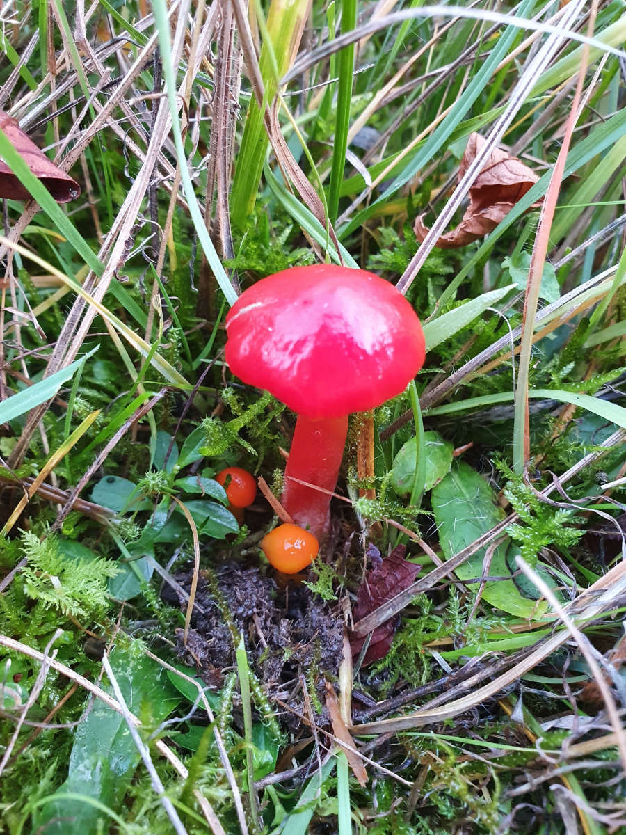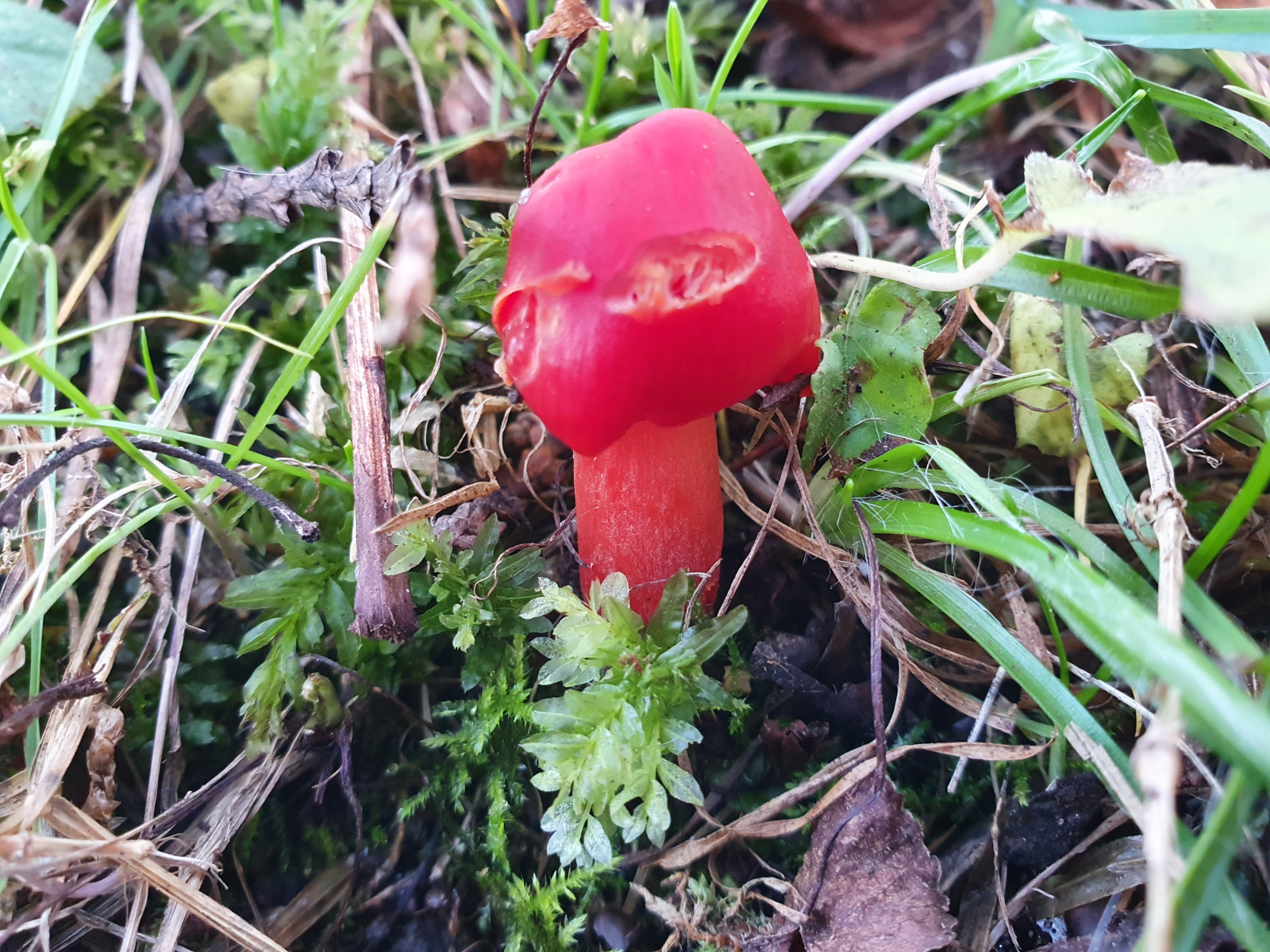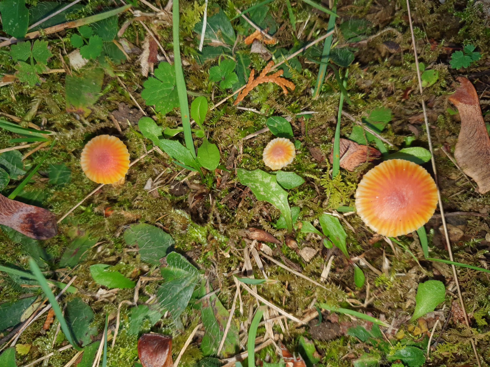 Anbei ein Foto von Hygrocybe mucronella-Fruchtkörpern, die vom Alter und damit von der Farbgebung deinem Fund entsprechen (die roten Pigmente werden bei H. mucronella recht schnell „ausgewaschen“ und es entsteht schnell ein für die Art typischer farbloser bis weißer Rand).