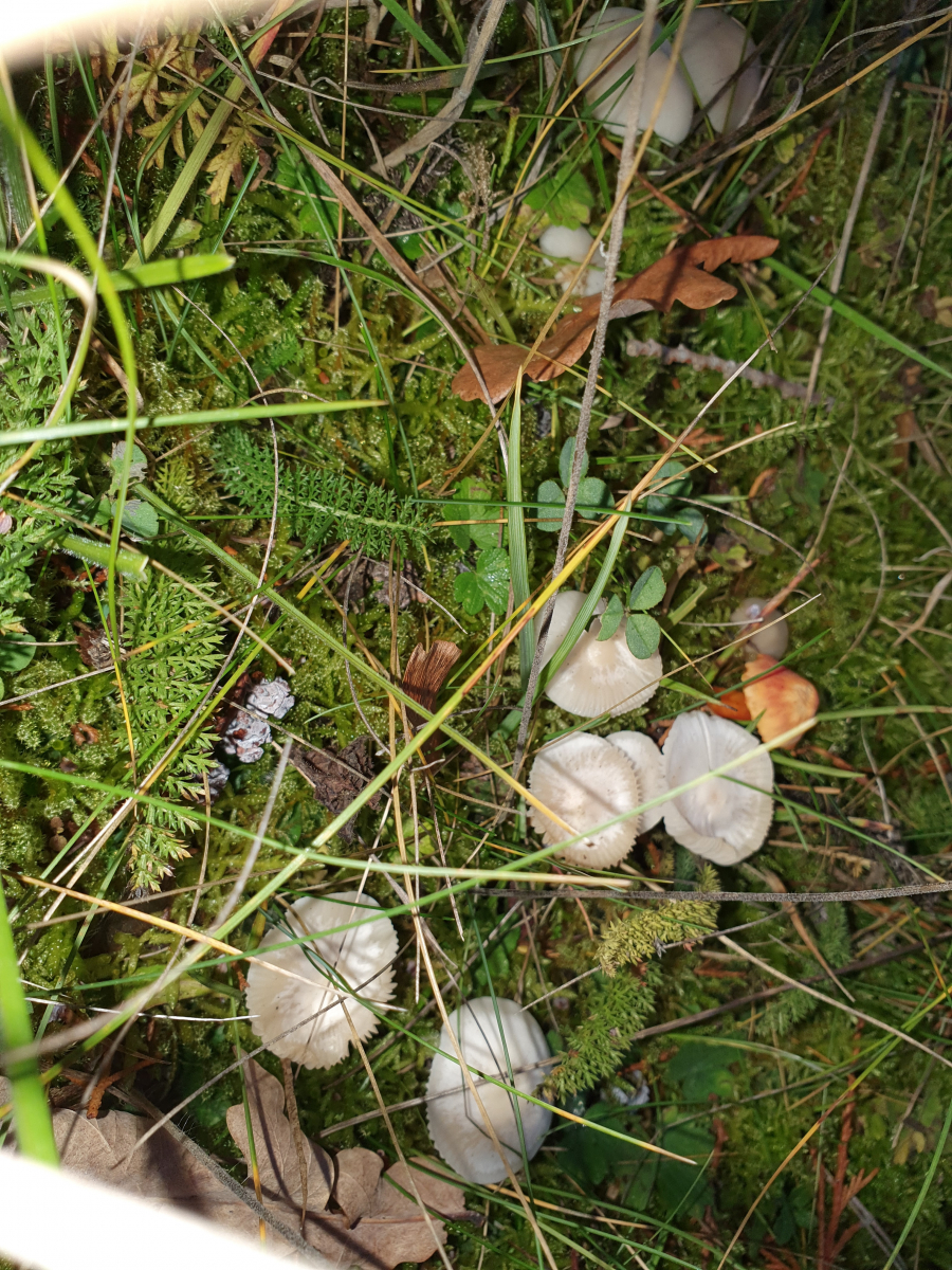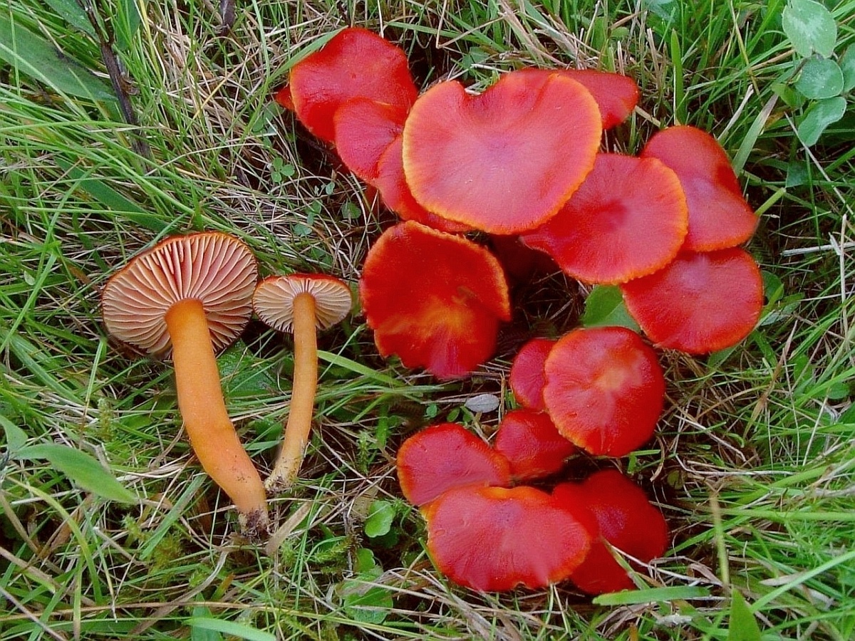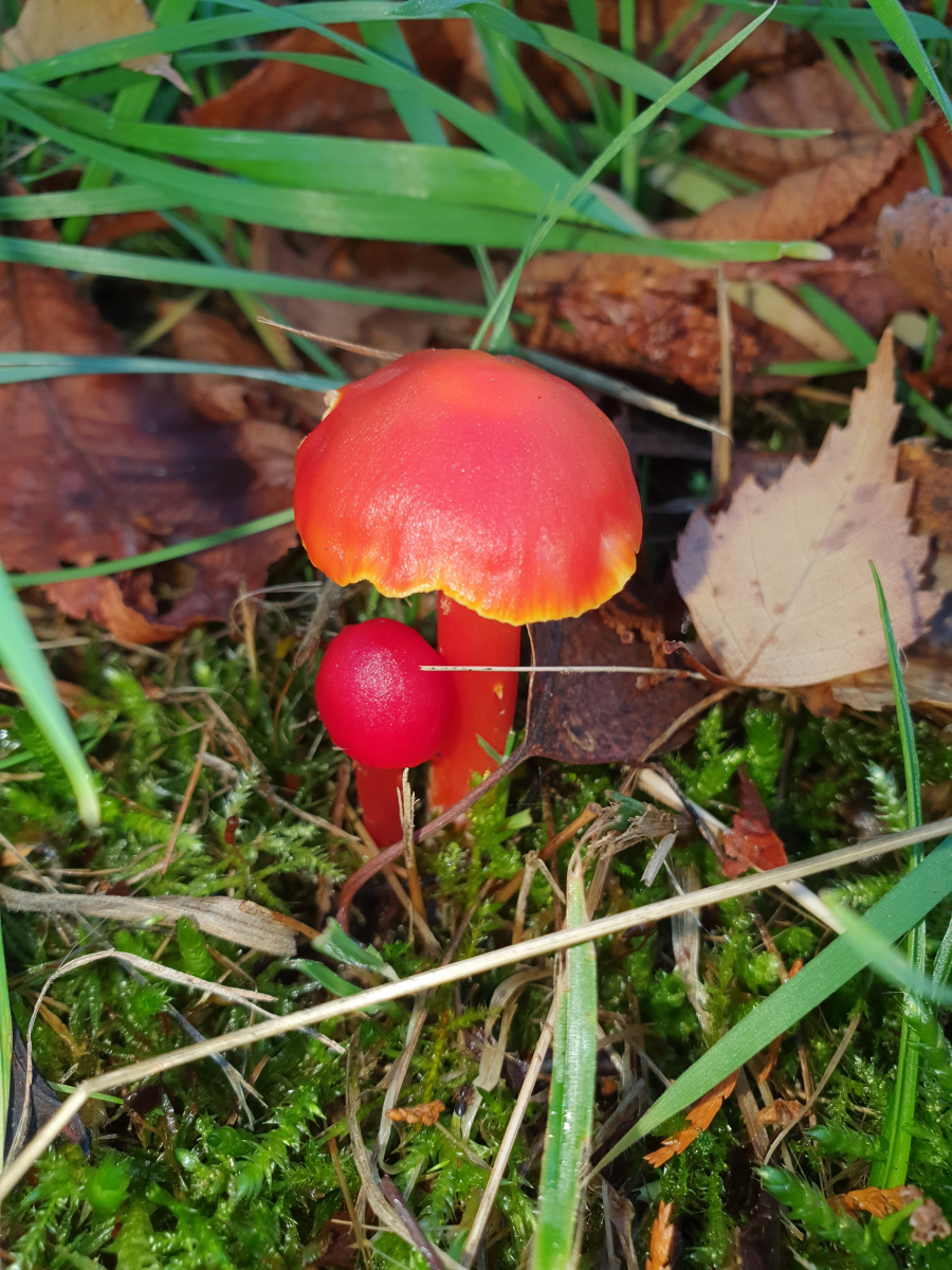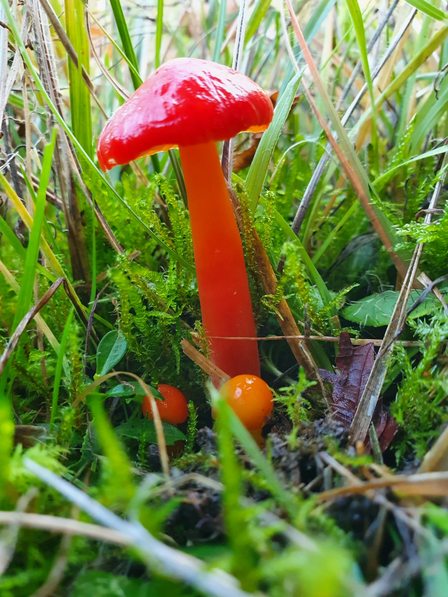 Anbei ein Foto von Hygrocybe mucronella-Fruchtkörpern, die vom Alter und damit von der Farbgebung deinem Fund entsprechen (die roten Pigmente werden bei H. mucronella recht schnell „ausgewaschen“ und es entsteht schnell ein für die Art typischer farbloser bis weißer Rand).