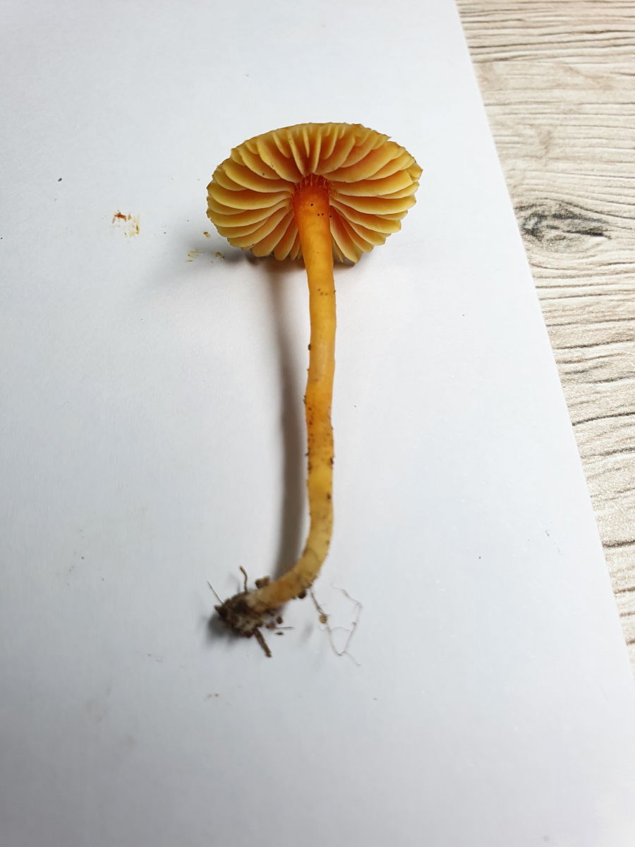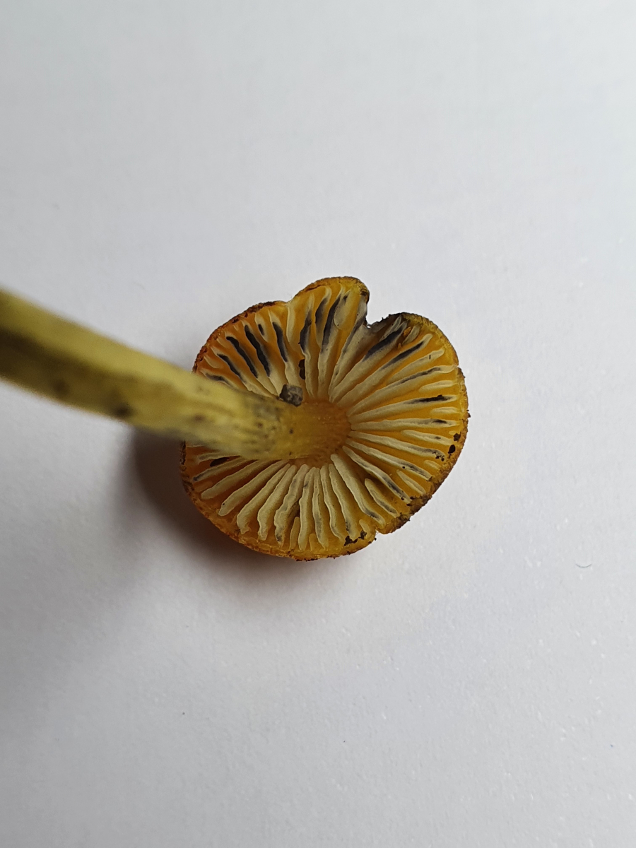 Bei voll aufgeschirmten Hüten sind die Lamellen von H. mucronella deutlich orange gefärbt und der farbliche Kontrast zwischen den Lamellen und dem Stiel ist eher gering.