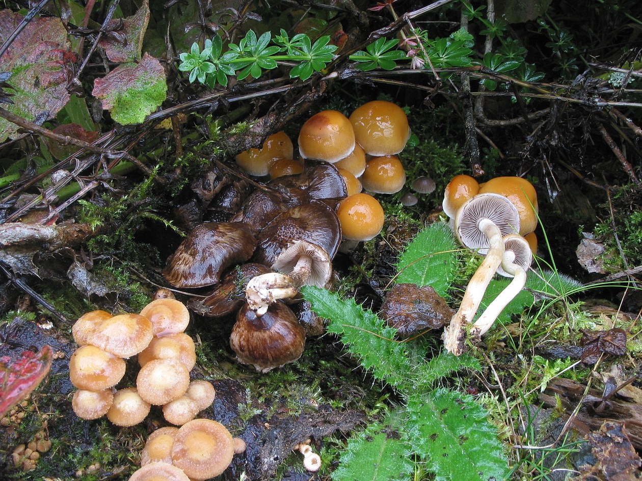 an diesem Holzstumpf sind gleich 4 verschieden Pilze zu sehen: