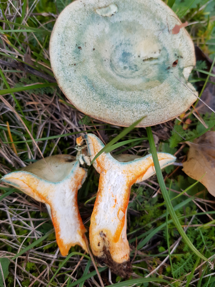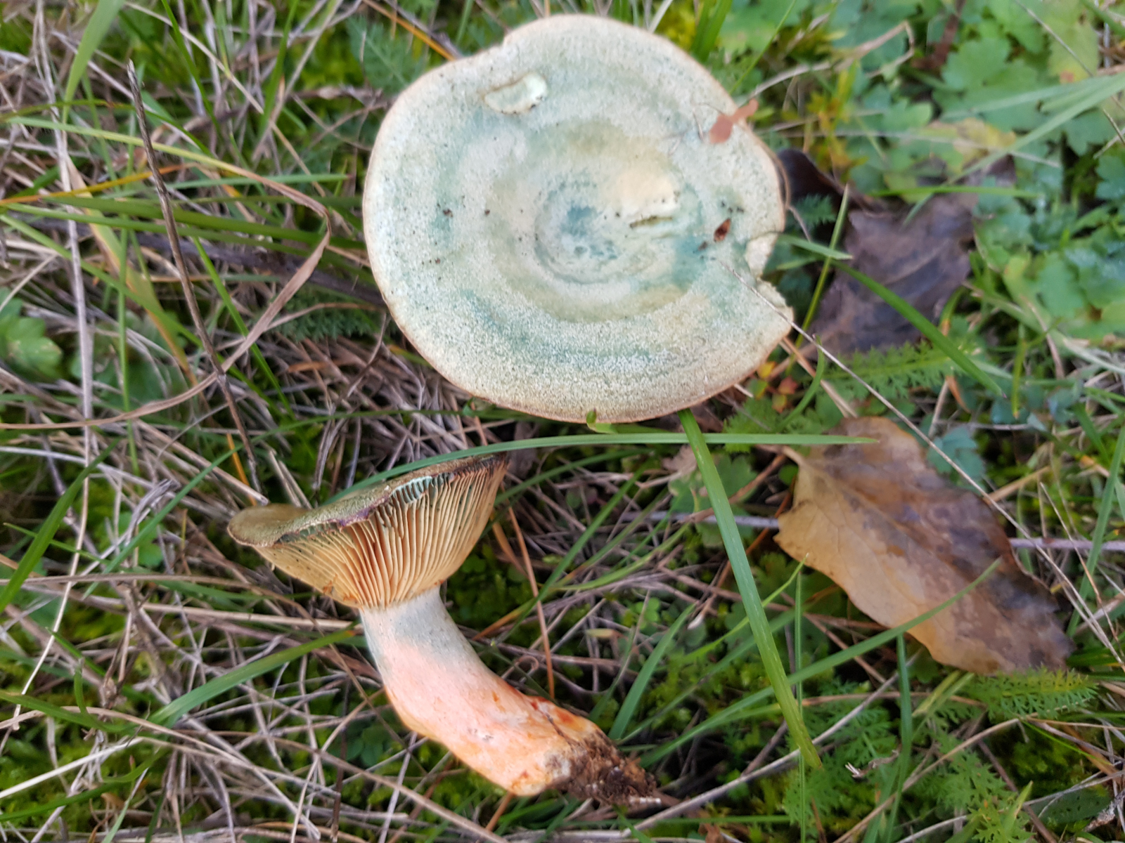 ich habe letzte Woche eine kleine Gruppe Reizker gefunden, die ich im Feld als Spangrüne angesprochen habe. Fundort war ein Eichen-Elsbeeren-Wald (ehemaliger Weinberg) mit eingestreuten Kiefern, die dort in den 60er Jahren aufgeforstet wurden. In unmittelbarer Nähe standen auch Fichten.