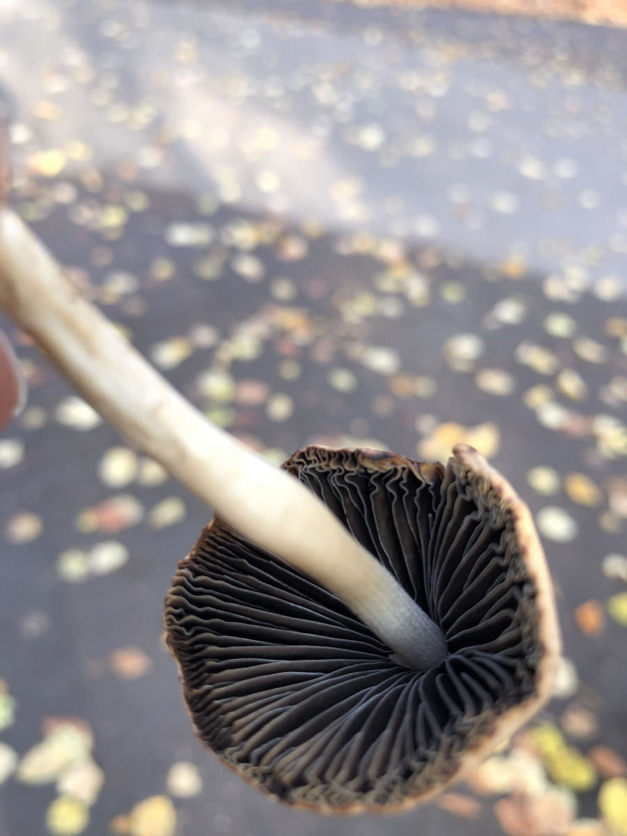 hm, ich bin bei Schwarzsporern oft unschlüssig... ich würde vermuten, dass unter dem Laub vielleicht Dung lag und würde auf Panaeolus papilionaceus tippen. Bei dem kann die Huthaut zumindest so aufreißen - meine ich jedenfalls. Ich habe auf die Schnelle nur ein Vergleichsfoto gefunden: Panaeolus papilionaceus DSCN3047 | der Pilz wuchs im Gras au… | Flickr