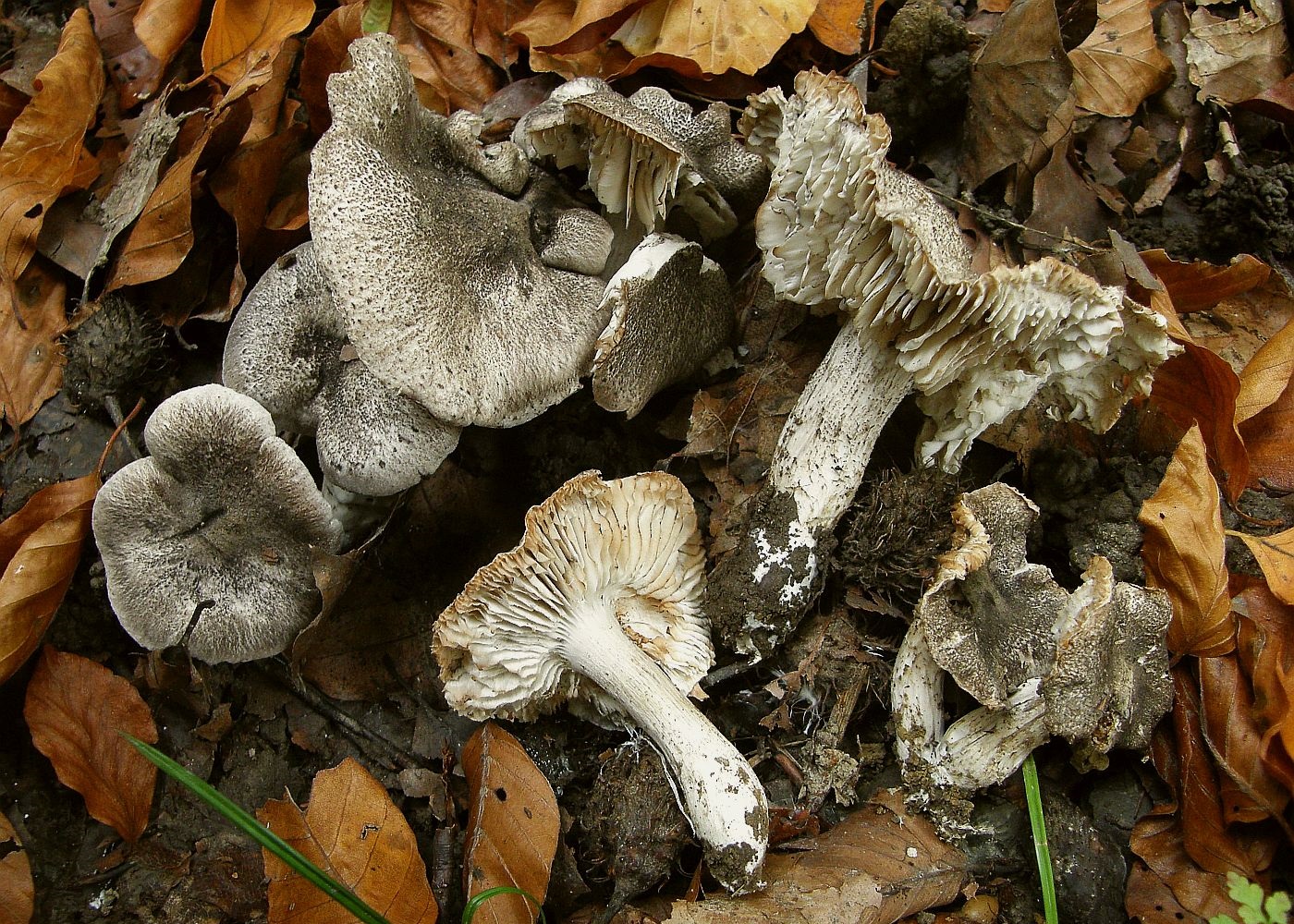 Aber es dürfte immerhin zur gleichen Art gehören wie Waldfuzzis Fund. Wenn Tricholoma atrosquamosum auch mit Rotbuche oder Eiche in thermophilen, basischen Laubwäldern kann (Begleitritterlinge in dem Fall scalpturatum, orirubens und filamentosum), dann wäre das wohl der ideale Name für Waldfuzzis Pilz (und die Kollektion von mir).