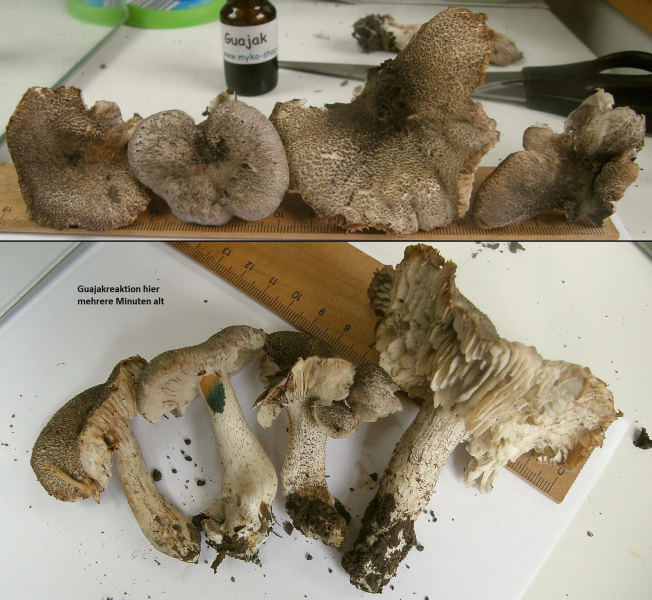 Es ist interessant und immer gut, wenn man Erfahrungen austauschen kann. Bei mir kommt Tricholom orirubens auch gerne in so großen Mengen, also mit vielen Fruchtkörpern pro Myzel, dass ich bei Kollektionen frisch im Gelände nie Probleme hatte, das Gelb des Basalmyzels zu sehen. Manchmal ist es intensiv schwefelgelb, manchmal blasser gelb, aber rein weiß habe ich es nicht nicht gesehen (oder mir ist es nicht aufgefallen oder ich habe dann falsch bestimmt, weil ich dem folge). Bei solchen Merkmalen schaue ich mehrere Stielbasen an und finde, dass man dann in der Kollektion das ganz gut festmachen kann. Das sollte im Schwarzwald dann ja auch gehen, da auch bei Schwankungen in einem Myzel manche eben doch klar gelb sein sollten. Oder hast du auch ganze Myzelien, die praktisch kein Gelb zeigen? Das wäre dann entkräftend.