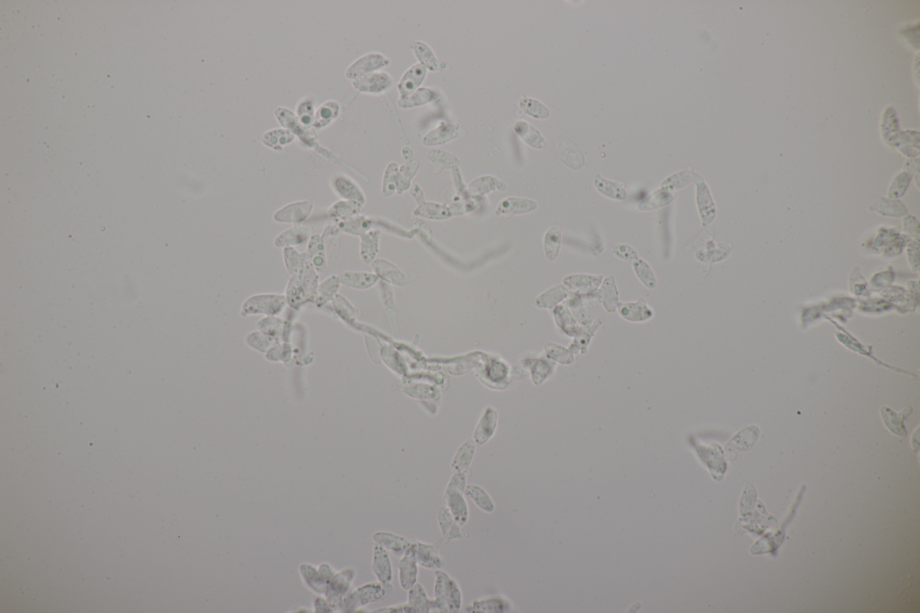 4. Botryobasidium aureum. Konidien (21.8+-1.7) µm x (11.1+-0.9) µm, Q=2.0+-0.2 bzw. (17.2-25.7) µm x (9.8-13.6) µm, Q=1.6-2.4