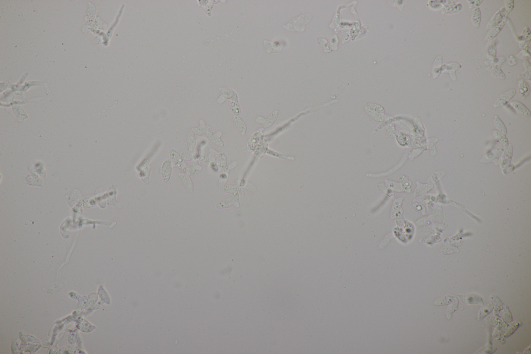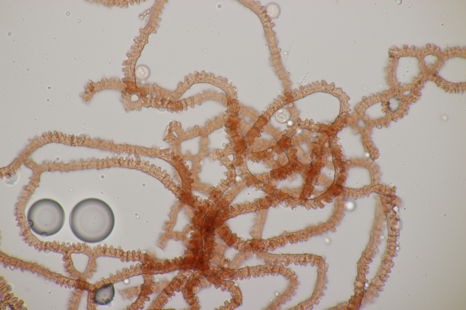8. Arcyria denudata. Sporen (7.3+-0.3) µm bzw. (6.7-7.8) µm und Capillitium fest mit dem Becher verbunden