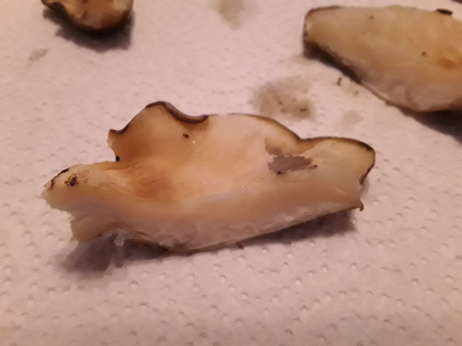 Die irgendwie reduziert erscheinenden Lamellen würden auch ganz gut zu Panellus serotinus passen. Bei Pleurotus sind die Lamellen ganz jung auch schon deutlciher entwickelt, bei Panellus aber oft noch so wie hier. Ich denke, daß sind tatsächlich ganz junge Muschelseitlinge, die erfroren sind, bevor sich die Fruchtkörper voll entwickeln konnten.