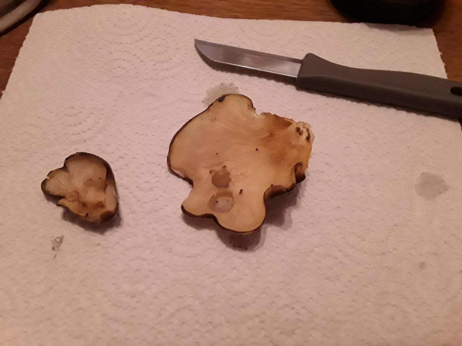 Die irgendwie reduziert erscheinenden Lamellen würden auch ganz gut zu Panellus serotinus passen. Bei Pleurotus sind die Lamellen ganz jung auch schon deutlciher entwickelt, bei Panellus aber oft noch so wie hier. Ich denke, daß sind tatsächlich ganz junge Muschelseitlinge, die erfroren sind, bevor sich die Fruchtkörper voll entwickeln konnten.