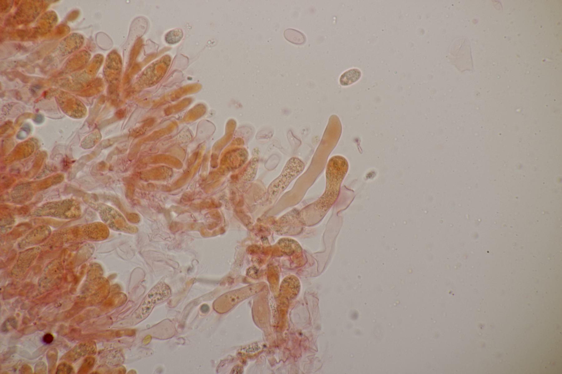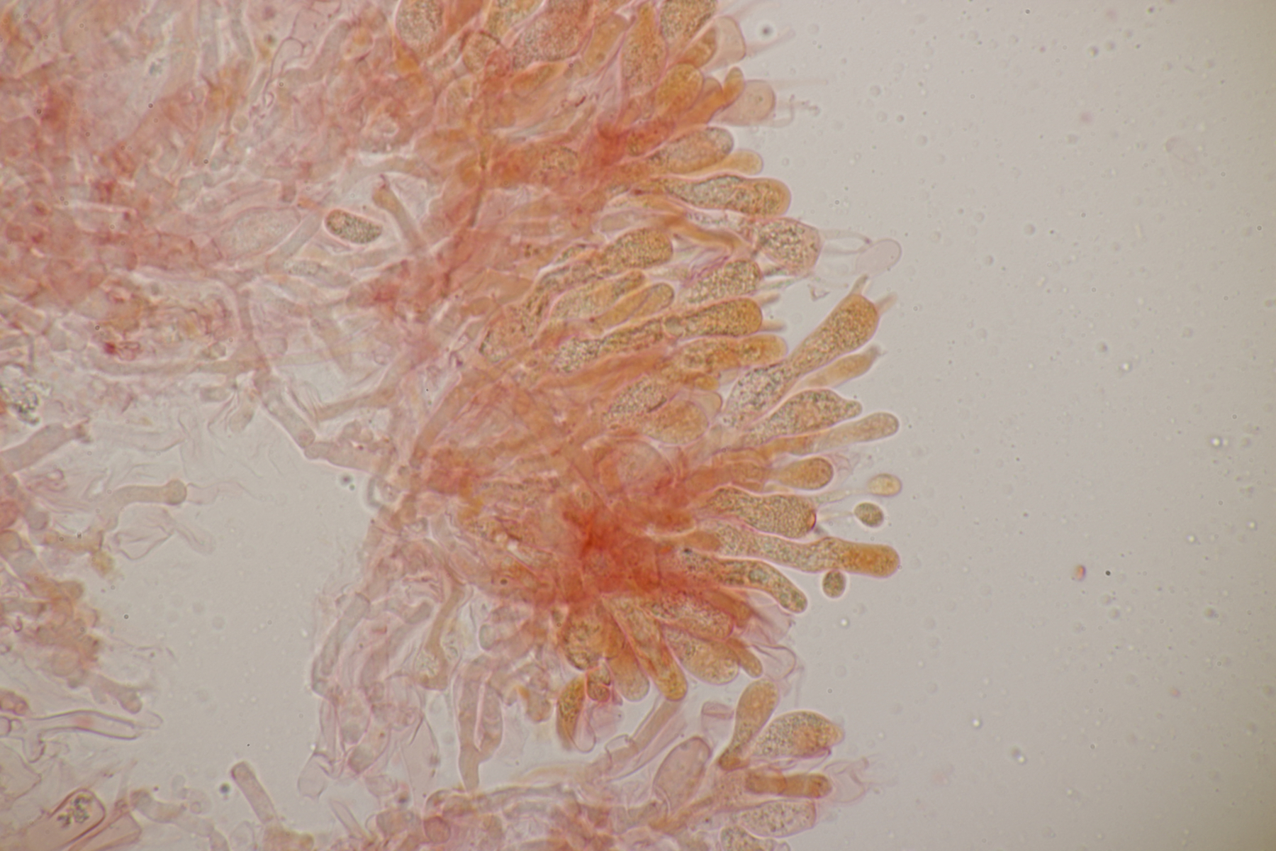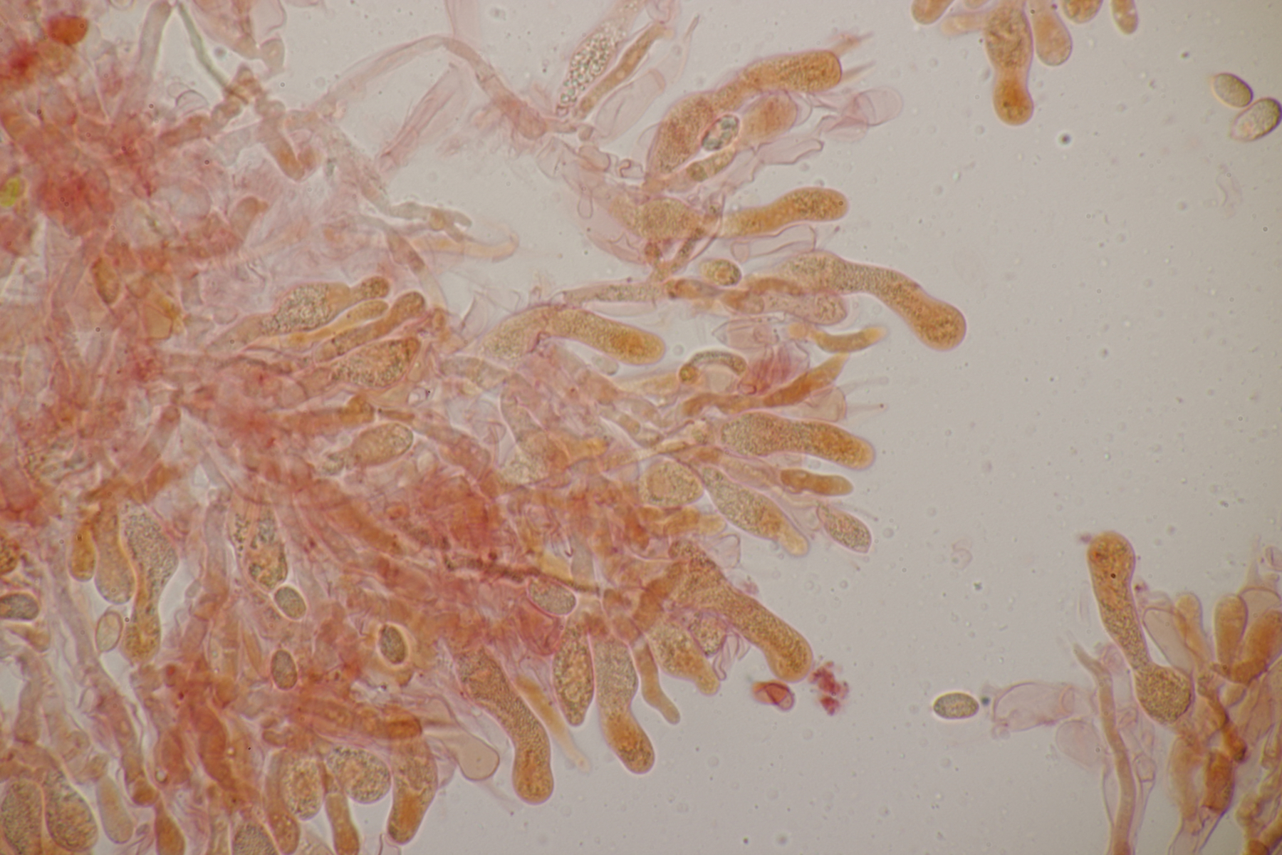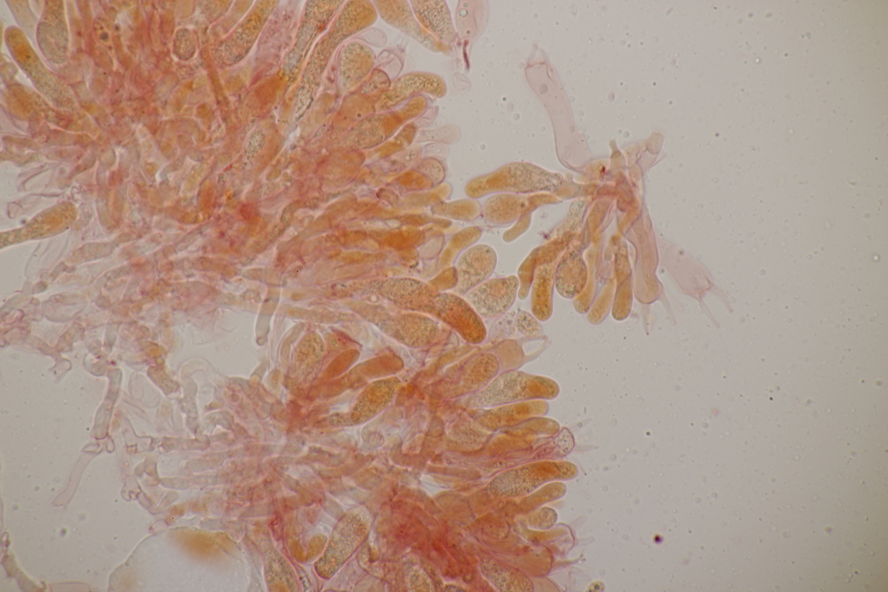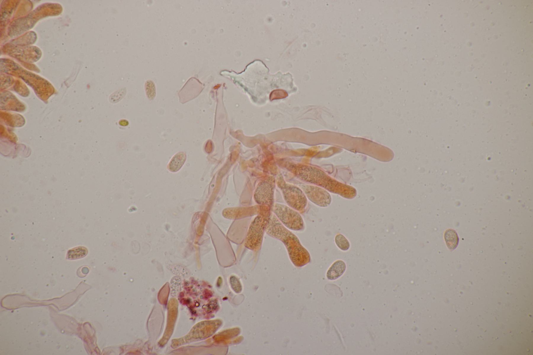 5. Daneben war aber noch ein Rindenpilz mit auf dem Stück Holz, der deutlich absporfreundlicher war. Sporenmaße (8.5+-0.6) µm x (5.0+-0.3) µm, Q=1.7+-0.1 bzw. (7.8-9.8) µm x (4.4-5.4) µm, Q=1.6-1.9, Schnallen vorhanden, Basidien 4-sporig, dazu nicht inkrustierte, lange Zystiden. Die Basidien würde ich tendentiell für suburniform halten und dann bei Hyphoderma schlüsseln, wo ich dann bei H. obtusum lande. Was meint ihr?