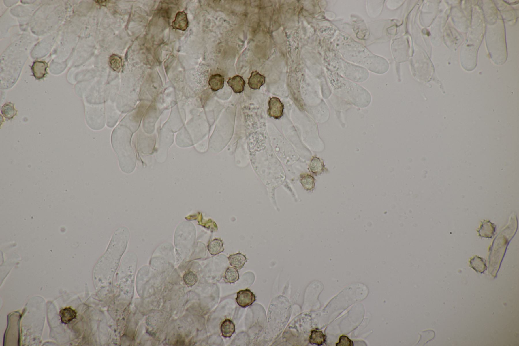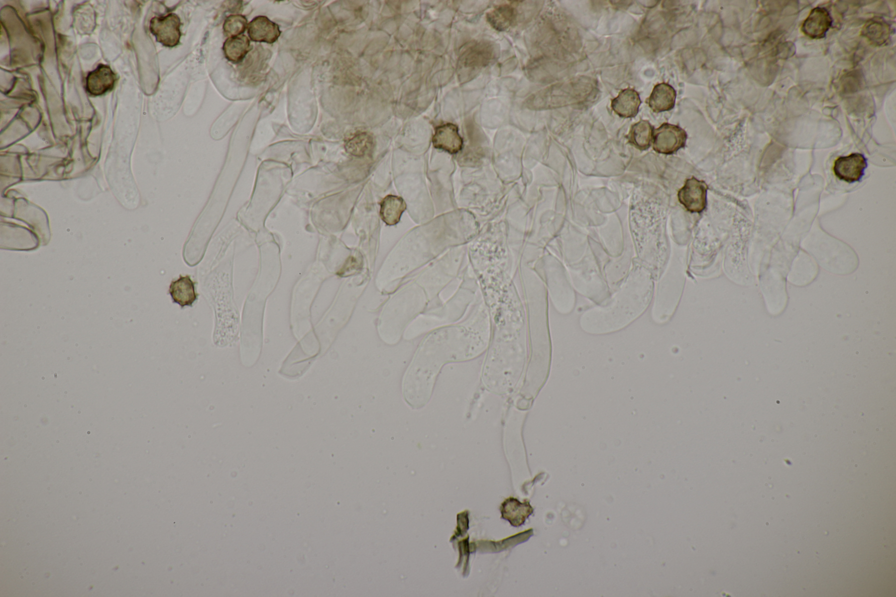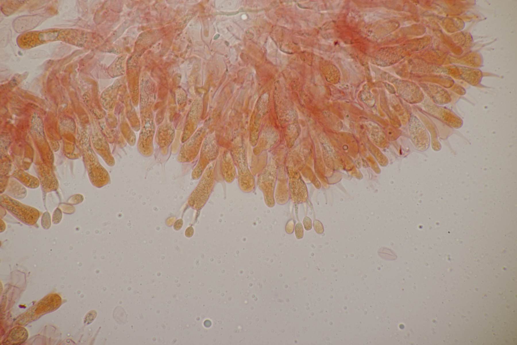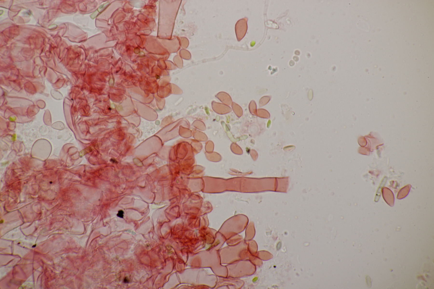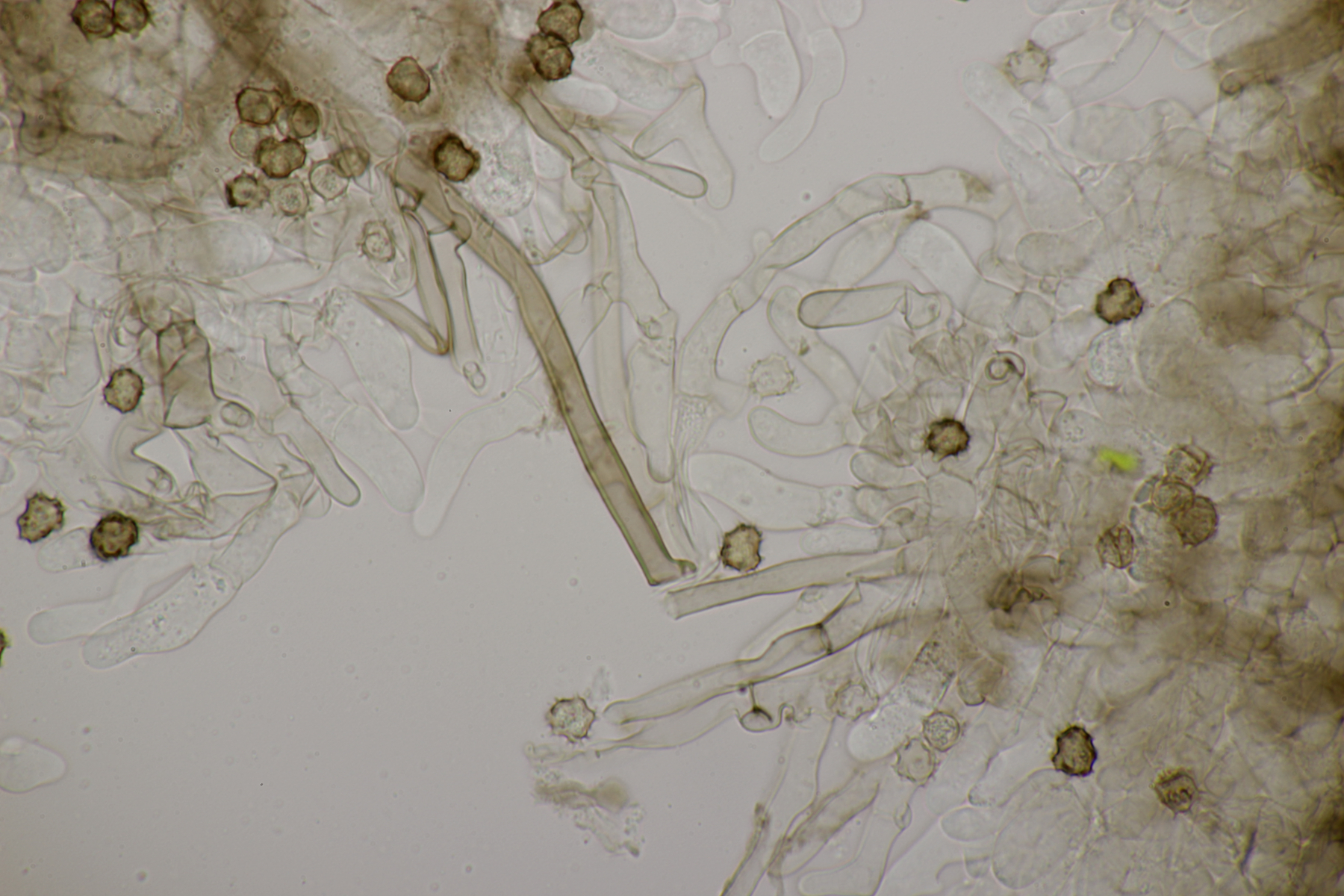 5. Daneben war aber noch ein Rindenpilz mit auf dem Stück Holz, der deutlich absporfreundlicher war. Sporenmaße (8.5+-0.6) µm x (5.0+-0.3) µm, Q=1.7+-0.1 bzw. (7.8-9.8) µm x (4.4-5.4) µm, Q=1.6-1.9, Schnallen vorhanden, Basidien 4-sporig, dazu nicht inkrustierte, lange Zystiden. Die Basidien würde ich tendentiell für suburniform halten und dann bei Hyphoderma schlüsseln, wo ich dann bei H. obtusum lande. Was meint ihr?