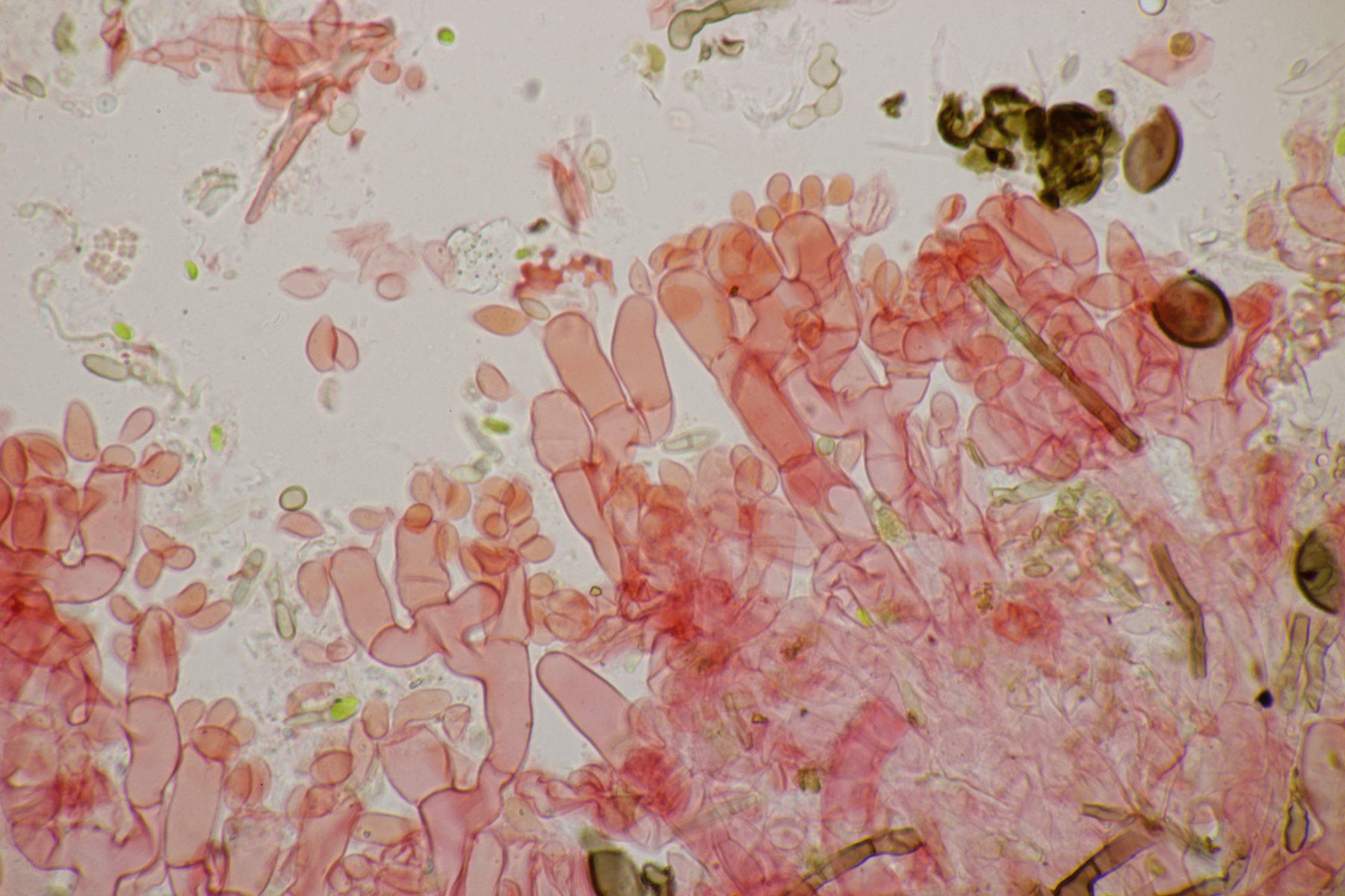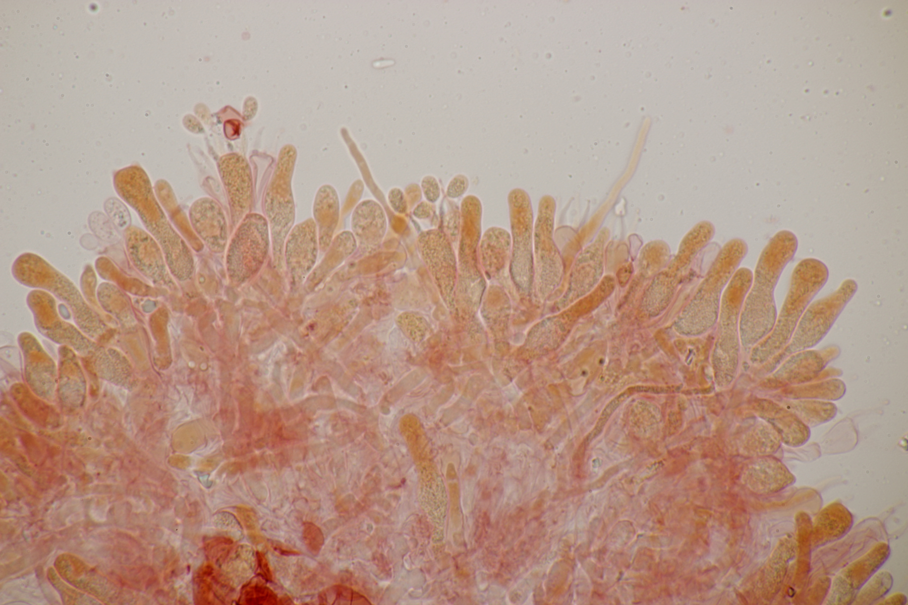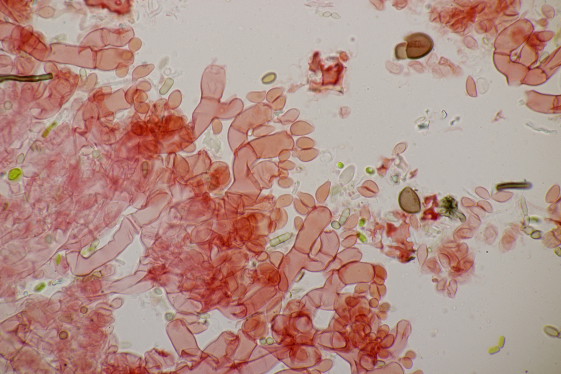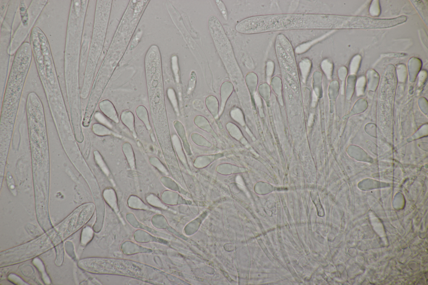 5. Daneben war aber noch ein Rindenpilz mit auf dem Stück Holz, der deutlich absporfreundlicher war. Sporenmaße (8.5+-0.6) µm x (5.0+-0.3) µm, Q=1.7+-0.1 bzw. (7.8-9.8) µm x (4.4-5.4) µm, Q=1.6-1.9, Schnallen vorhanden, Basidien 4-sporig, dazu nicht inkrustierte, lange Zystiden. Die Basidien würde ich tendentiell für suburniform halten und dann bei Hyphoderma schlüsseln, wo ich dann bei H. obtusum lande. Was meint ihr?
